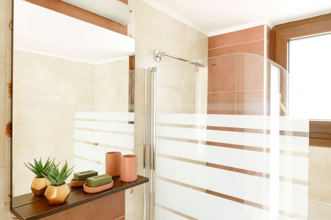 On the ground floor, you’ll find a welcoming living area with a fully equipped kitchen featuring brand-new, modern furnishings. The comfortable sofa and TV create a cosy indoor space, while large doors open onto a spacious terrace with outdoor furniture — ideal for morning coffee or enjoying meals with sweeping sea views. A convenient WC is also located on this level.