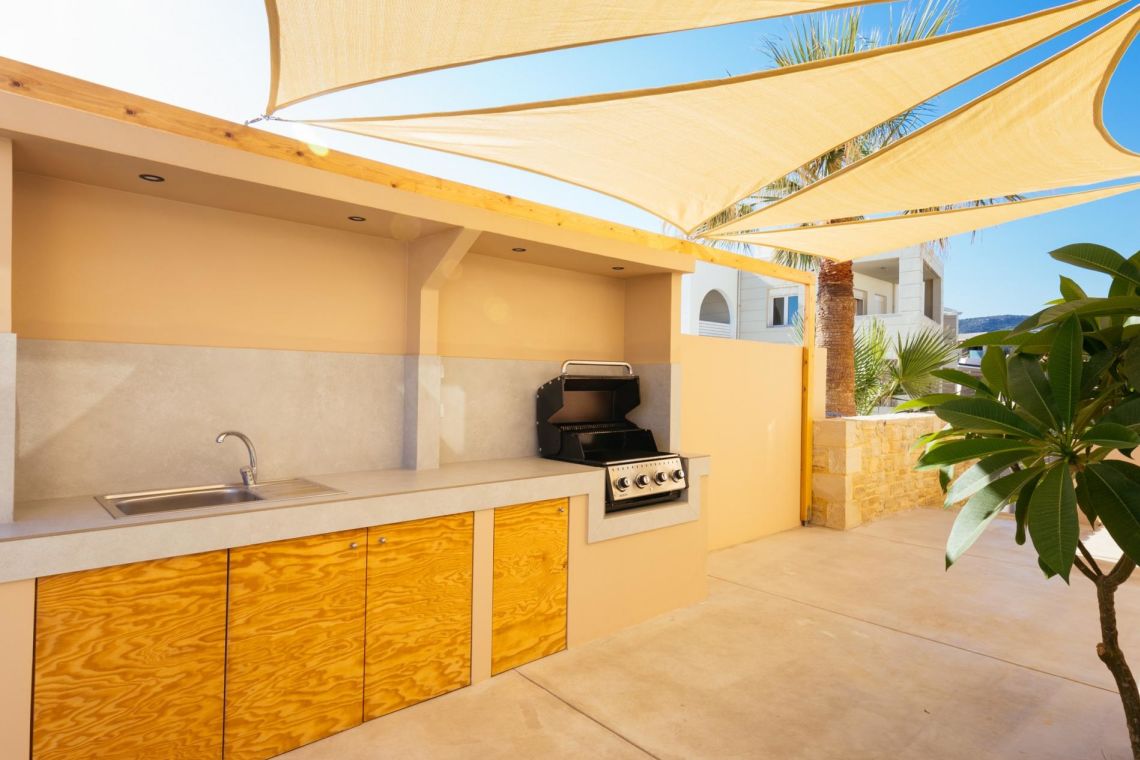 The outdoor areas of Villa Aiva are designed to impress. The villa is surrounded by beautifully kept gardens with lawn, panoramic terraces, and direct access to the sandy beach right in front of the property.