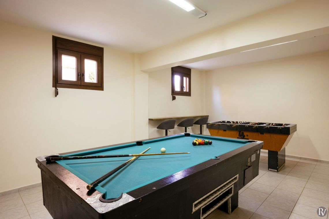 Large patio doors open directly onto the poolside terraces, seamlessly connecting the interior with the outdoor areas and offering stunning views of the sea and unforgettable sunsets. The villa also includes a games room on the lower floor with a billiards table and table football, providing great entertainment for younger guests.