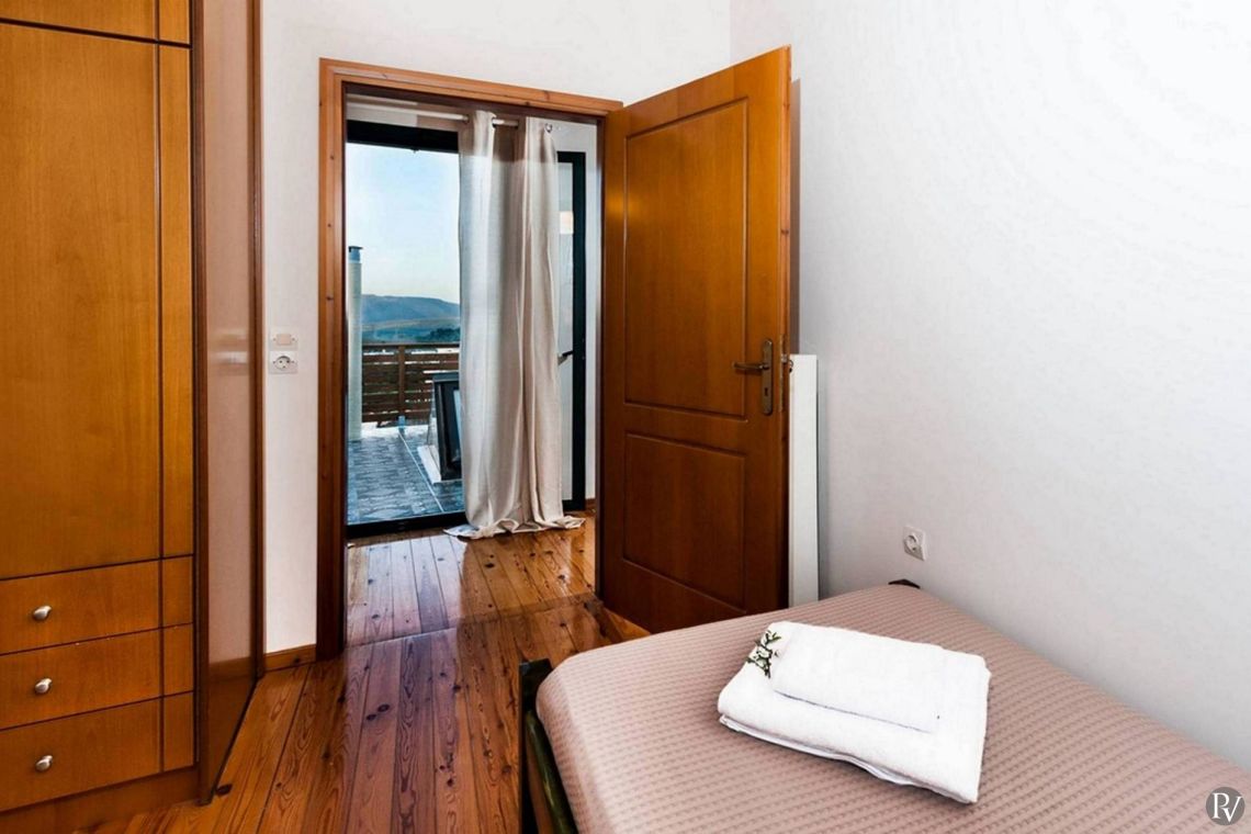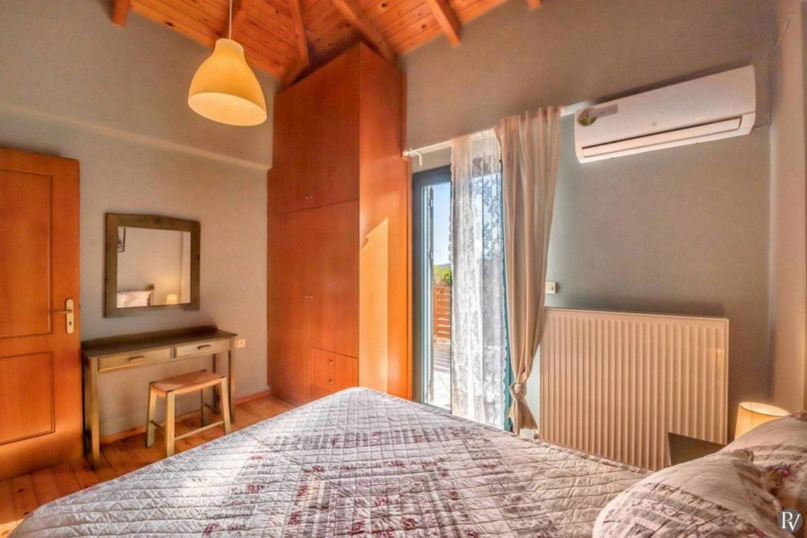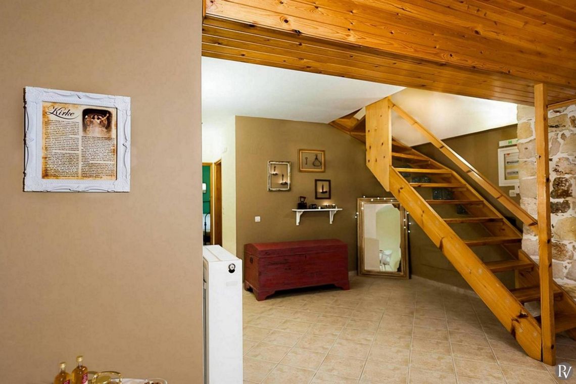 Villa Zesti is arranged over two floors, combining traditional charm with modern functionality. The spacious living room features soft seating, a fireplace, and large windows that fill the space with natural light, creating a warm and homely atmosphere. The fully equipped kitchen opens onto a dining area, perfect for relaxed family meals or gatherings with friends.