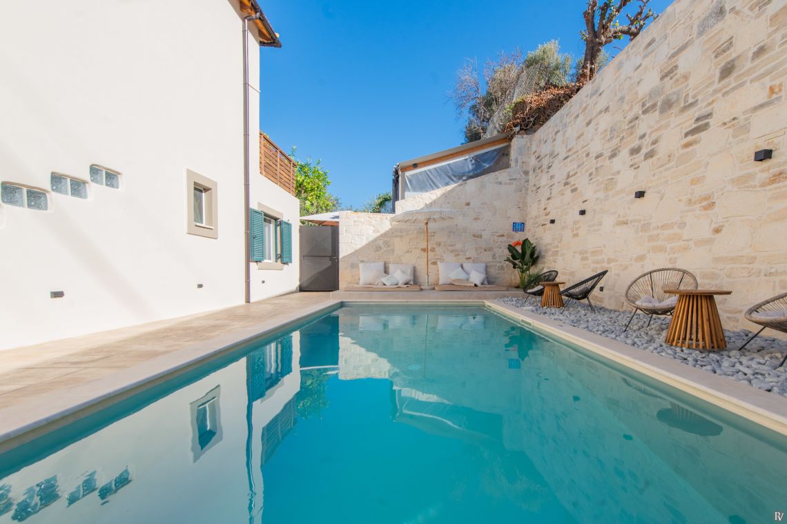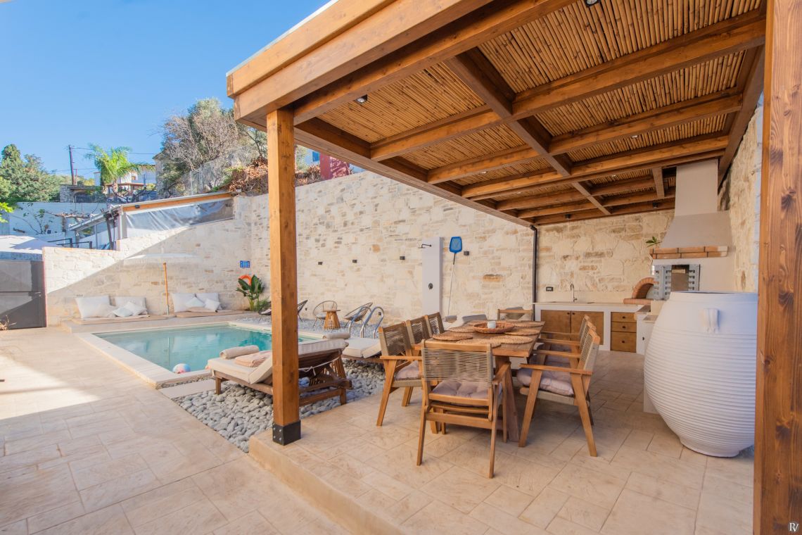 The outdoor areas of Villa Zesti are perfect for relaxation and enjoying the Cretan lifestyle. The private pool is surrounded by a sunny terrace equipped with loungers, ideal for soaking up the sun or taking a refreshing dip.
