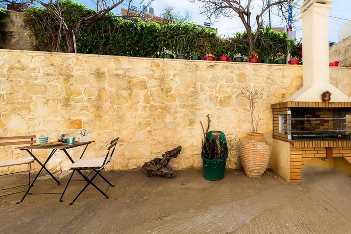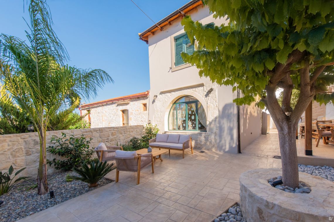 A shaded courtyard with a leafy tree and a stone-built barbecue provides a charming space for alfresco dining. The villa’s peaceful surroundings and rustic gardens make it easy to unwind, while local tavernas, shops, and the beaches of Kalyves and Almyrida are just a short drive away.