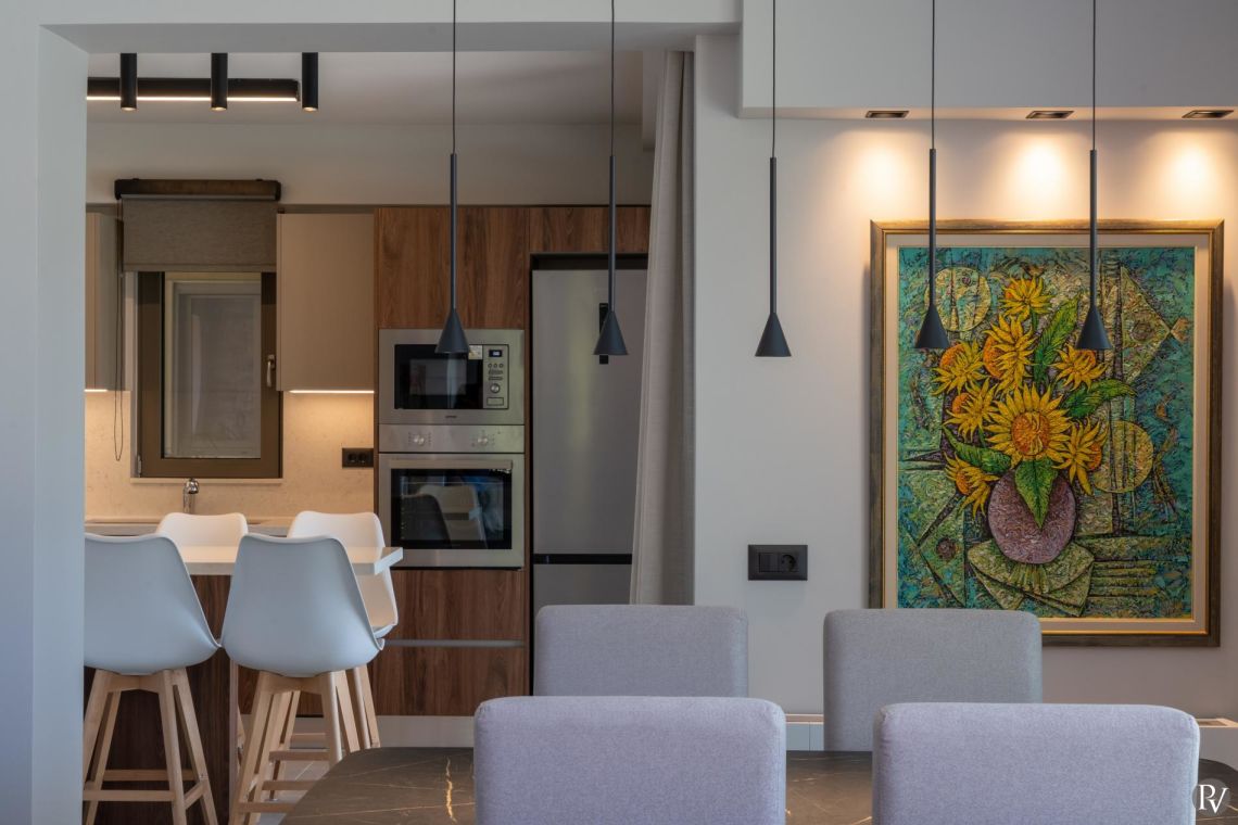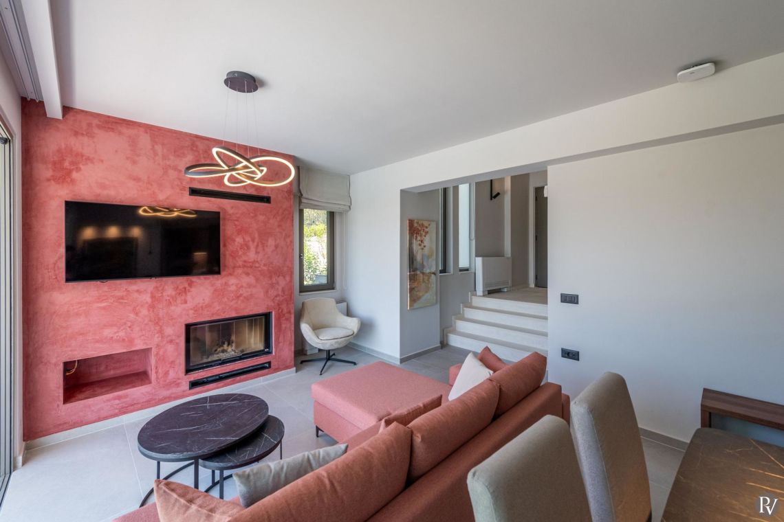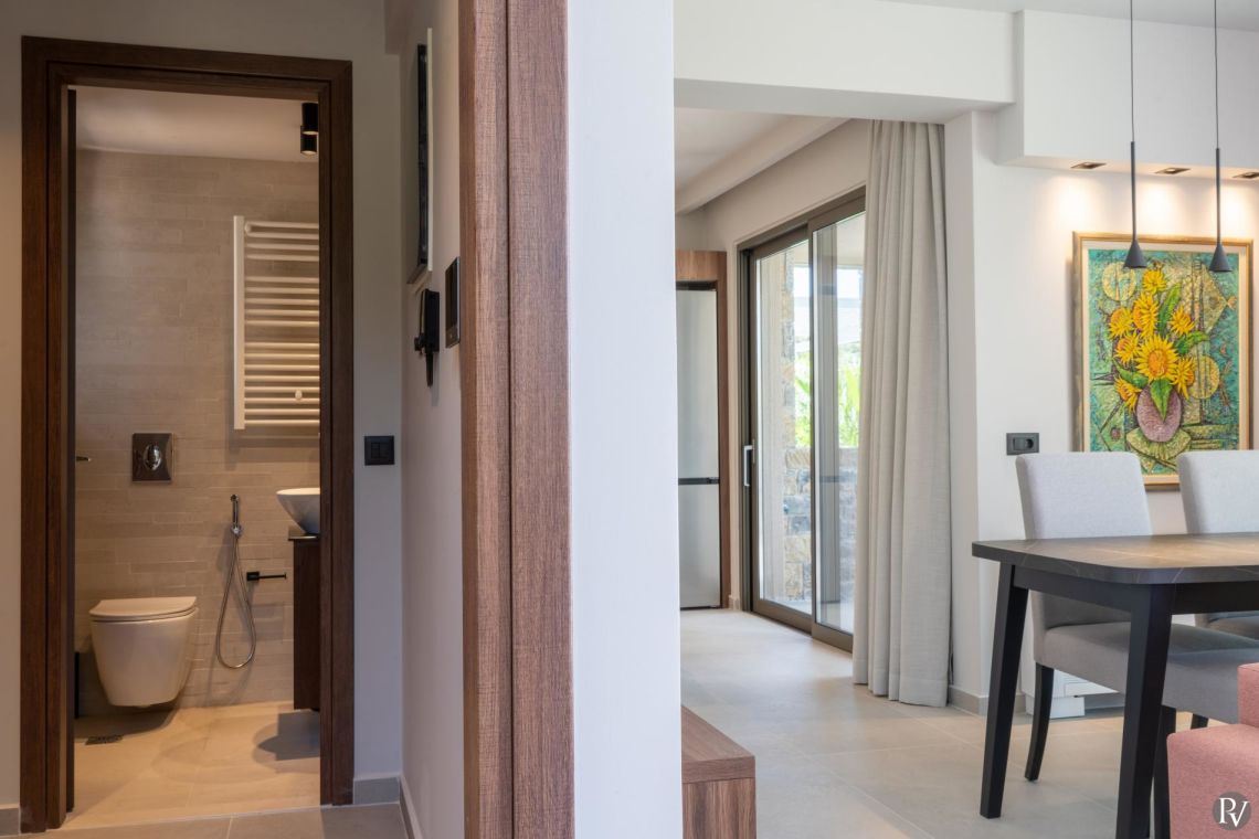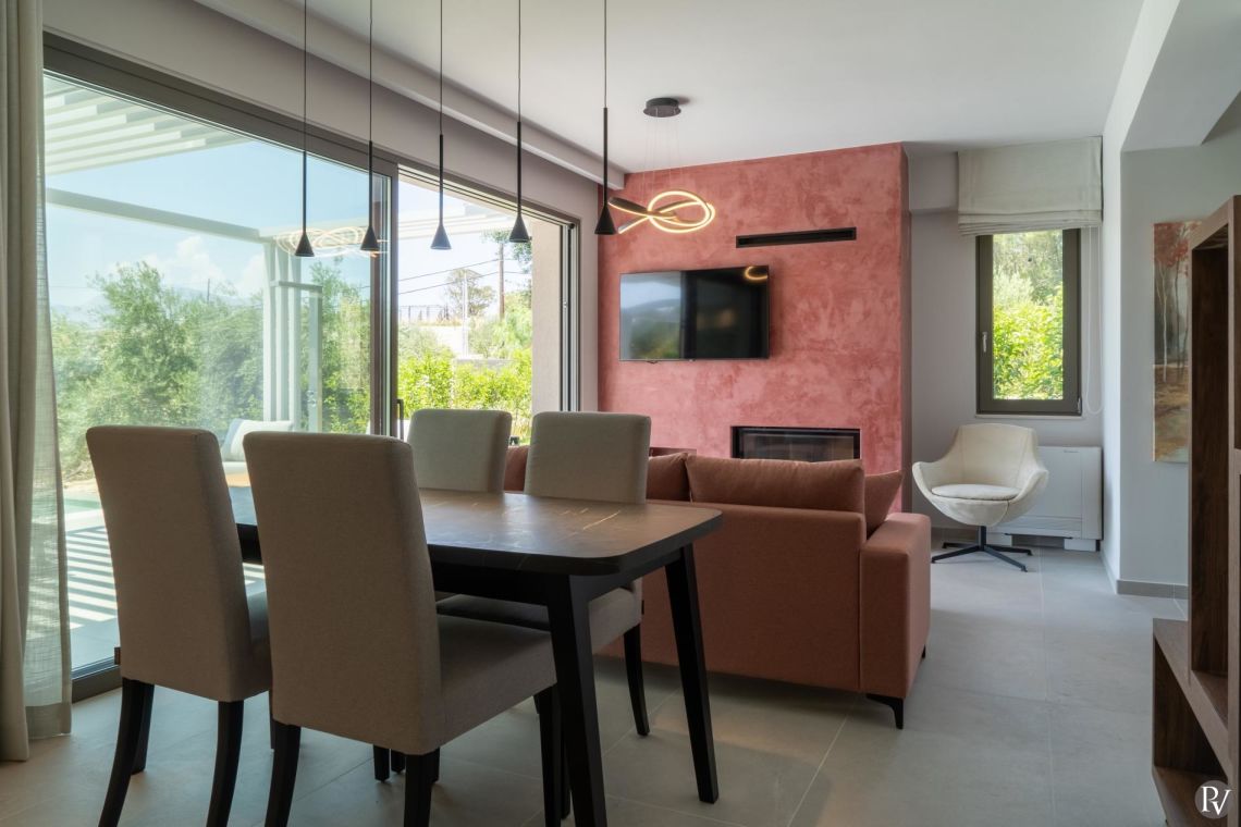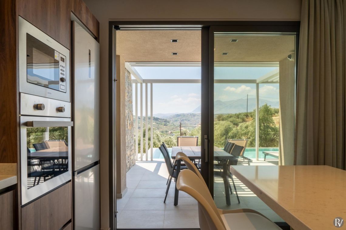 The villa features a bright, open-plan living space elegantly furnished with modern décor and large windows framing the surrounding countryside. The fully equipped kitchen includes everything needed for home-style cooking, while the dining area provides a comfortable space for shared meals indoors. Guests can also enjoy dining al fresco on the spacious terrace overlooking the landscape. A guest WC is conveniently located on the ground floor.