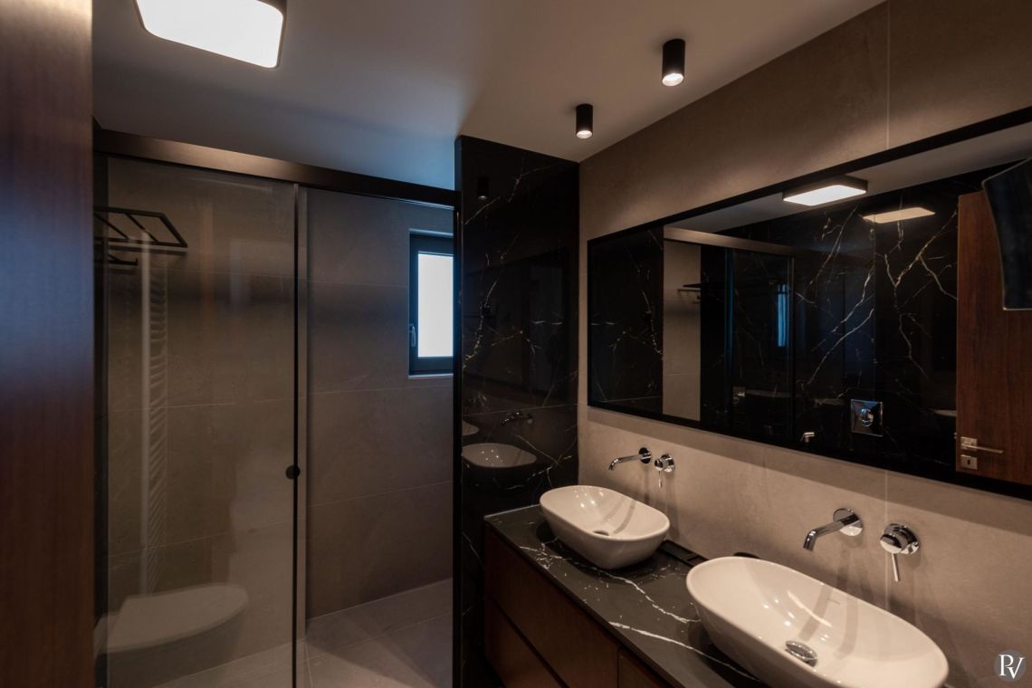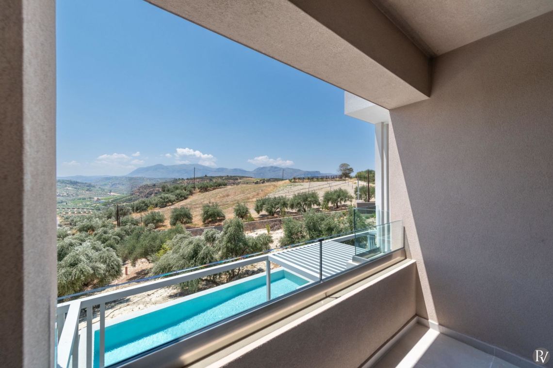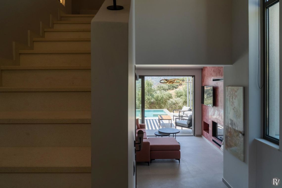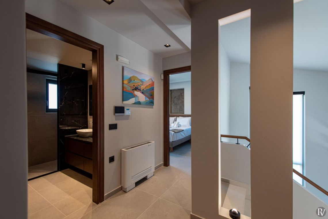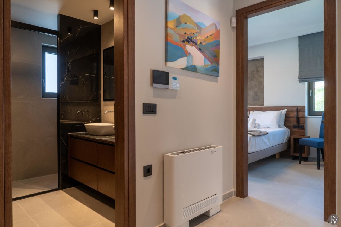 Upstairs, Villa Vasiliki offers two beautifully appointed bedrooms, each featuring twin beds and access to a private balcony with stunning open countryside views. The bedrooms share a modern bathroom, providing a comfortable and restful environment for all guests.