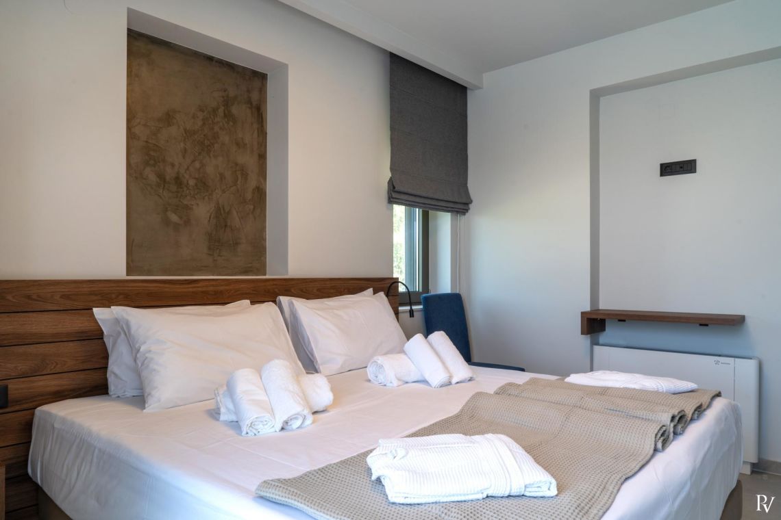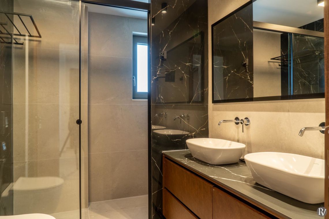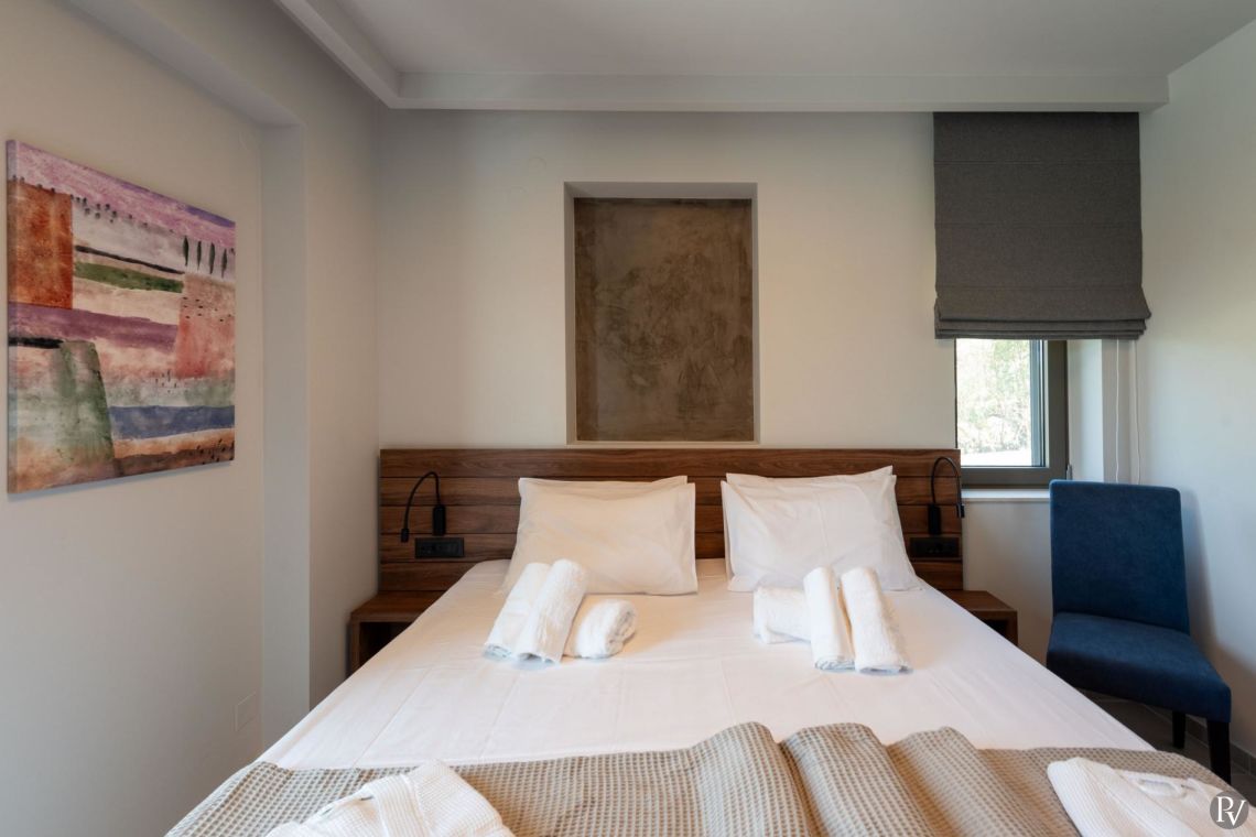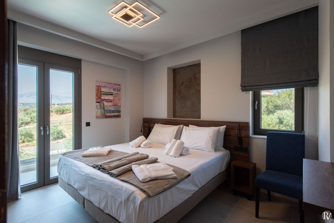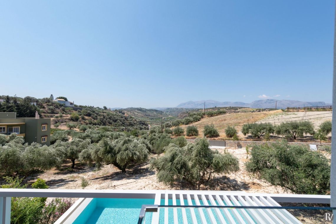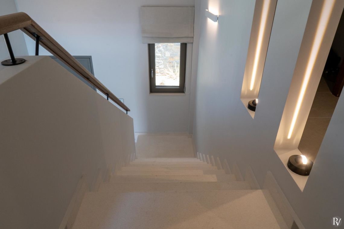 Upstairs, Villa Vasiliki offers two beautifully appointed bedrooms, each featuring twin beds and access to a private balcony with stunning open countryside views. The bedrooms share a modern bathroom, providing a comfortable and restful environment for all guests.