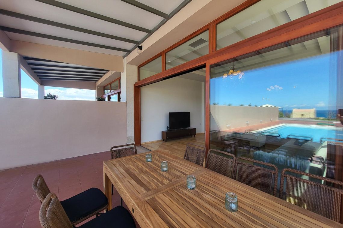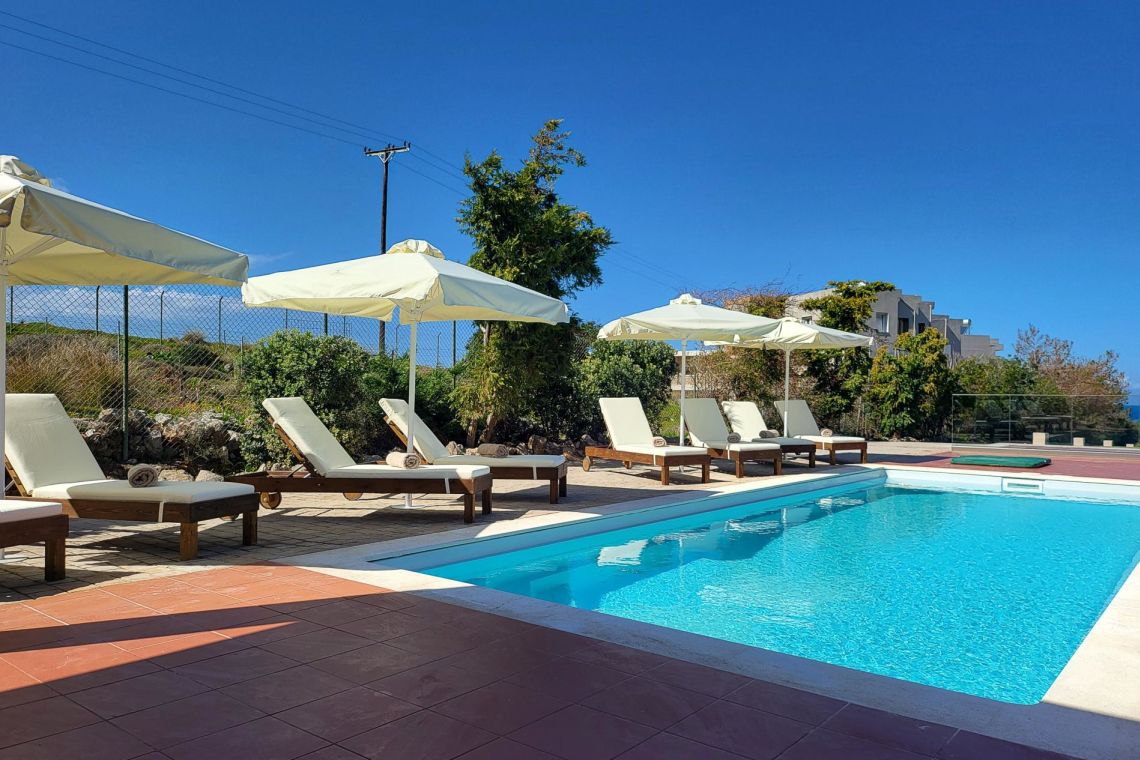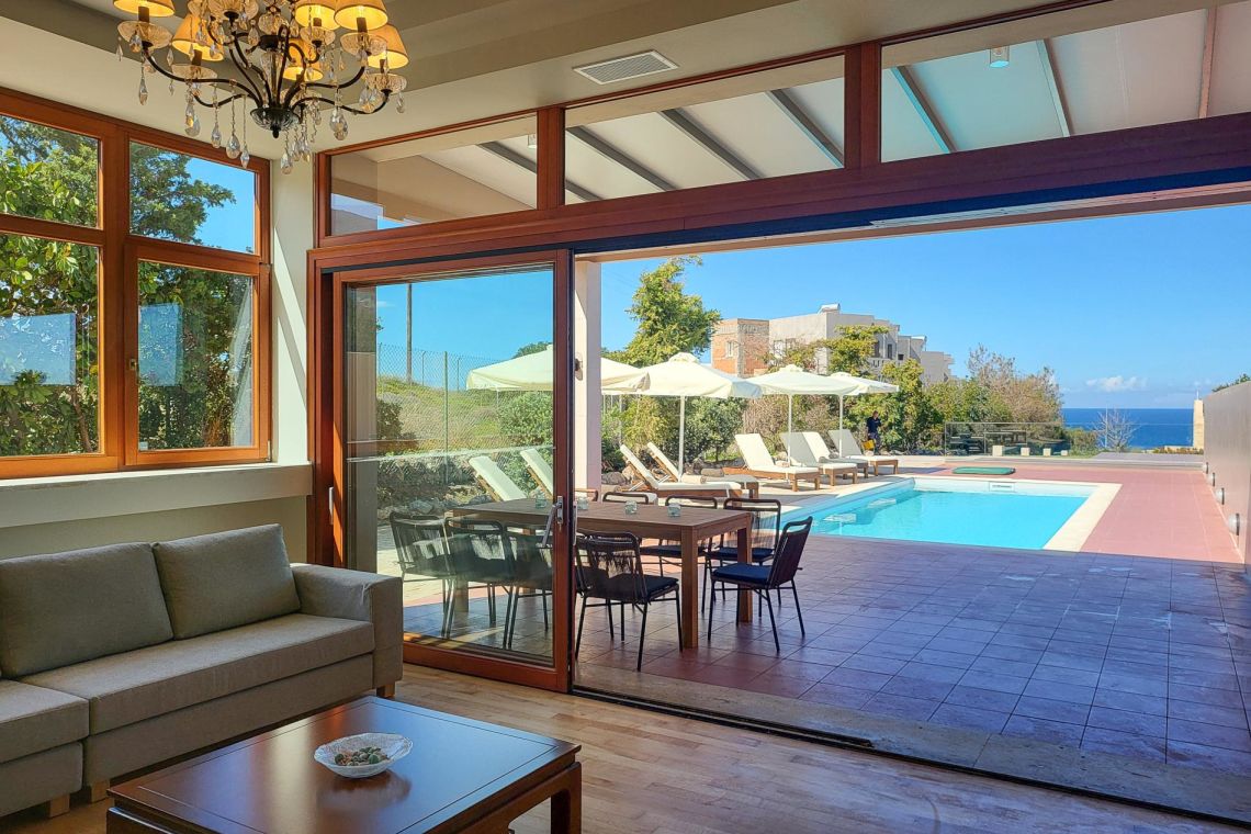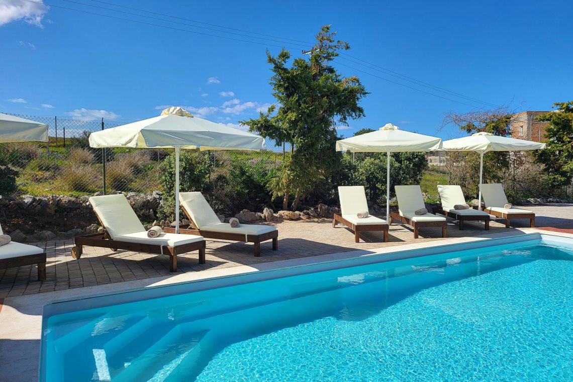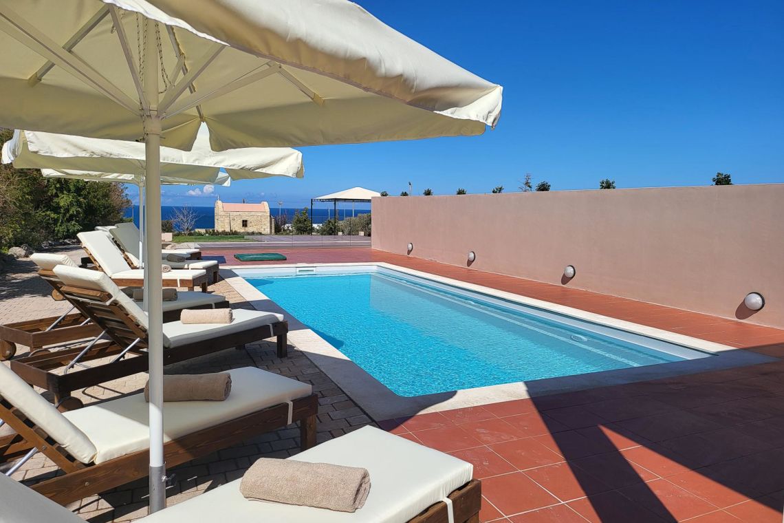 The villa sits on a spacious 1,000 m² private plot, offering plenty of outdoor space for relaxation. The highlight is the private swimming pool, surrounded by sunbeds where guests can unwind and soak up the Cretan sunshine.