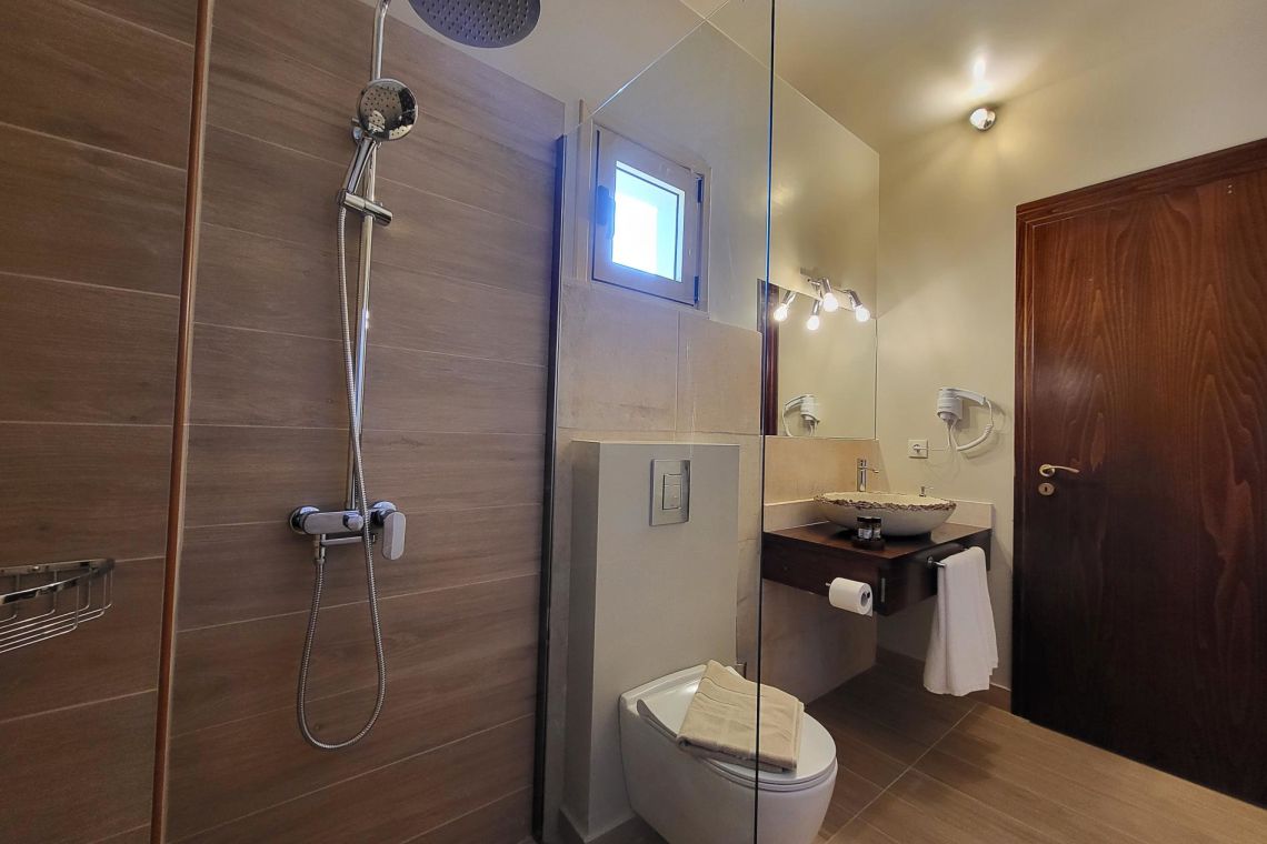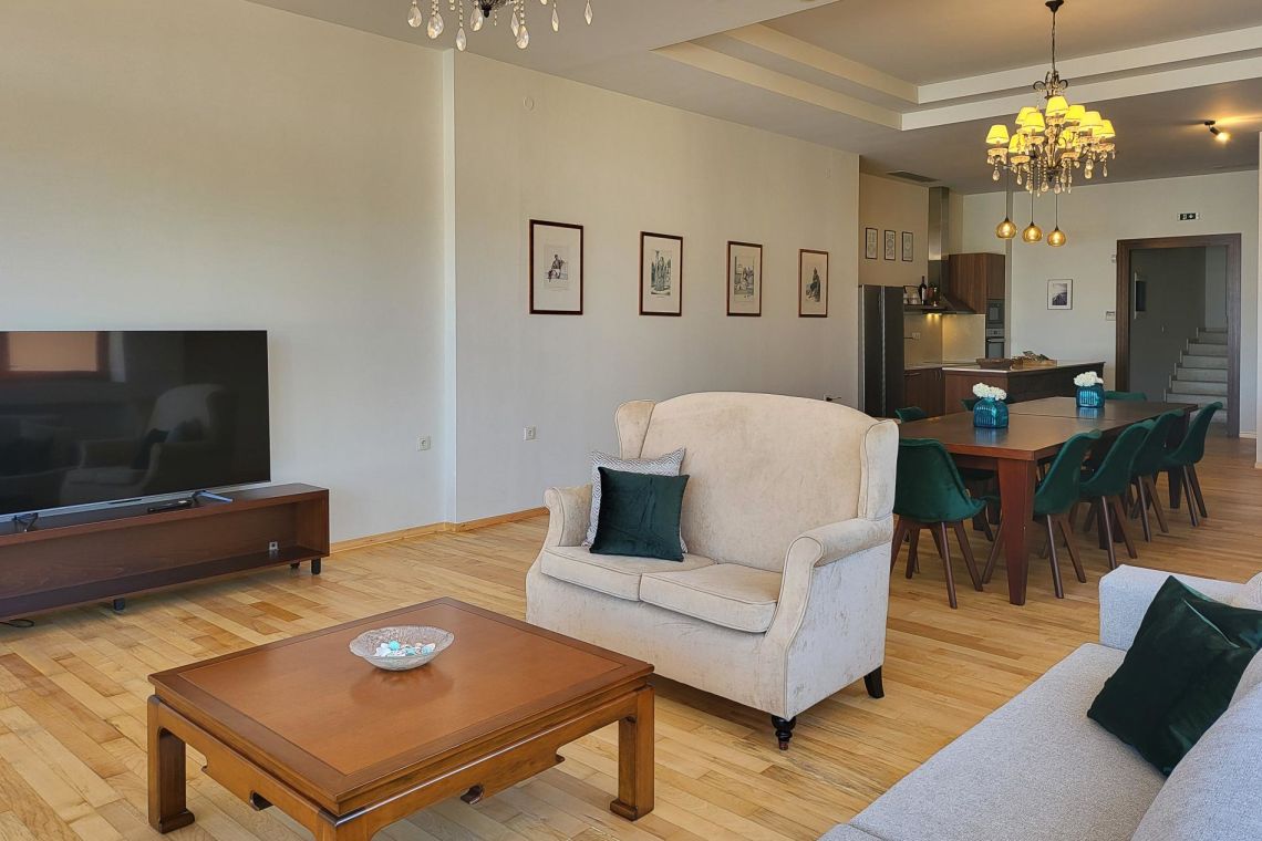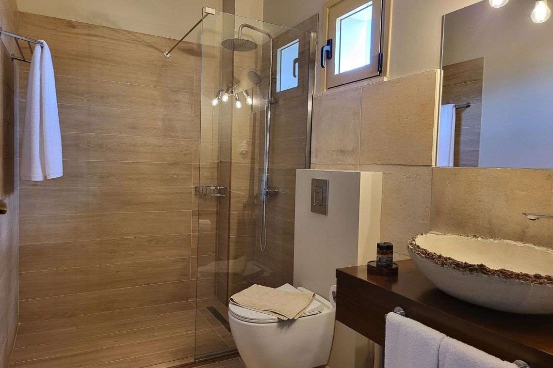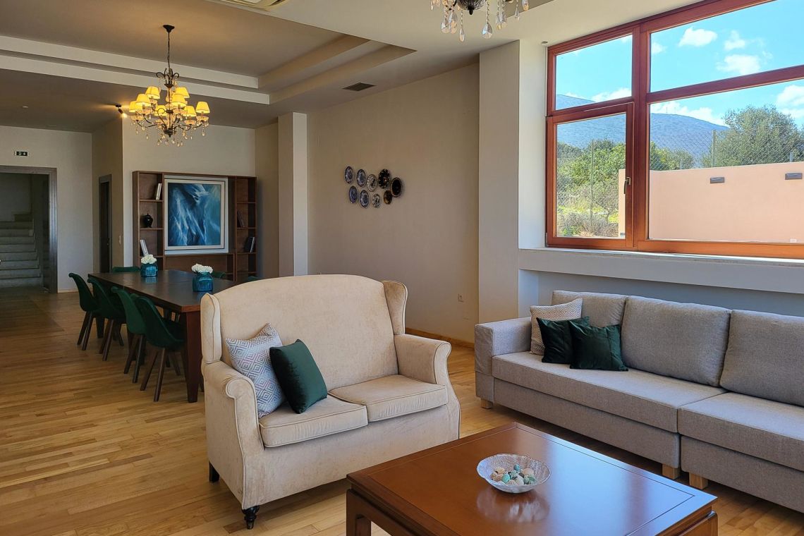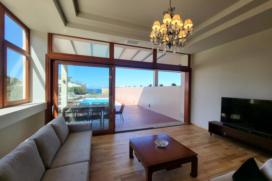 Spanning 220 m², Luxury Villa Mykal offers bright and stylish living spaces designed for comfort and relaxation. The spacious living room features plush sofas and beautiful sea views, creating a welcoming environment for unwinding after a day exploring the island.