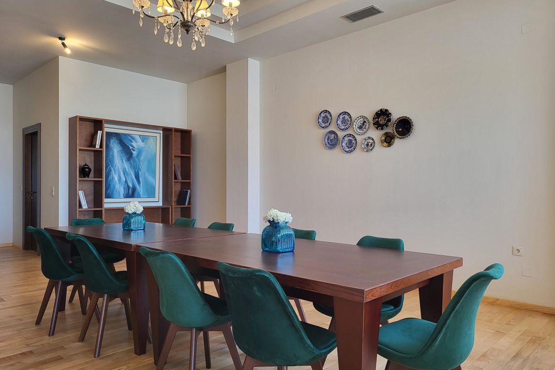 Adjacent to the lounge is a large dining area with seating for more than eight guests, perfect for enjoying meals together. Large doors open directly onto the pool terrace, allowing natural light to fill the space and creating a seamless indoor-outdoor living experience.