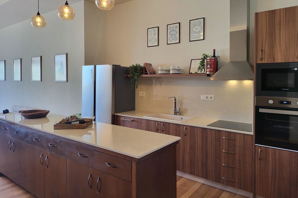 The fully equipped kitchen includes modern appliances along with both a filter coffee machine and espresso machine, making it easy to prepare meals and drinks at any time. The ground floor also includes a bathroom with a shower and washing machine for added convenience.