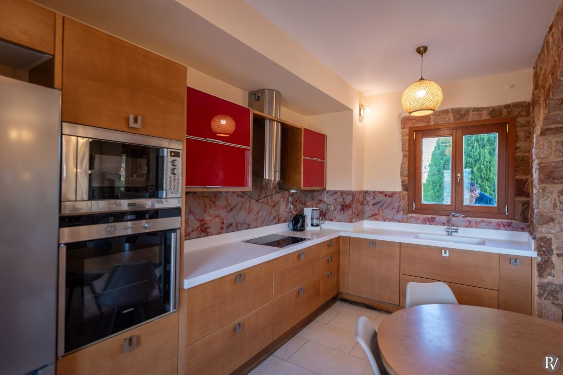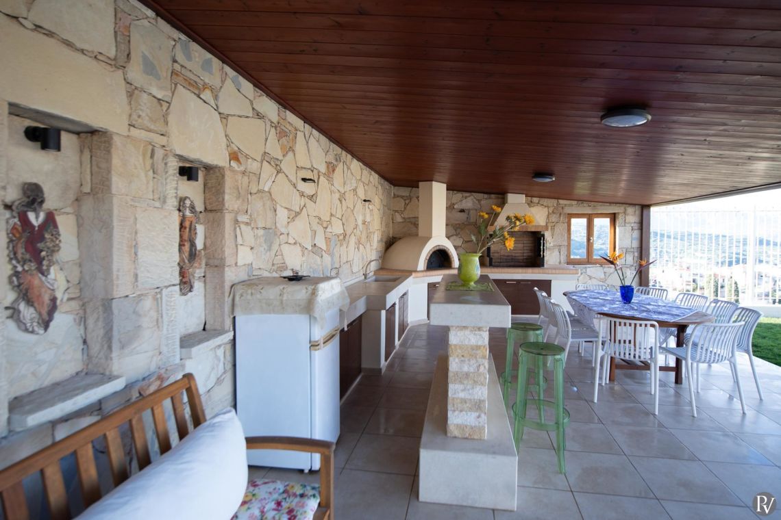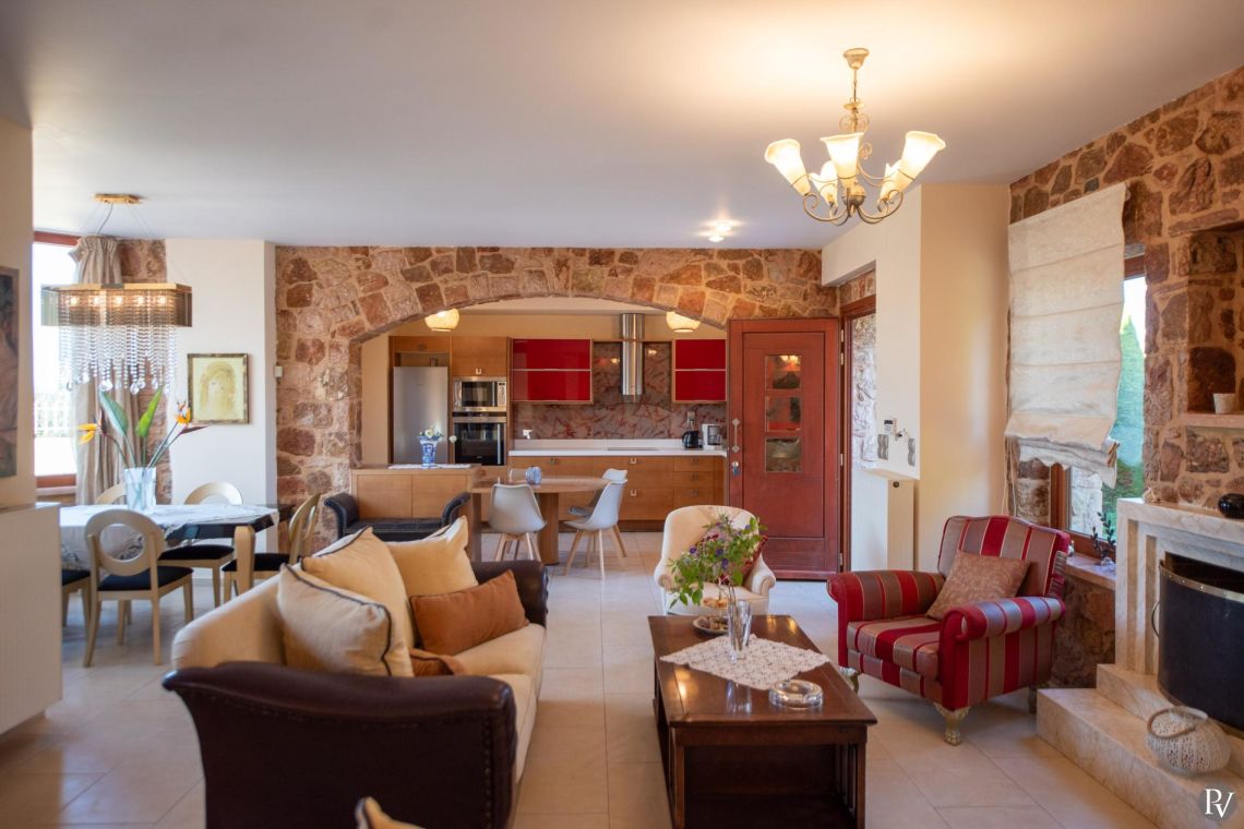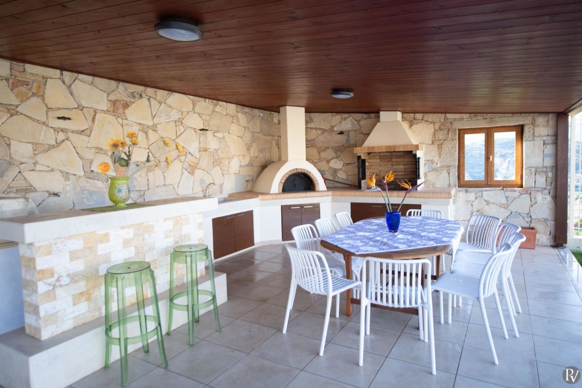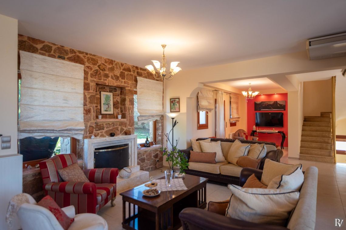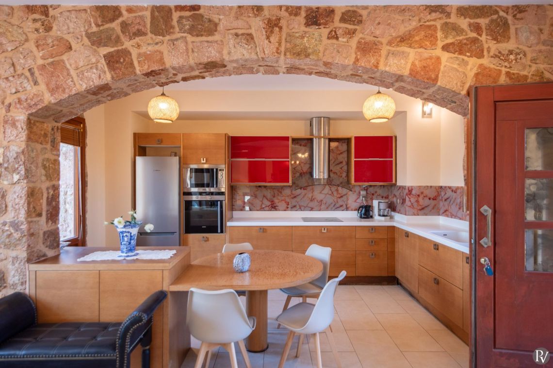 The villa accommodates up to 10 guests across five bedrooms and three bathrooms (two with showers and one with a bathtub). Inside, traditional stone walls and warm décor create a welcoming, cosy atmosphere, while the fully equipped open plan kitchen flows seamlessly into a bright dining area. The comfortable living room, complete with a fireplace and Smart TV, provides the perfect setting for relaxed evenings.