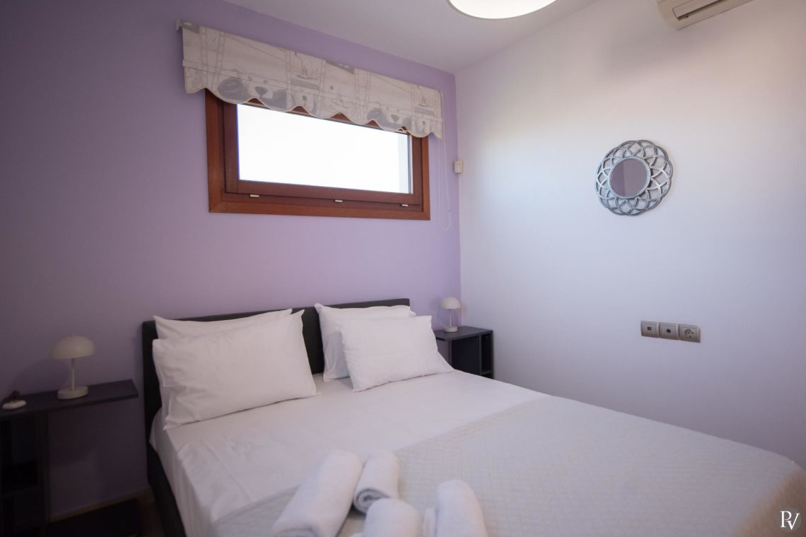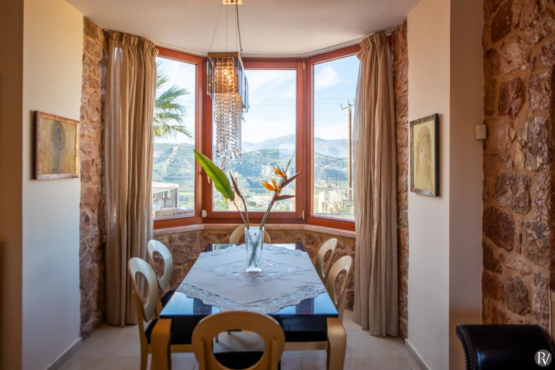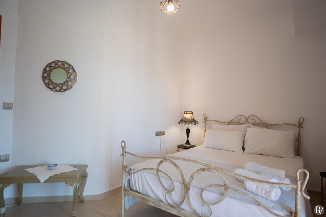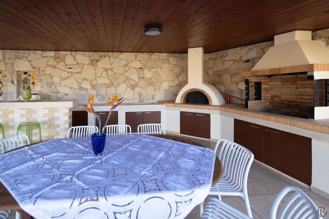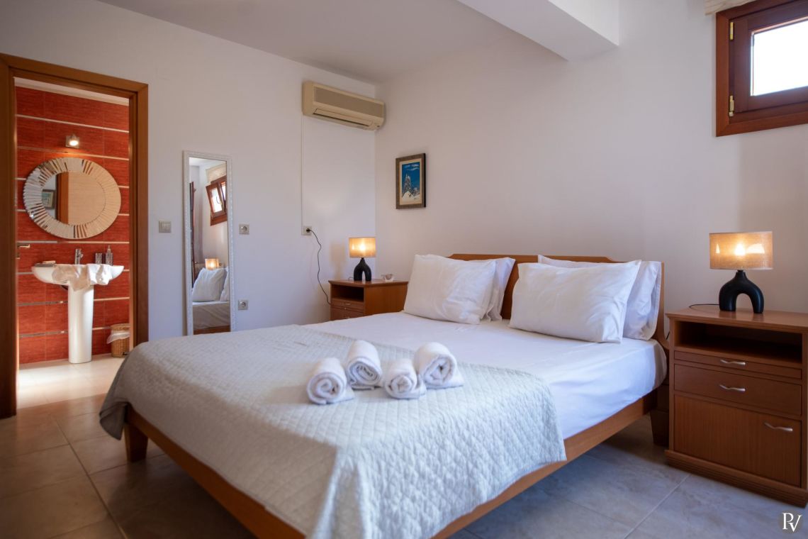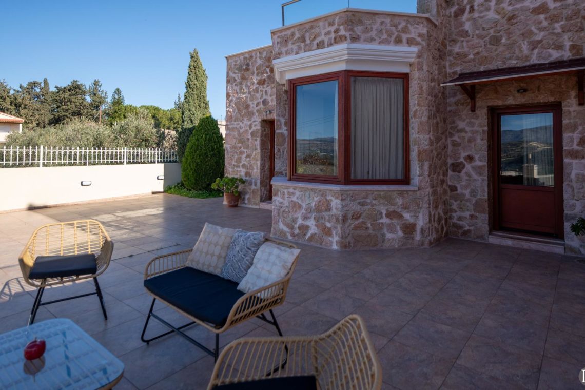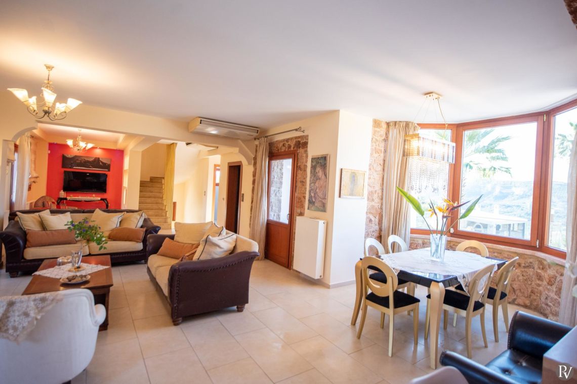 The villa accommodates up to 10 guests across five bedrooms and three bathrooms (two with showers and one with a bathtub). Inside, traditional stone walls and warm décor create a welcoming, cosy atmosphere, while the fully equipped open plan kitchen flows seamlessly into a bright dining area. The comfortable living room, complete with a fireplace and Smart TV, provides the perfect setting for relaxed evenings.
