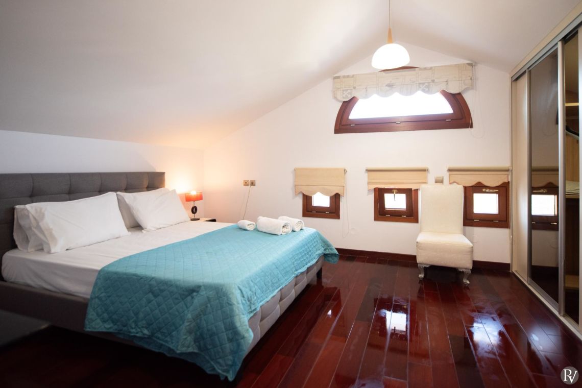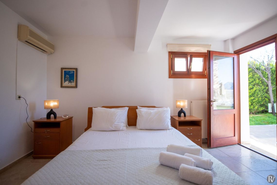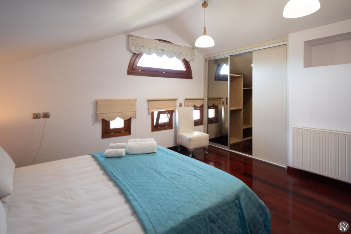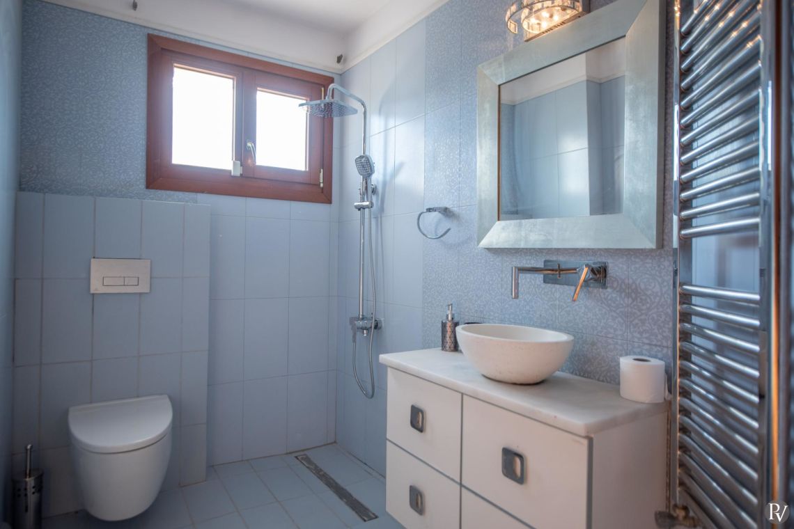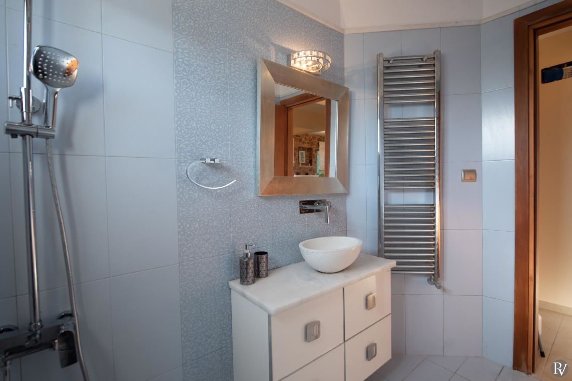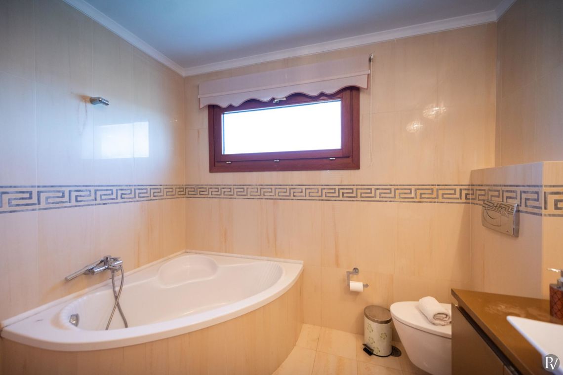 The villa accommodates up to 10 guests across five bedrooms and three bathrooms (two with showers and one with a bathtub). Inside, traditional stone walls and warm décor create a welcoming, cosy atmosphere, while the fully equipped open plan kitchen flows seamlessly into a bright dining area. The comfortable living room, complete with a fireplace and Smart TV, provides the perfect setting for relaxed evenings.