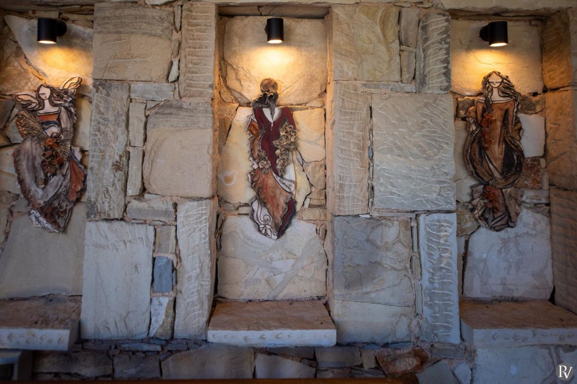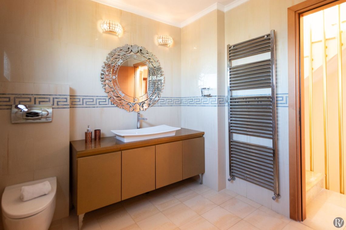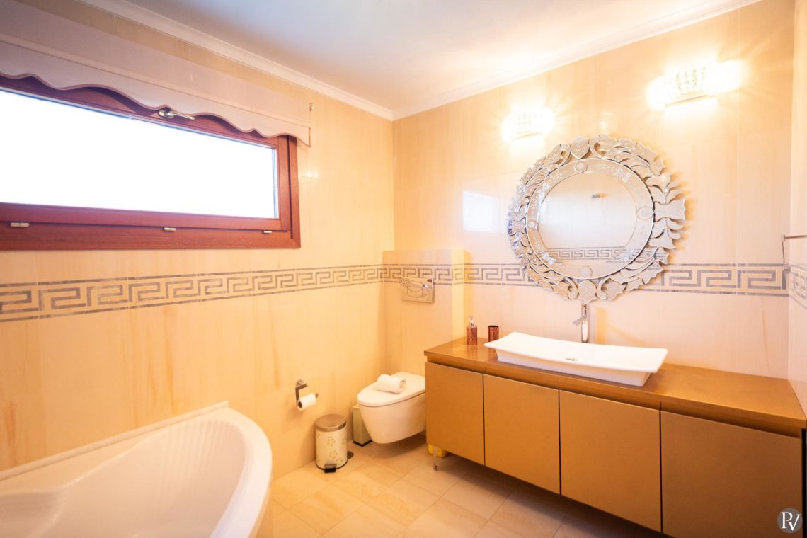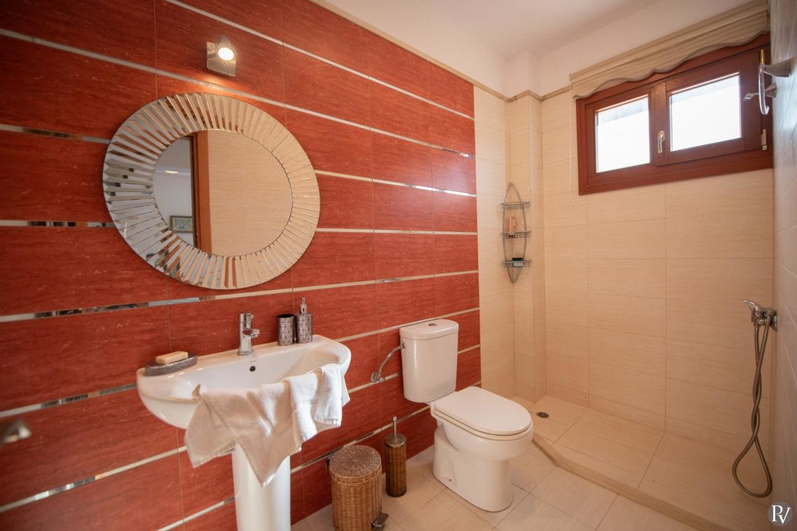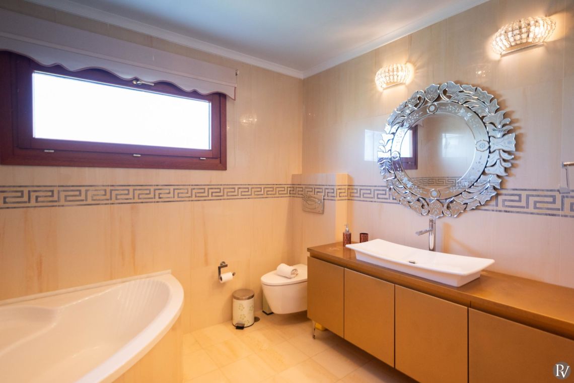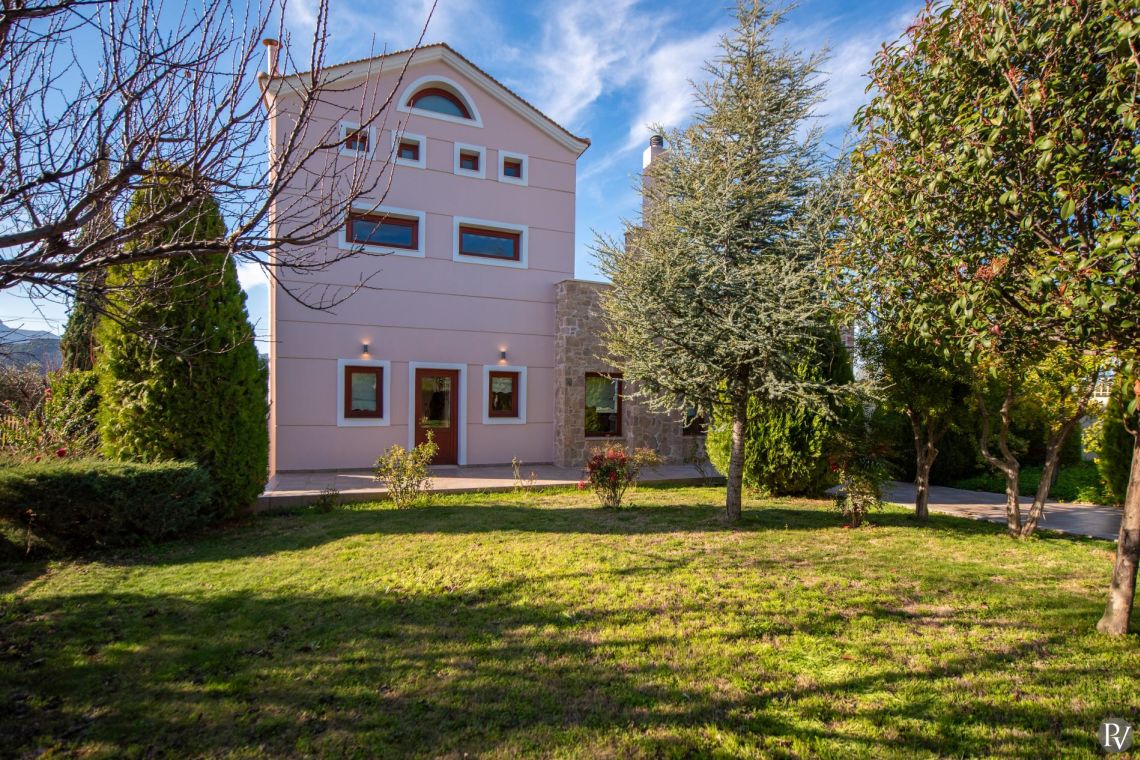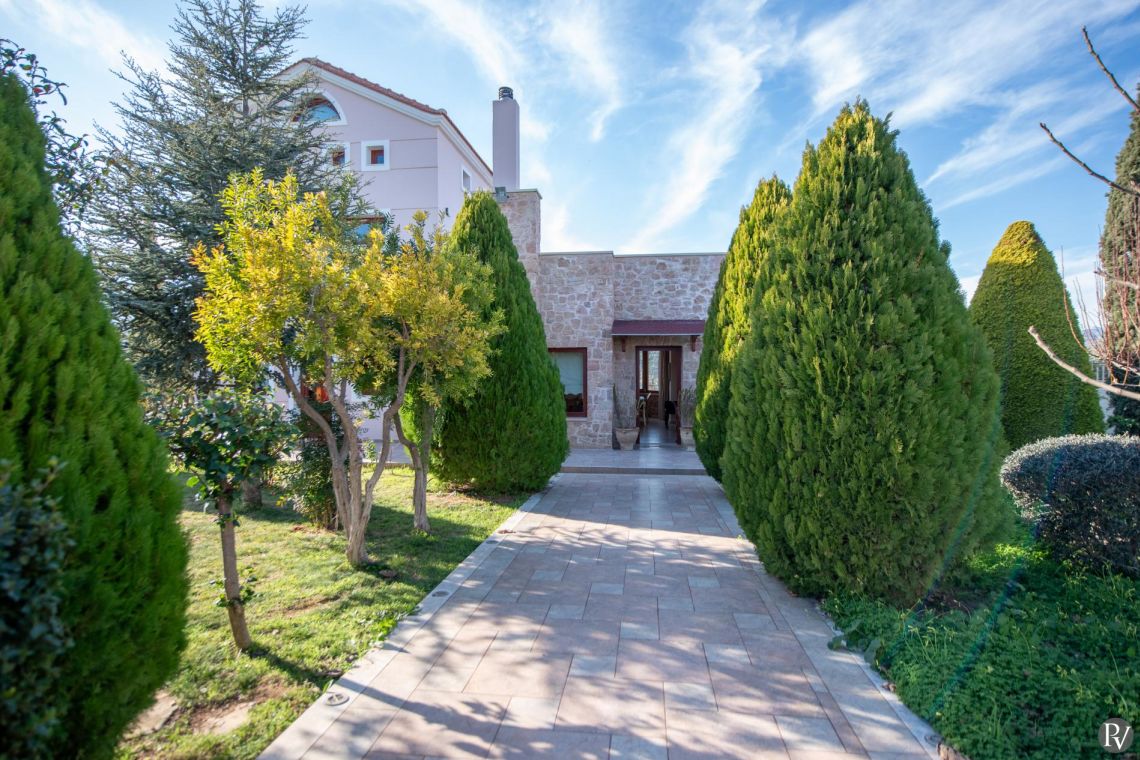 The villa accommodates up to 10 guests across five bedrooms and three bathrooms (two with showers and one with a bathtub). Inside, traditional stone walls and warm décor create a welcoming, cosy atmosphere, while the fully equipped open plan kitchen flows seamlessly into a bright dining area. The comfortable living room, complete with a fireplace and Smart TV, provides the perfect setting for relaxed evenings.