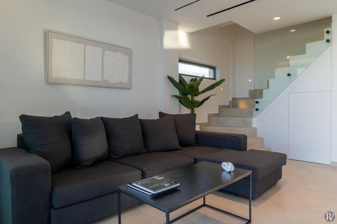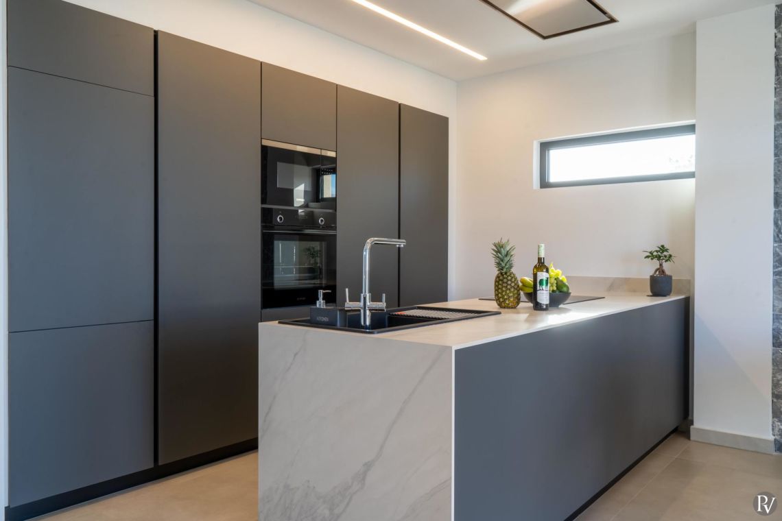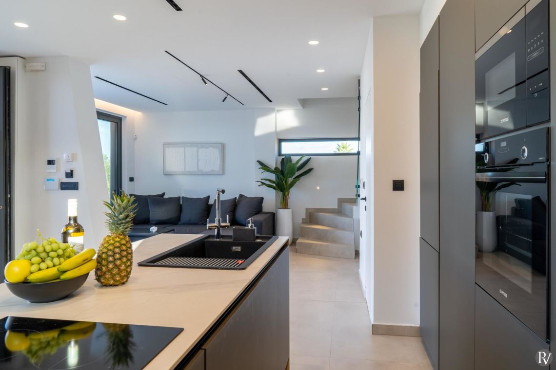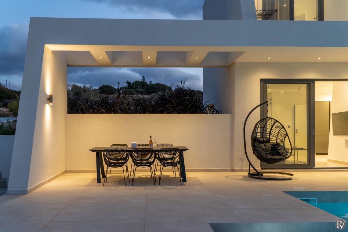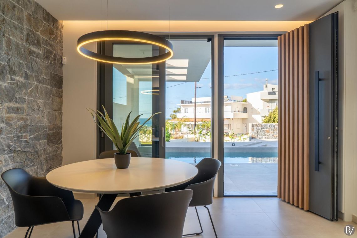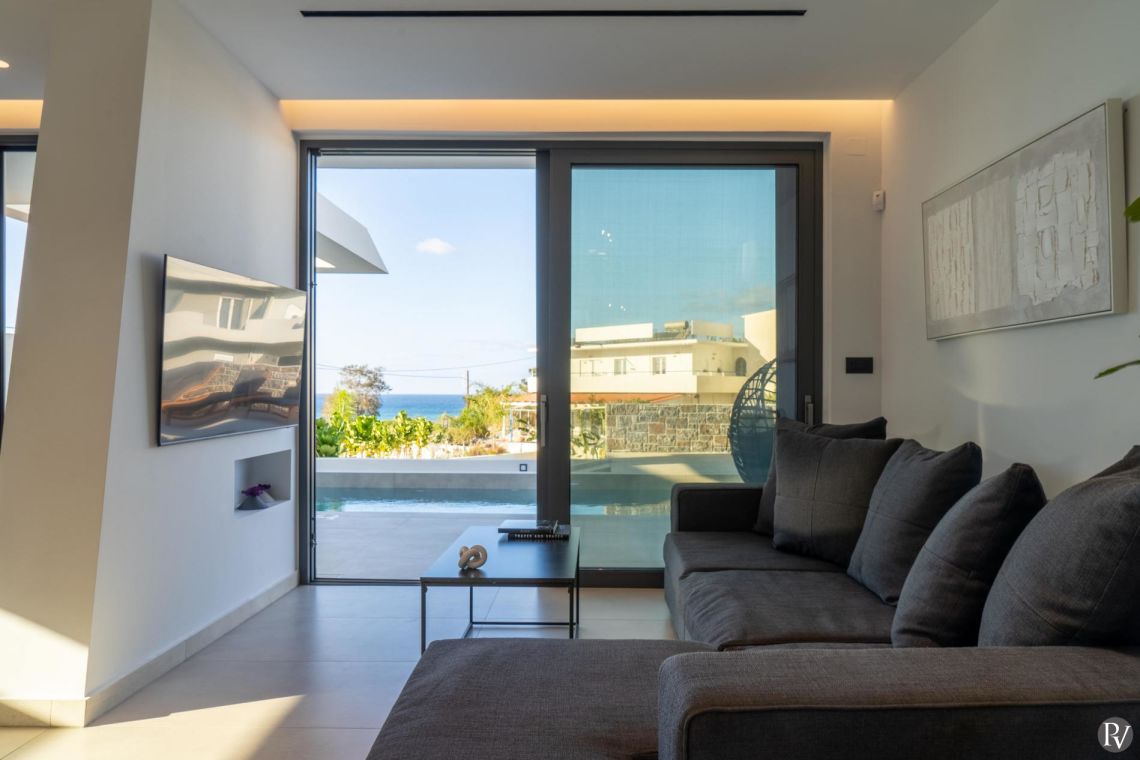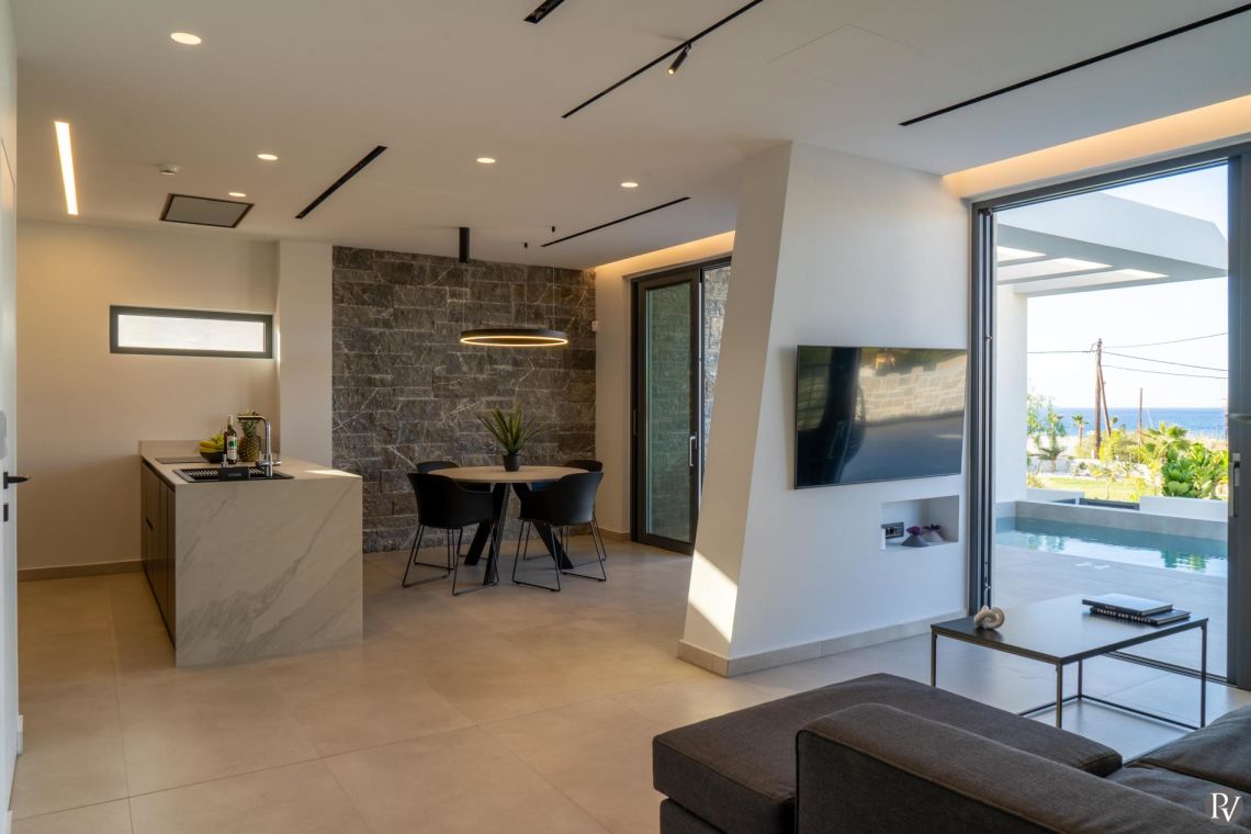 The interiors of Villa Anissaras are sleek, contemporary, and thoughtfully designed. A minimal colour palette and modern furnishings create a calm and elegant atmosphere throughout. The open-plan living area is filled with natural light thanks to large windows overlooking the pool and garden, and features a comfortable sofa and flat-screen TV for relaxed evenings indoors.
