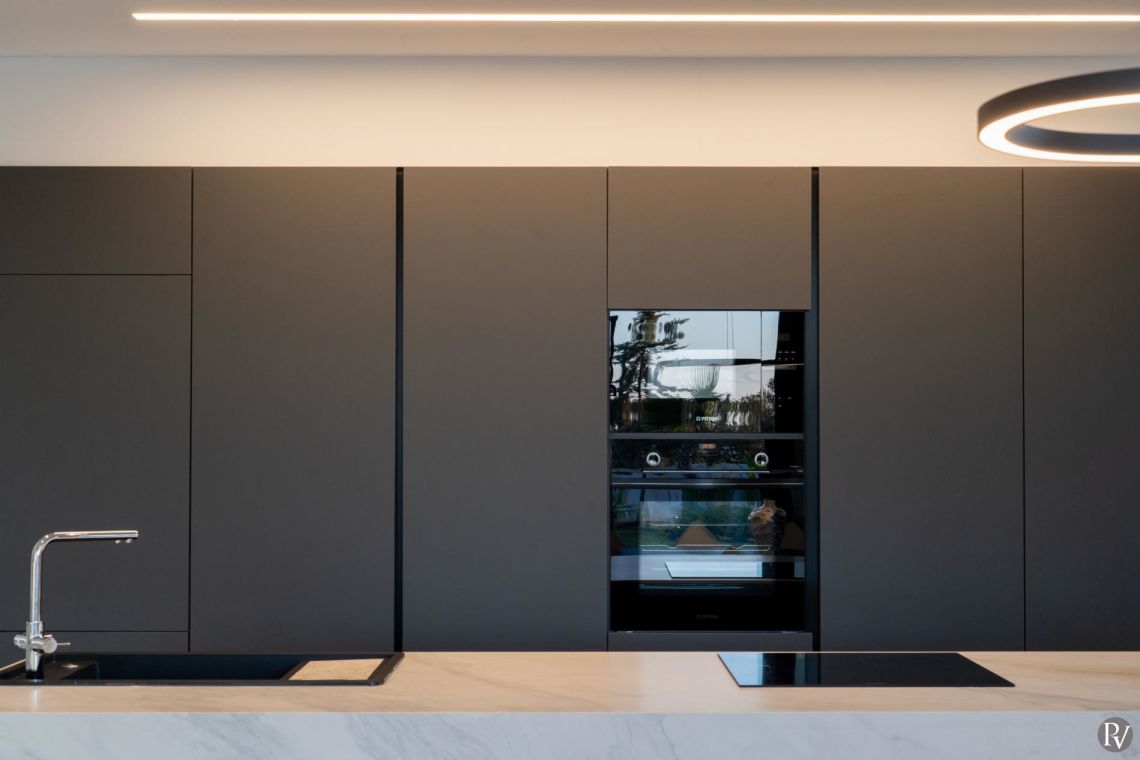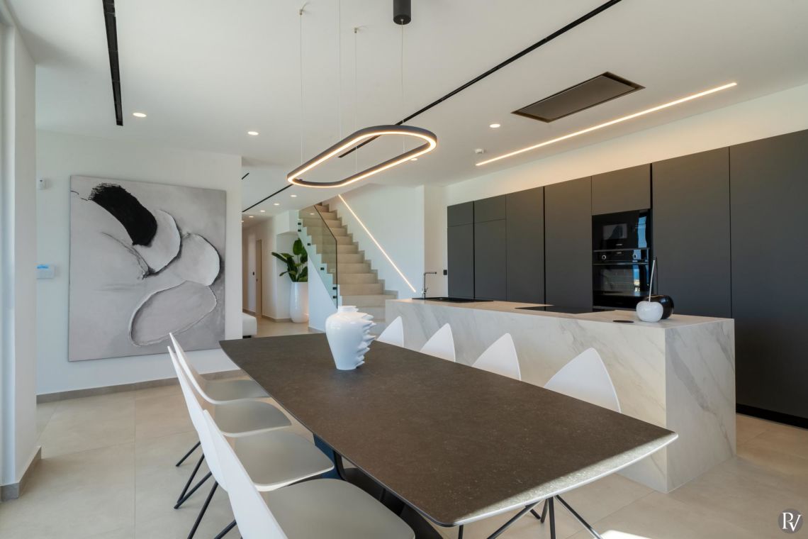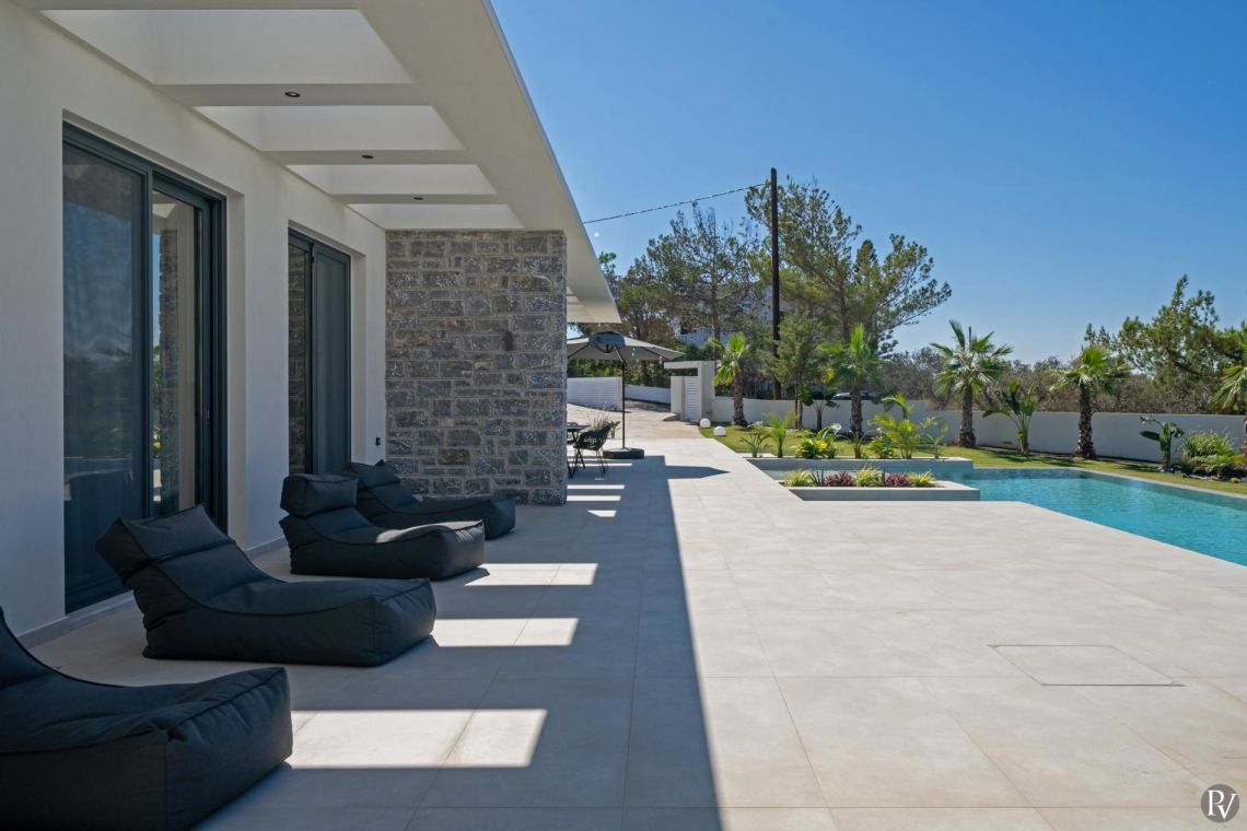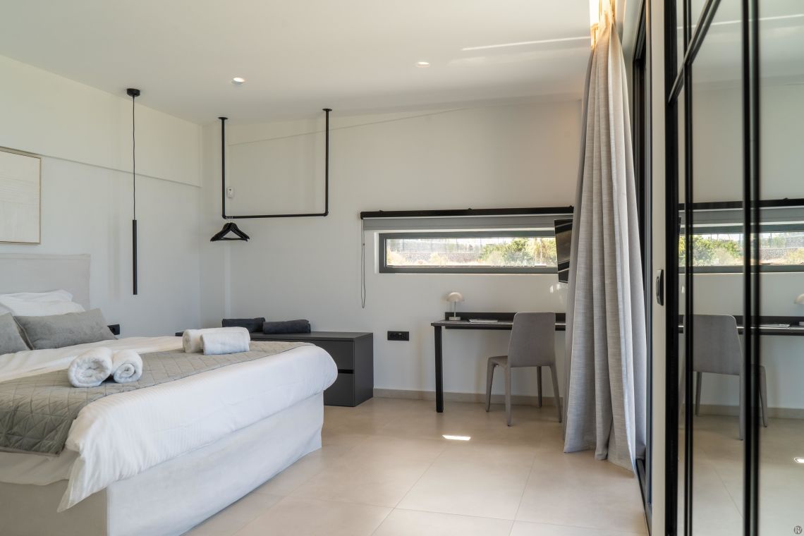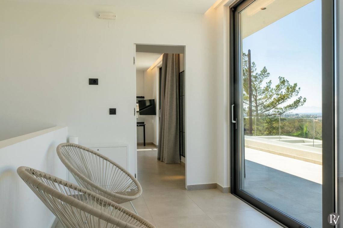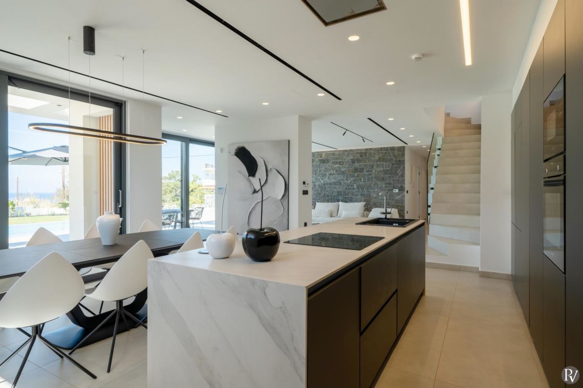 The interiors of Villa Anthos are modern and minimalist, flooded with natural light and designed for effortless living. The open-plan layout seamlessly connects the living room, dining area, and fully equipped kitchen. The dining area seats ten guests, while the kitchen features high-end appliances ideal for both everyday meals and entertaining.