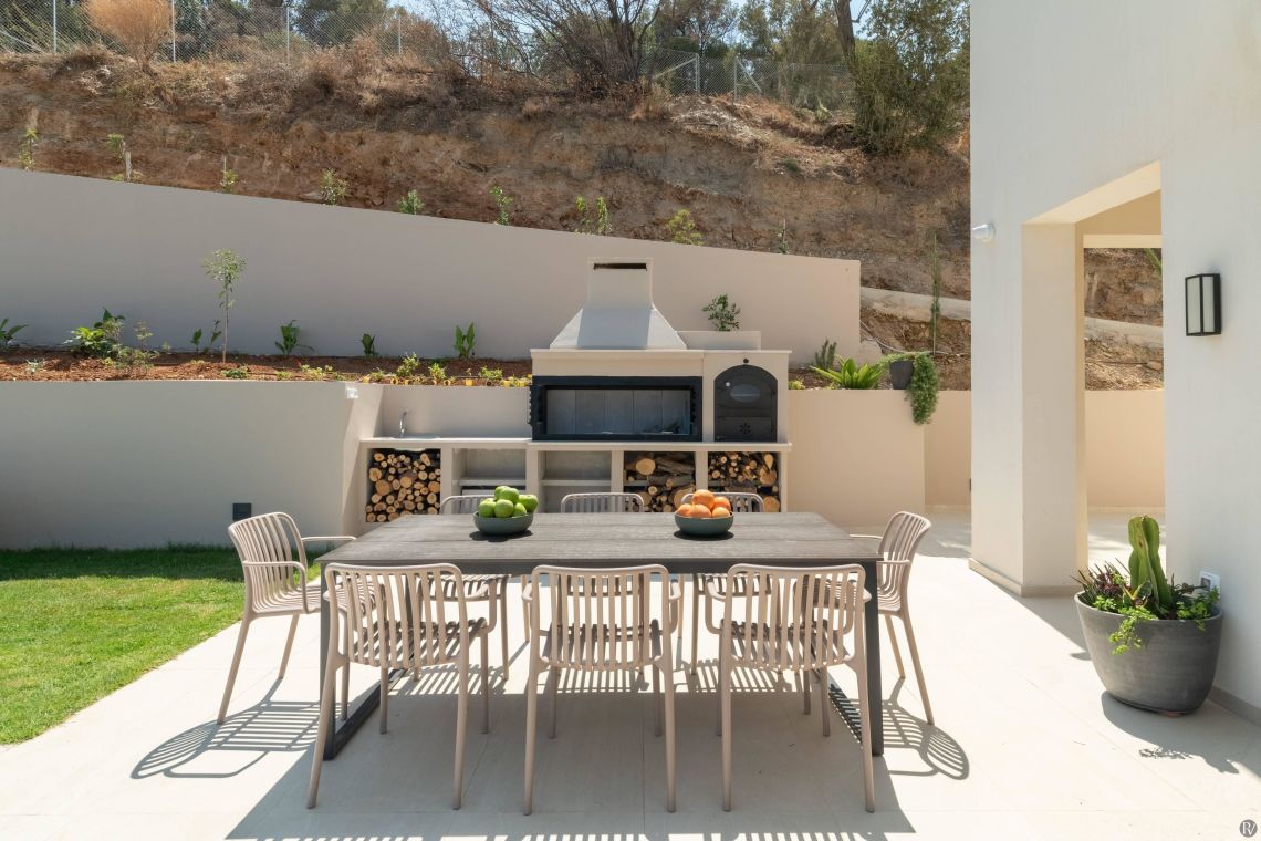 Guests can enjoy al fresco meals at the spacious outdoor dining area, make use of the charcoal barbecue, or relax by the pool under the Mediterranean sun. An outdoor projector adds a unique touch for enjoying movies or music under the stars. Private parking is also available on-site, completing the luxurious and comfortable holiday experience.