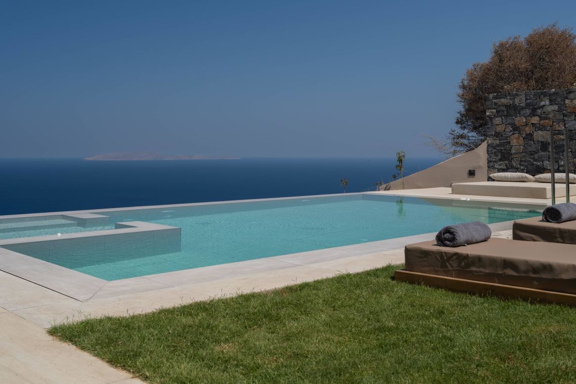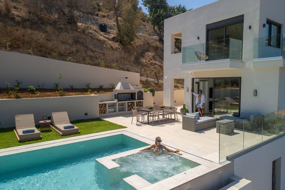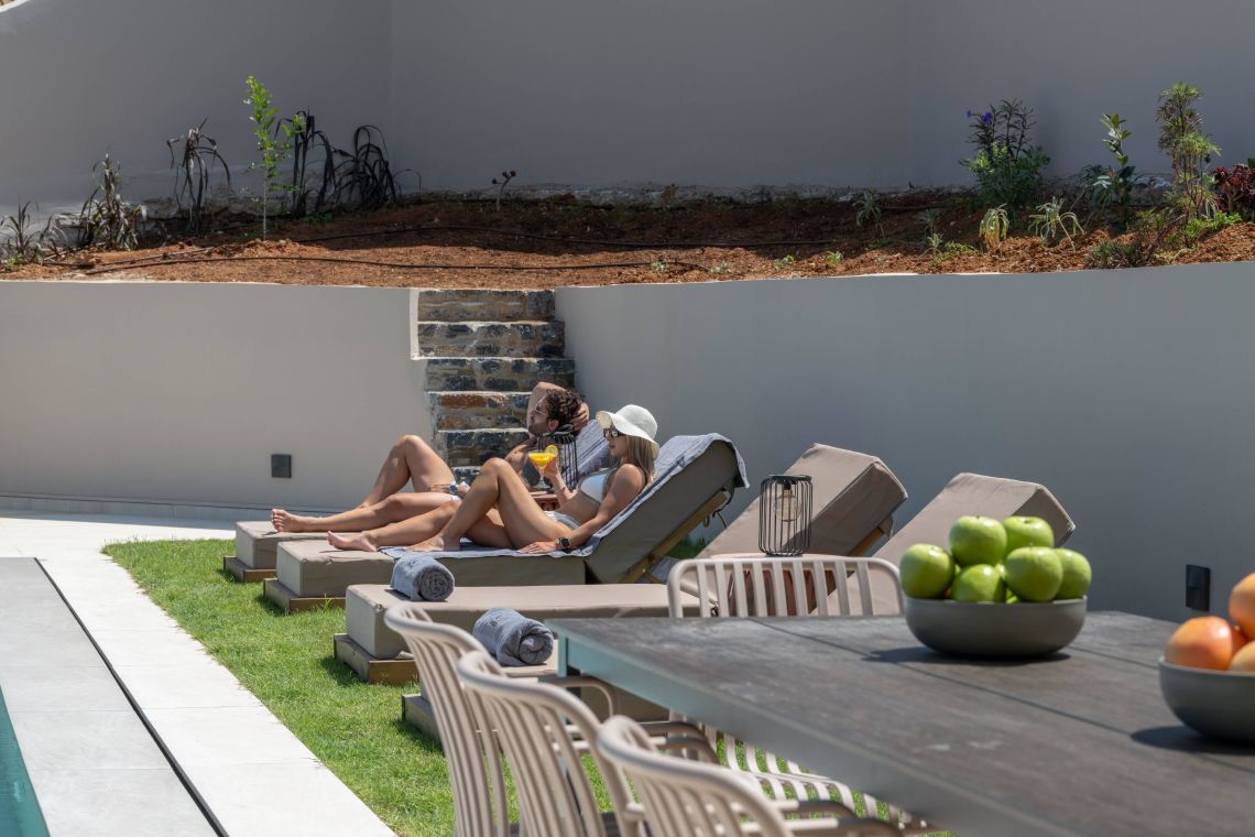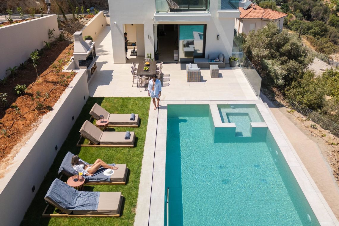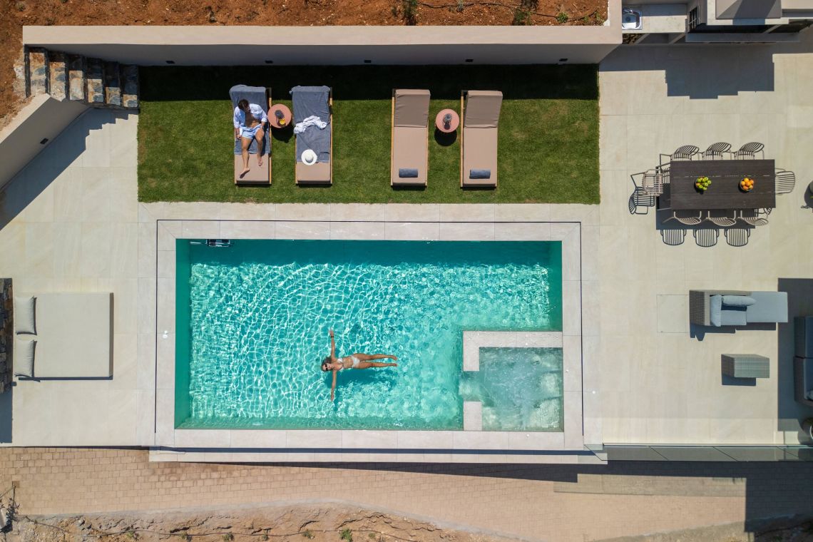The outdoor area of Villa Santeri is a highlight of the property. The private saltwater pool with jacuzzi, completely chlorine-free, is set within a beautifully landscaped garden for ultimate privacy and relaxation.