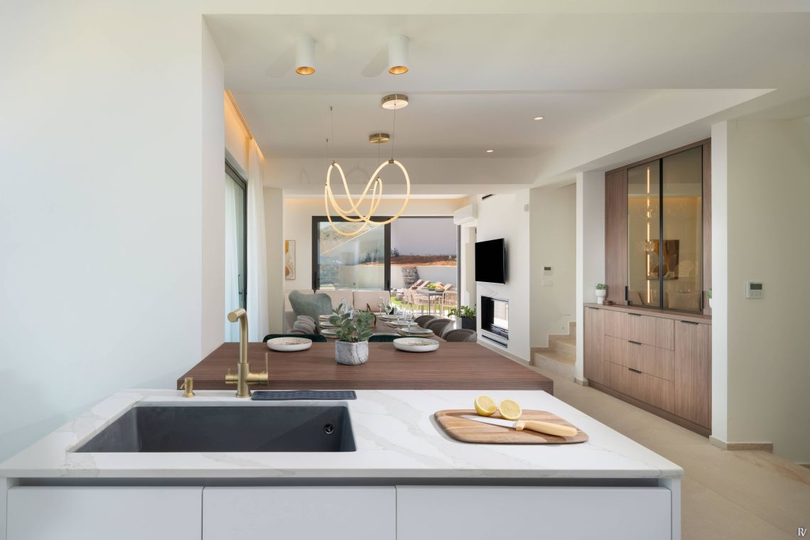 The villa is thoughtfully designed across multiple floors, featuring a spacious living area with a large corner sofa and expansive windows that connect seamlessly to the outdoor spaces. The fully equipped kitchen has everything needed for self-catering, and each floor includes its own kitchenette with water filter and fridge — perfect for larger groups.