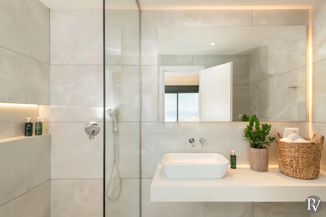 The master bedroom includes a bathtub with uninterrupted sea views
