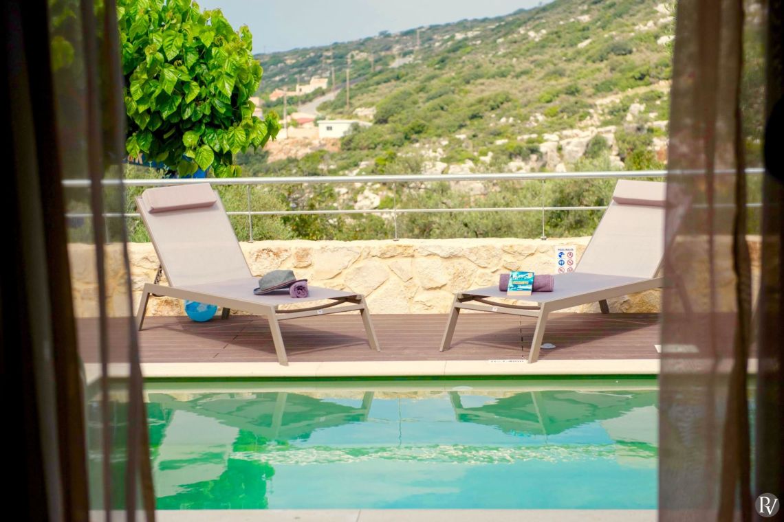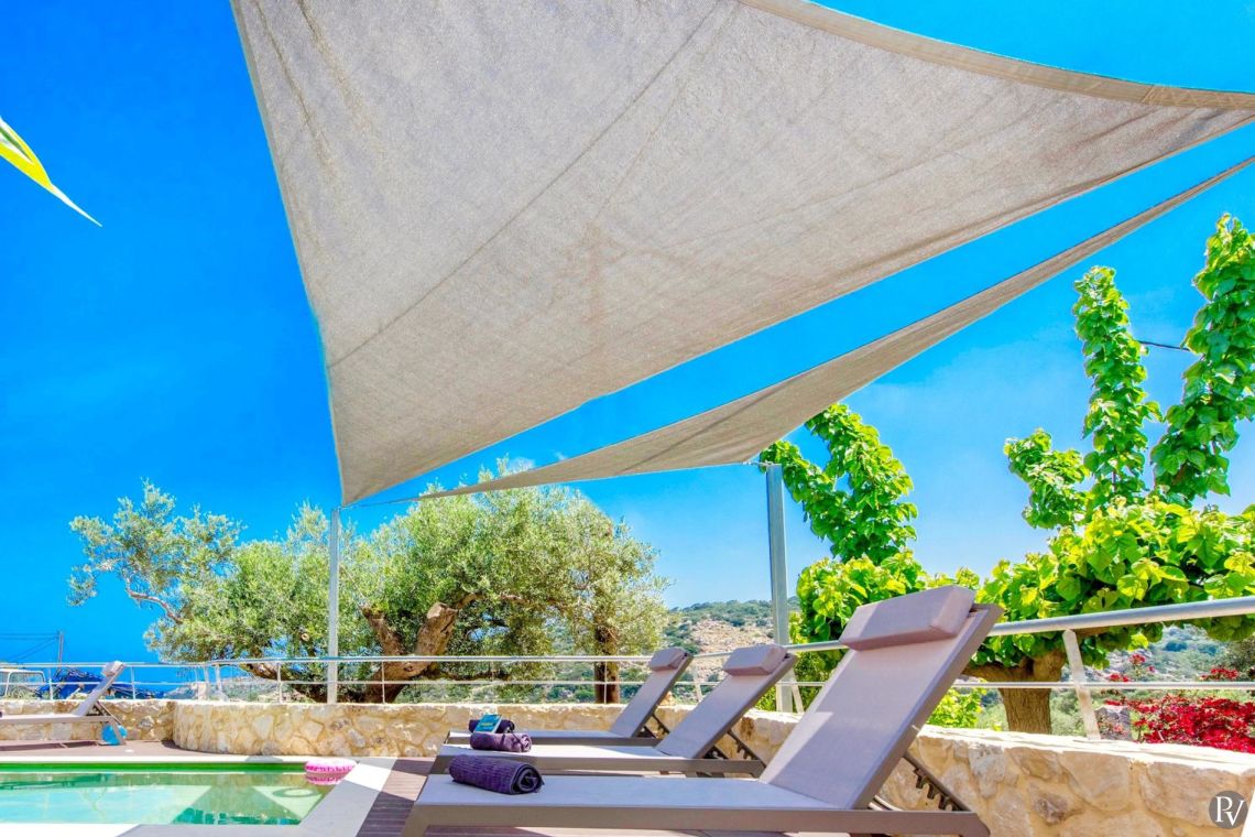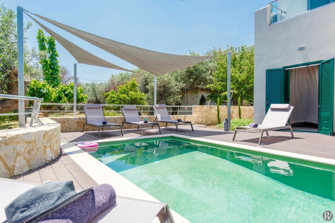 The outdoor areas provide generous space for relaxation and privacy, with views stretching across olive groves to the sea beyond. The inviting private pool (8m x 4m) features a charming aqua-green colour and is beautifully lit at night. A spacious patio with comfortable sunbeds and an outdoor dining area surrounds the pool, while a canopy provides additional shade.