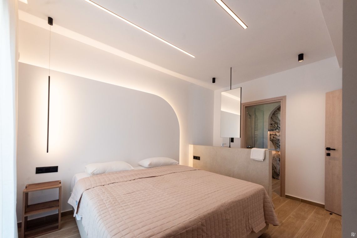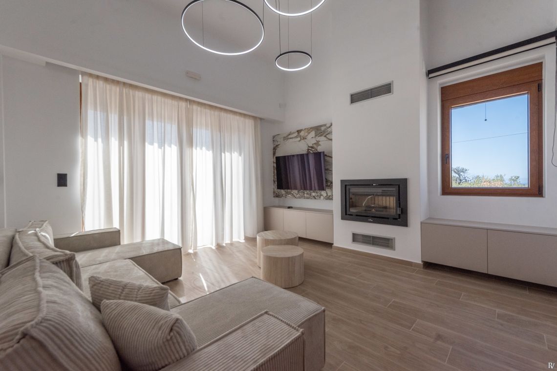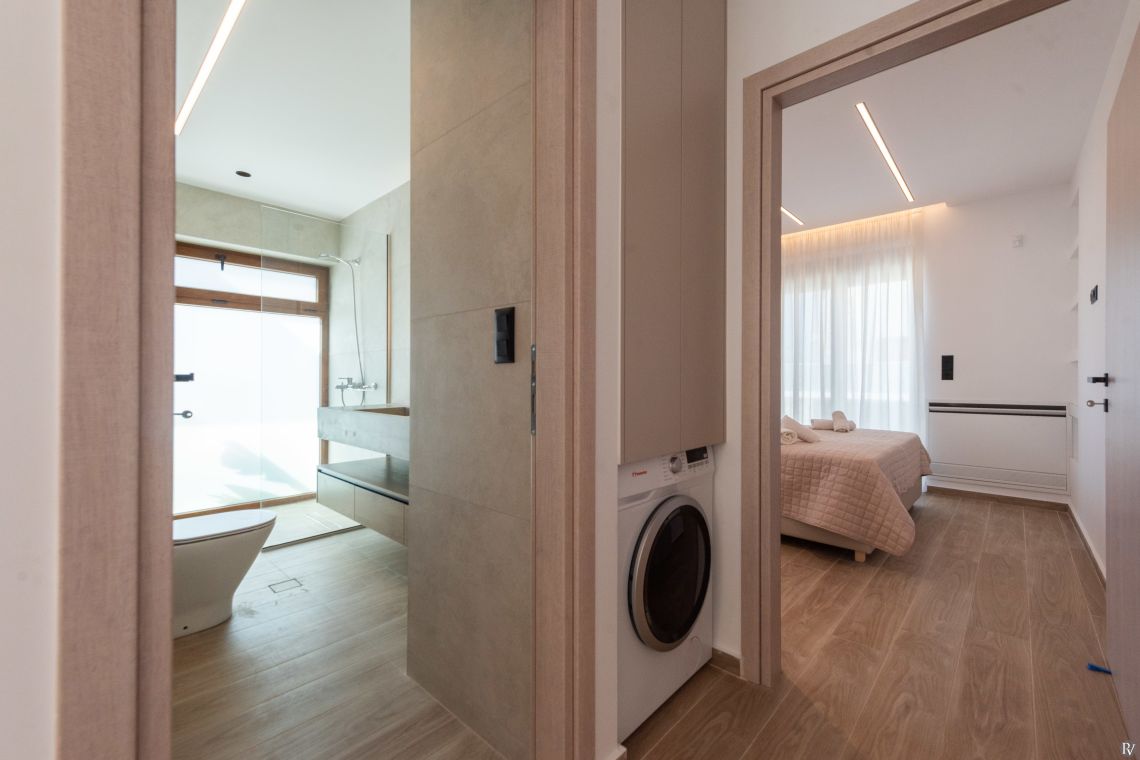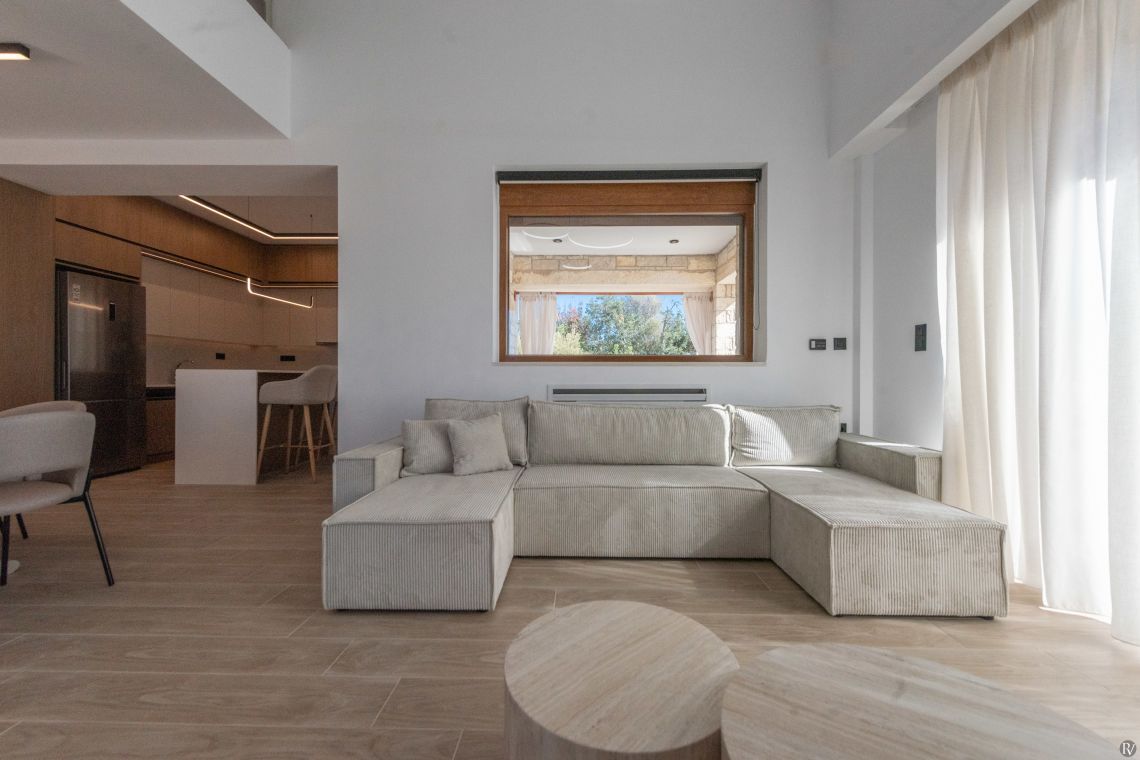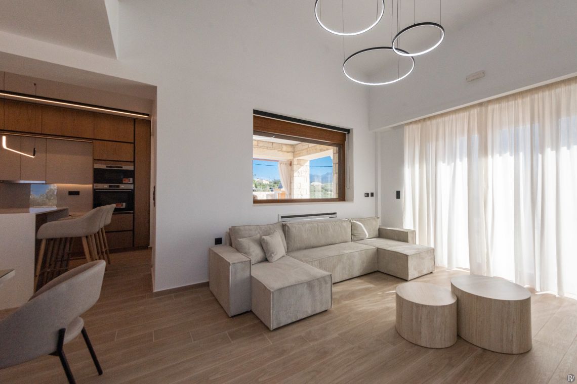 The villa’s fully enclosed garden and sunlit terrace provide a tranquil outdoor setting. Guests can relax by the private pool with its gentle water curtain, dine al fresco, or simply enjoy the peaceful surroundings. Despite its seclusion, local tavernas, beaches, and Rethymno town are just a short drive away, combining convenience with complete privacy.