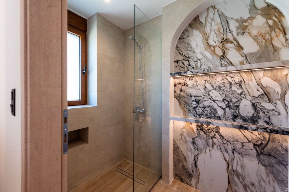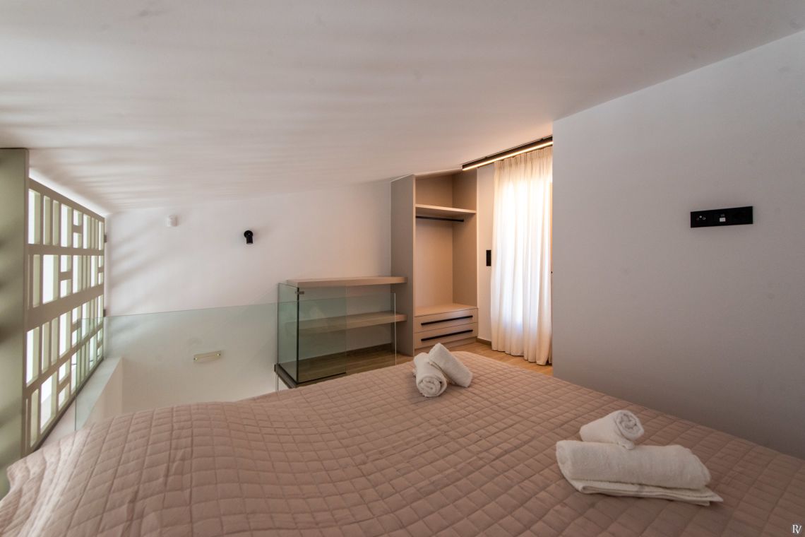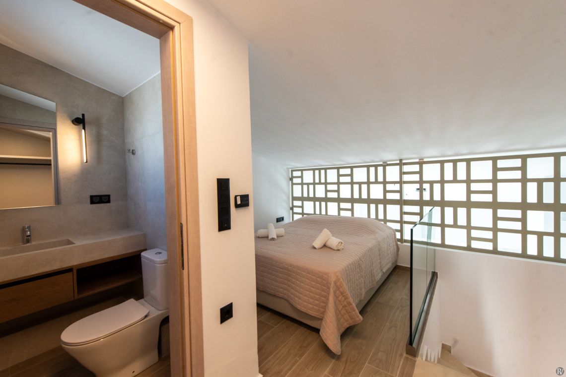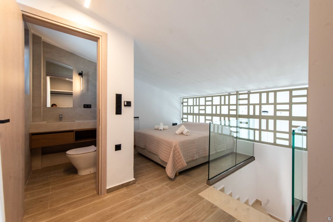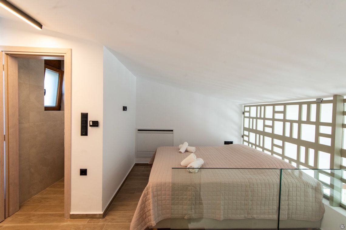 Villa Petrad has three bedrooms designed for flexibility and privacy. Two bright ground-floor bedrooms can be configured as doubles or twins; one has an en-suite bathroom, while the other uses a nearby full bathroom. Upstairs, a loft with a double bed and its own WC offers a quiet, private space.