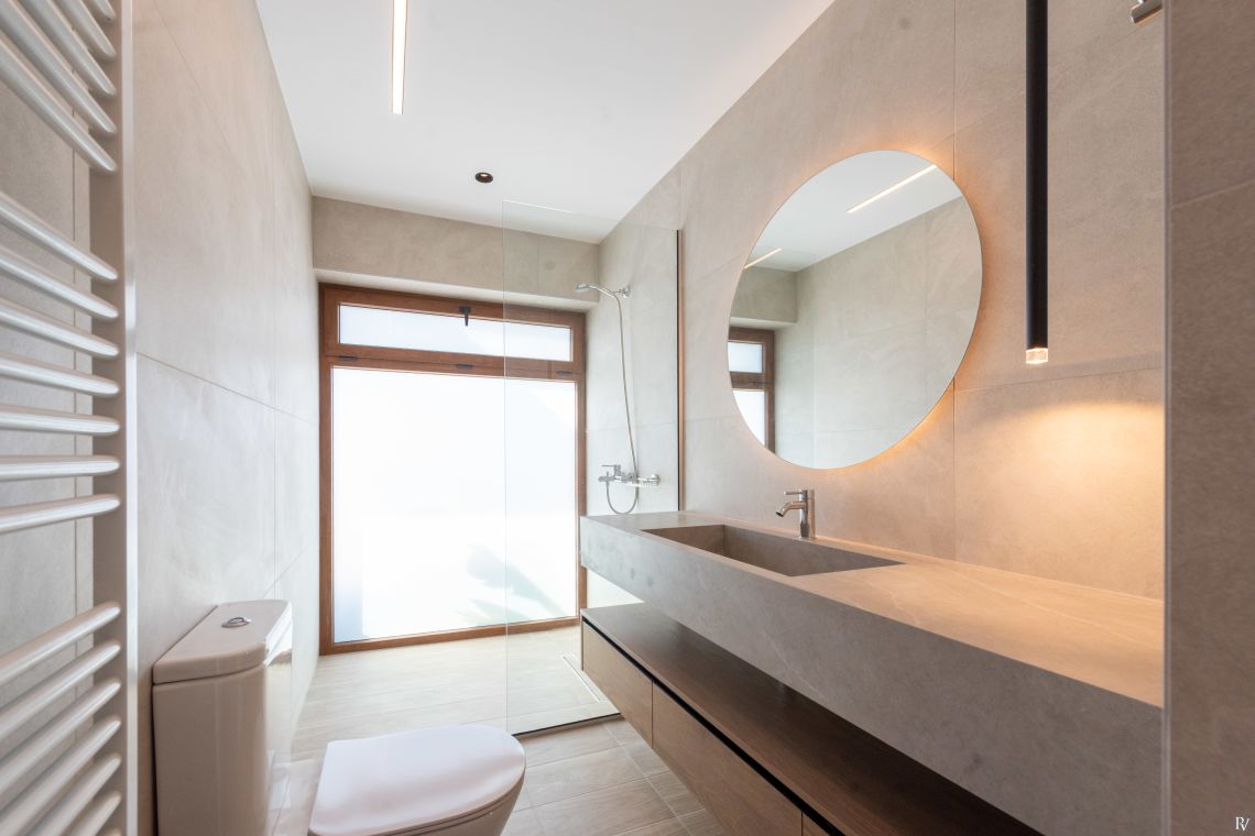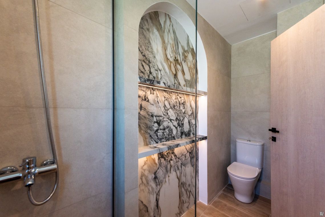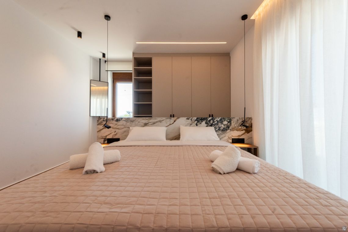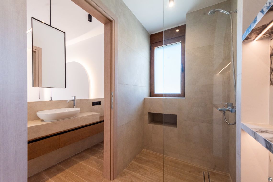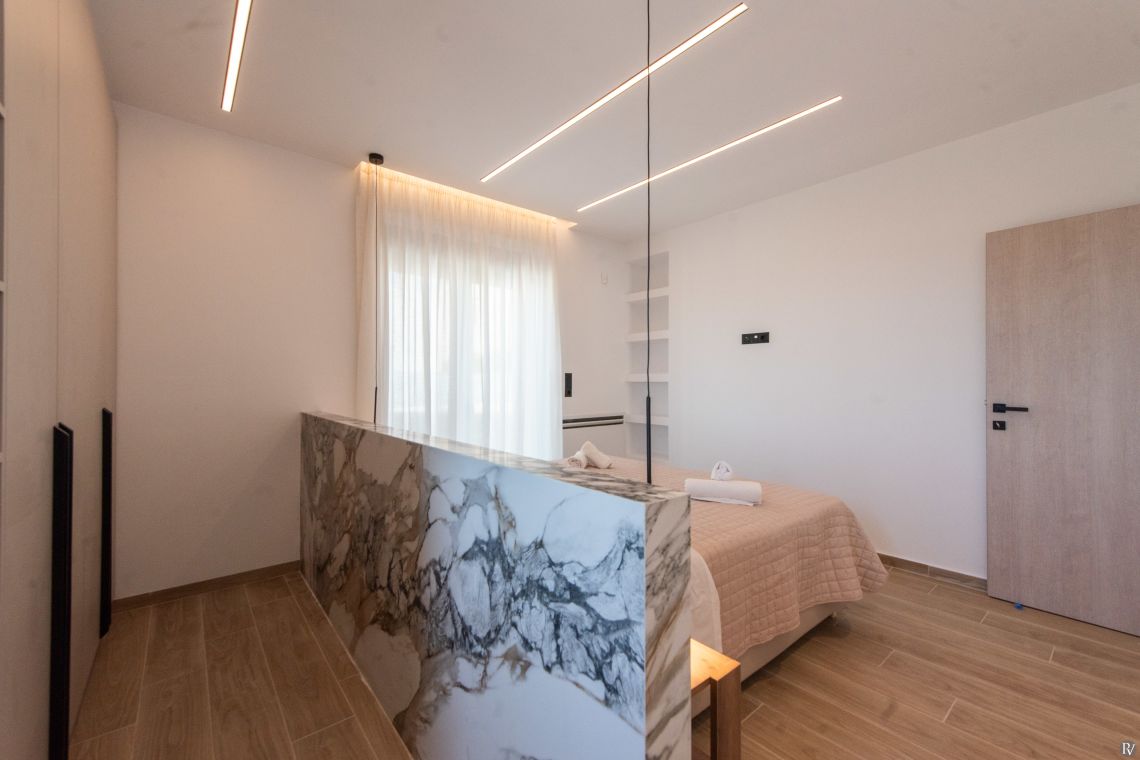 Villa Petrad has three bedrooms designed for flexibility and privacy. Two bright ground-floor bedrooms can be configured as doubles or twins; one has an en-suite bathroom, while the other uses a nearby full bathroom. Upstairs, a loft with a double bed and its own WC offers a quiet, private space.