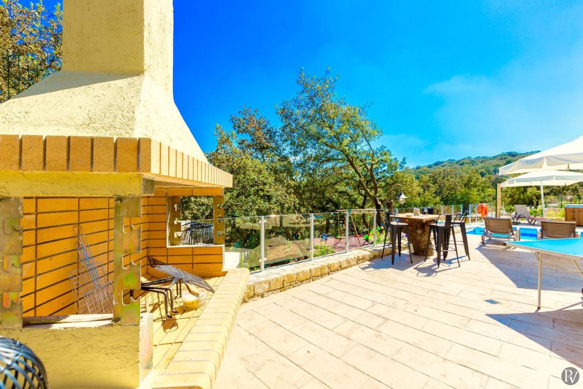 The outdoor areas of Villa Truly are thoughtfully designed for relaxation and family fun. A shaded, furnished patio overlooks the private swimming pool (7.5m x 4m, depth 1.2m–1.4m), complete with comfortable sunbeds and parasols.