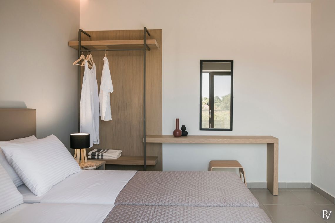 Comfortably furnished in soft, natural hues, Lithos Skala 3 feels bright and welcoming, making it an ideal holiday home for four to six guests with the addition of two sofa beds in the living space. The ground floor also includes a convenient guest WC.