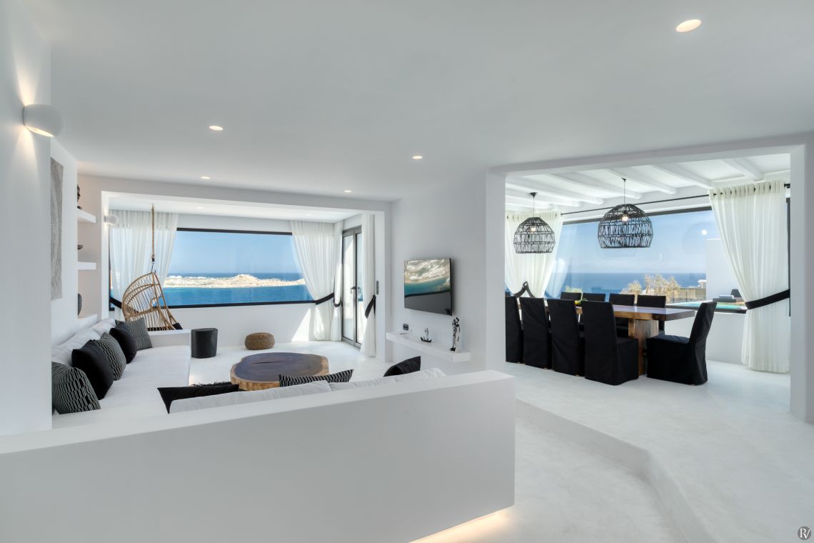 Living room with 2 large built-in sofas, hanging rattan chair, Smart TV, large window with amazing view of the sea and Psarou Beach, direct access to the swimming pool