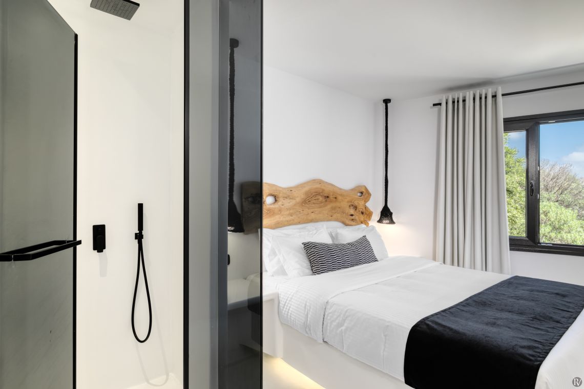 Inside, Villa Venturo is a monochrome dream—sleek black-and-white aesthetics, expansive windows framing the vibrant blue of Psarou, and an effortless connection between indoor and outdoor living. The open-plan common areas are designed for both comfort and style, with French doors leading directly to the pool terrace. A fully equipped, chef-ready kitchen flows into the living and dining areas, where a large wooden table for 10 invites gatherings overlooking the sea. Every detail of the interiors has been crafted to elevate the experience, offering a luxurious yet relaxed environment that celebrates Mykonian light and modern elegance.