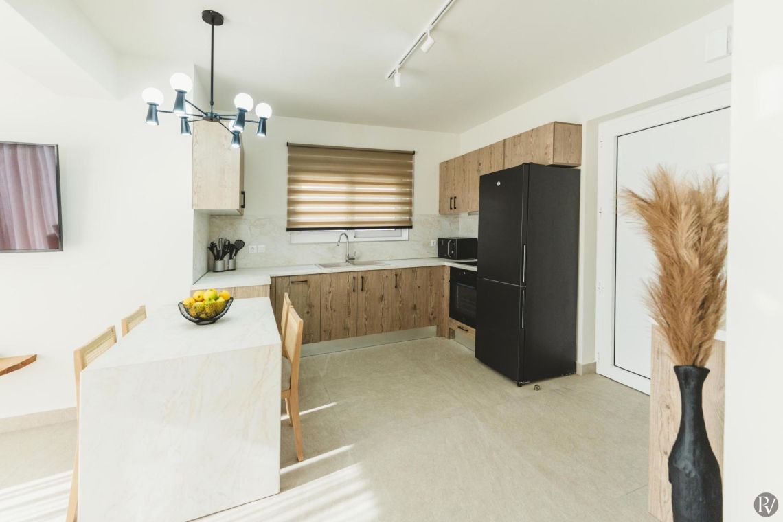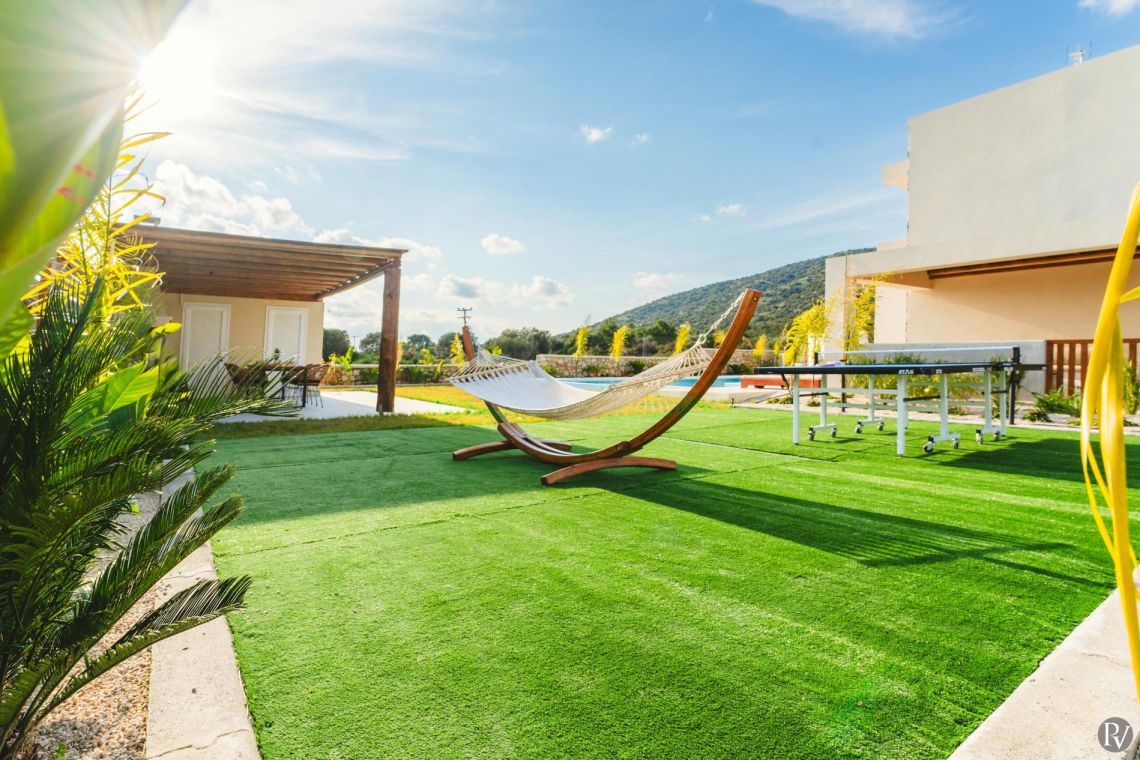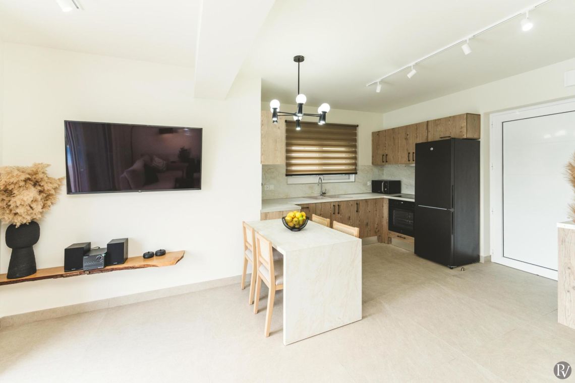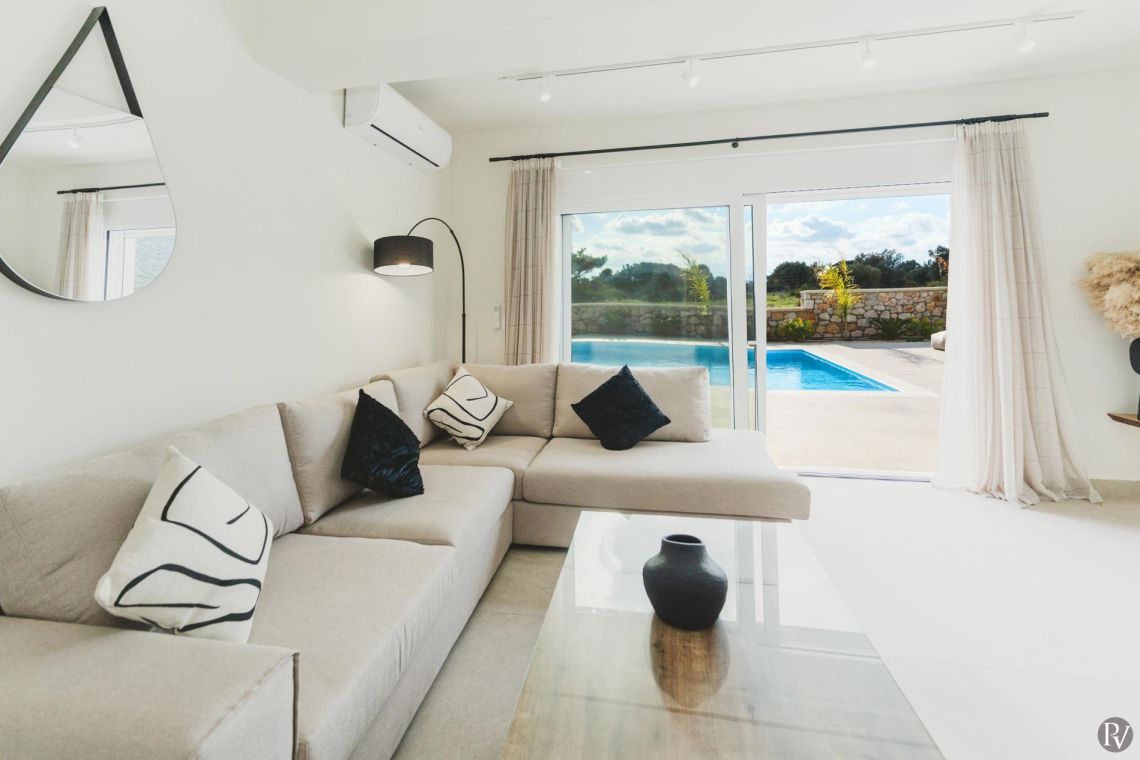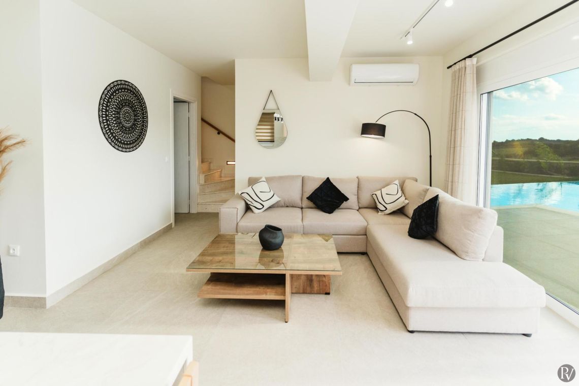 The villa’s interiors are bright, modern, and welcoming, centred around a spacious open-plan living area. The comfortable lounge is perfect for unwinding, while the fully equipped kitchen includes all modern appliances such as an electric oven, dishwasher, washing machine, espresso and filter coffee machines, making self-catering effortless.