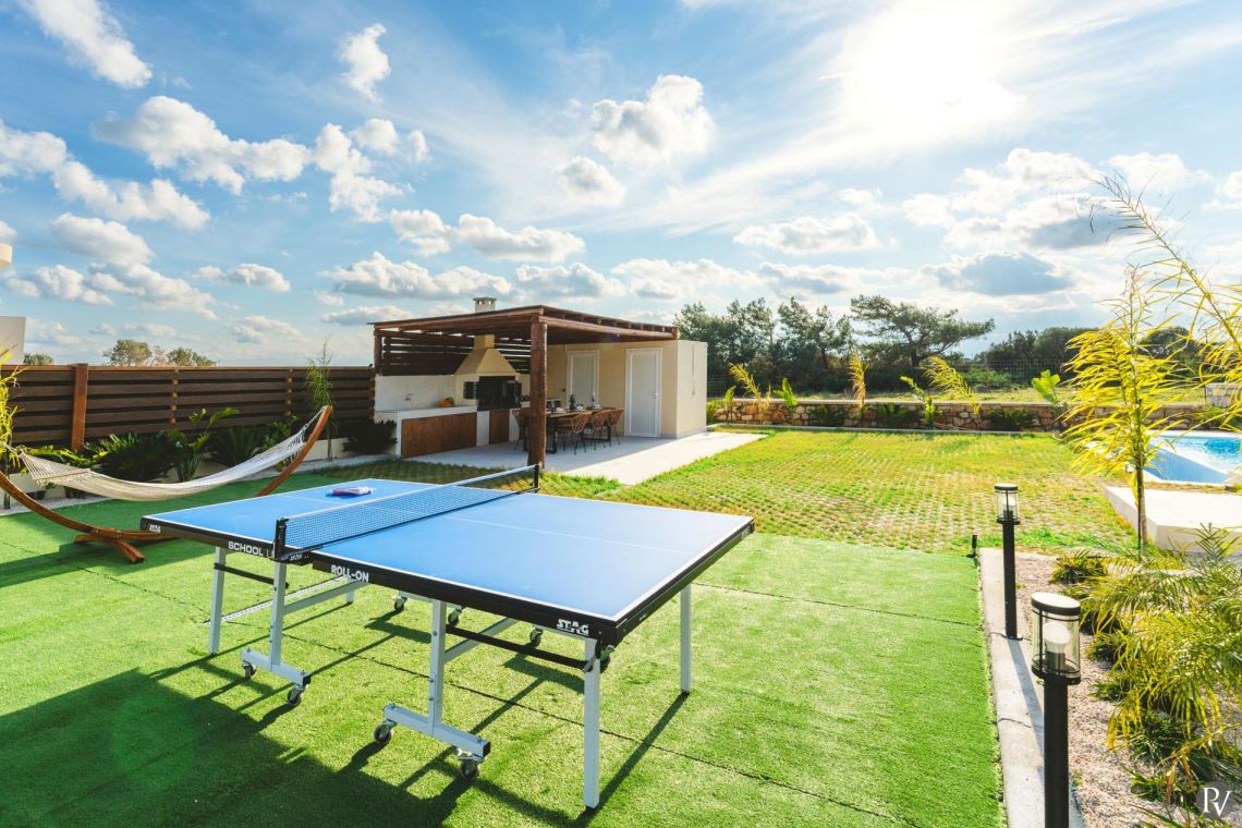 The outdoor spaces at Villa Lachania are perfect for relaxed island living. A private swimming pool (12m x 4m) is surrounded by sun loungers and a peaceful garden, providing a serene spot to soak up the Aegean sun. A shaded dining terrace and coal BBQ invite guests to enjoy leisurely meals outdoors, while a table tennis area adds a fun touch for all ages.