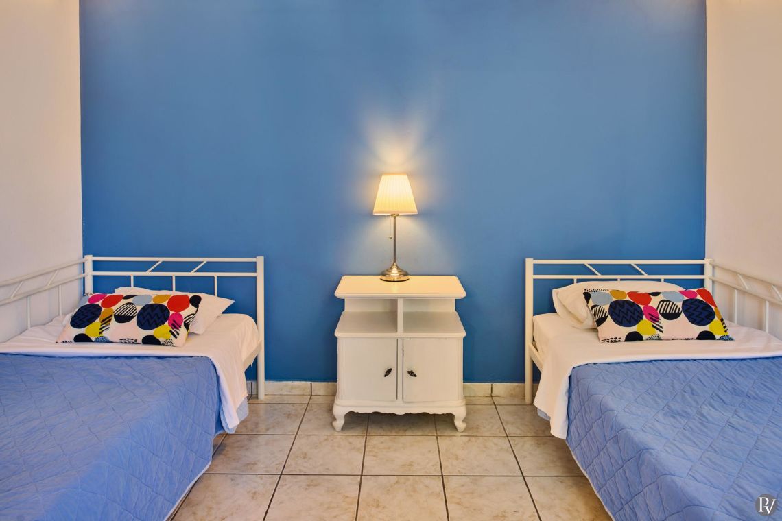Villa Ariadne Caretta offers two comfortable bedrooms across two floors. On the ground floor, there is a bedroom with two single beds, conveniently located next to a bathroom equipped with both a bathtub and a shower.