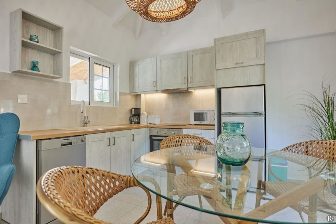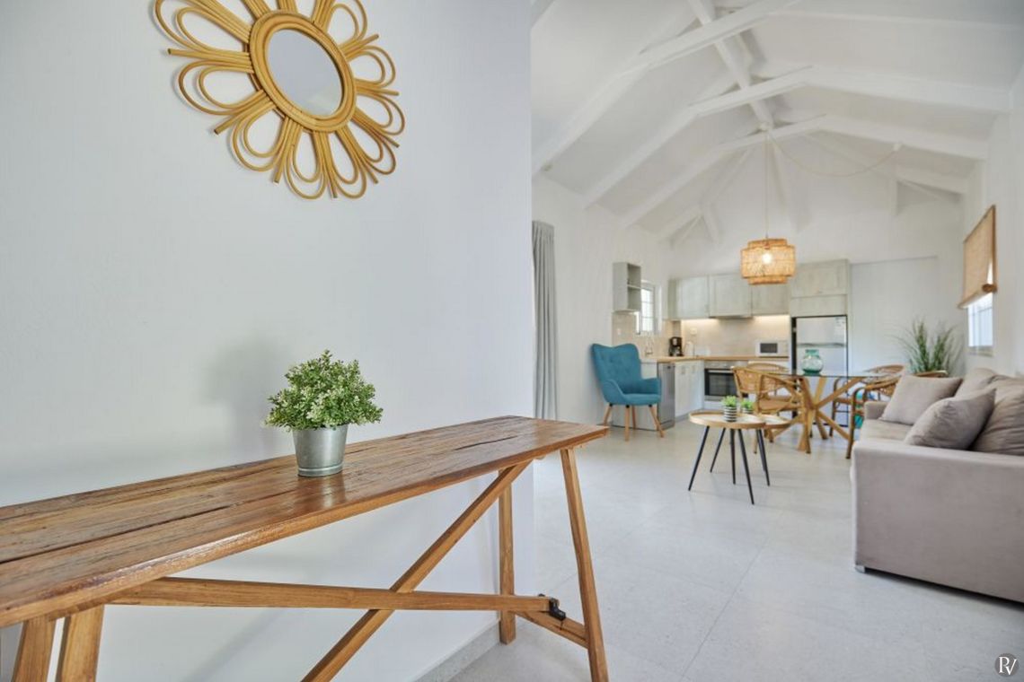 Upon entering, guests are welcomed into a bright open-plan living and dining area that flows seamlessly into a fully equipped kitchen, creating a spacious and comfortable environment for everyday living. The ground floor also includes a modern bathroom fitted with both a bathtub and a shower, offering convenience and flexibility. A wooden staircase leads to the upper level of the villa.