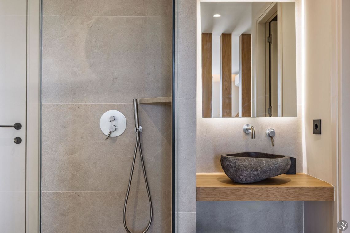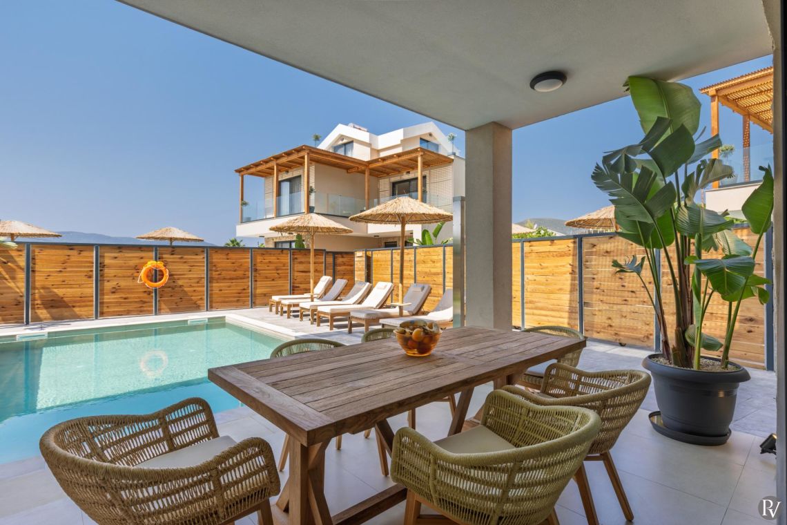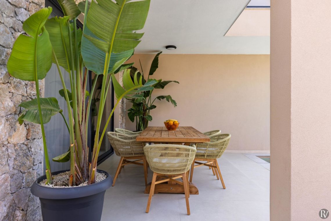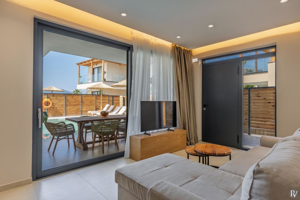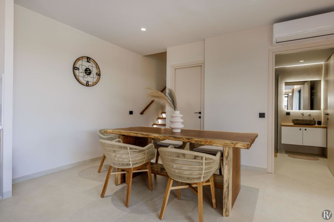 Designed with light, open spaces and refined elegance, Villa Chara 1 is arranged over multiple levels and offers beautifully appointed living areas throughout. The ground floor features a fully equipped modern kitchen with sleek countertops, high-end appliances, and all essentials for preparing meals with fresh local ingredients. Adjacent to the kitchen is a spacious living room with comfortable sofas and a 50-inch flat-screen TV, creating a welcoming space to relax after a day out. A cozy refectory area elsewhere in the villa provides a quiet corner for morning coffee or reading.