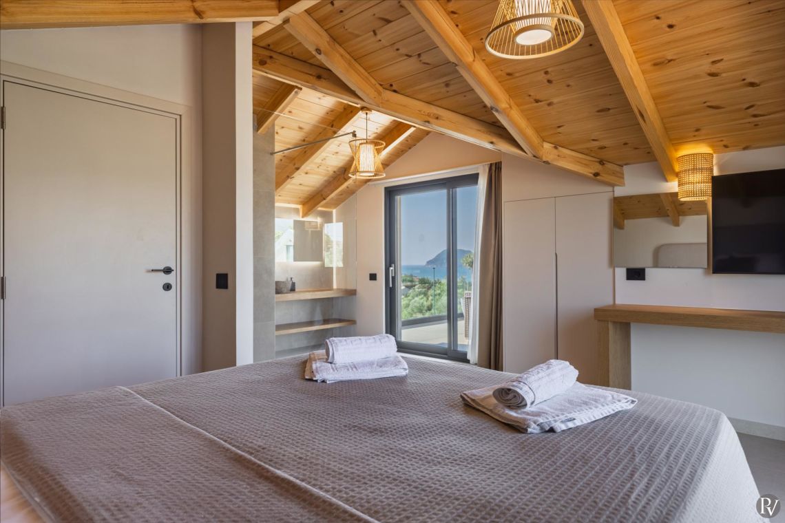 The outdoor spaces of Villa Chara 1 are a true highlight. Set within a lush garden, the private swimming pool offers uninterrupted views of the sea and the verdant hills of Zakynthos, creating a tranquil and picturesque setting. The pool area features an al fresco dining area and a space that is perfect for relaxing in the fresh air. A fully equipped BBQ station and shaded dining area provide the perfect backdrop for long evening meals, social gatherings, or relaxed nights under the stars.