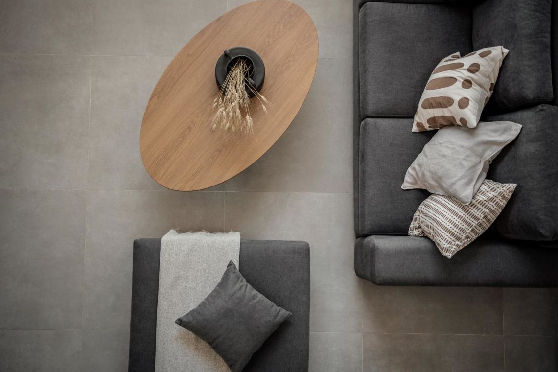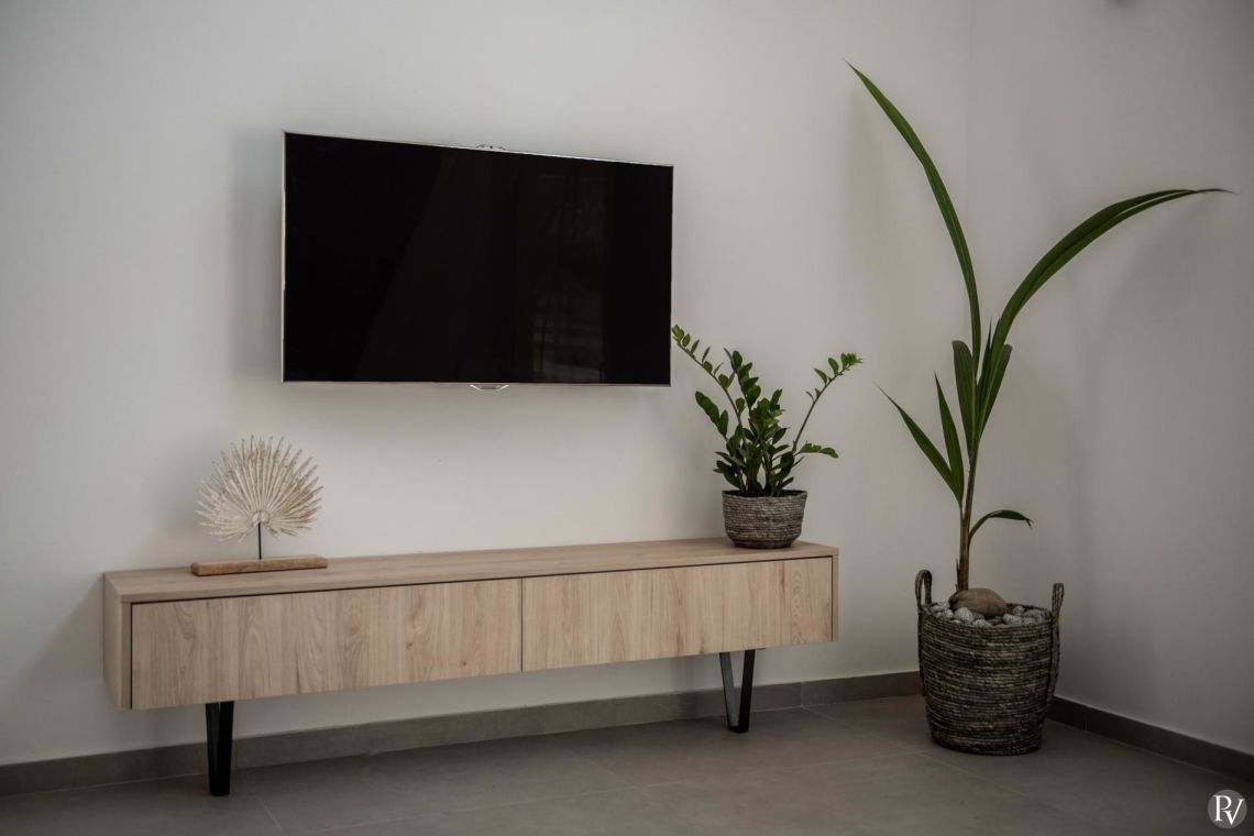 Villa Ena features a spacious and beautifully designed living area, complete with comfortable seating, a Smart TV, and wide patio doors that allow natural light to flood the space while offering lovely views of the outdoors.