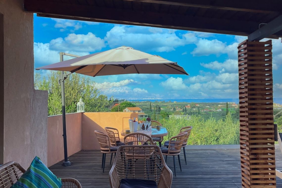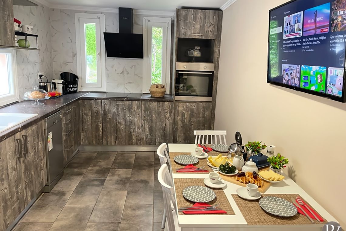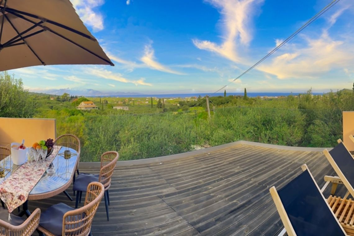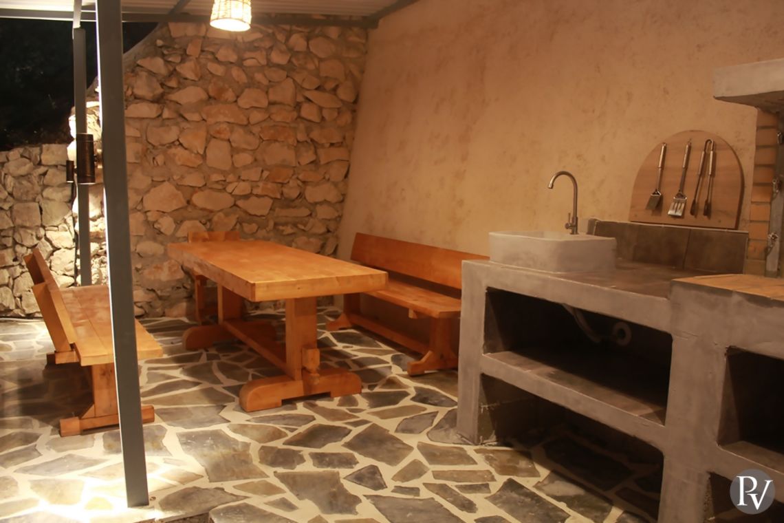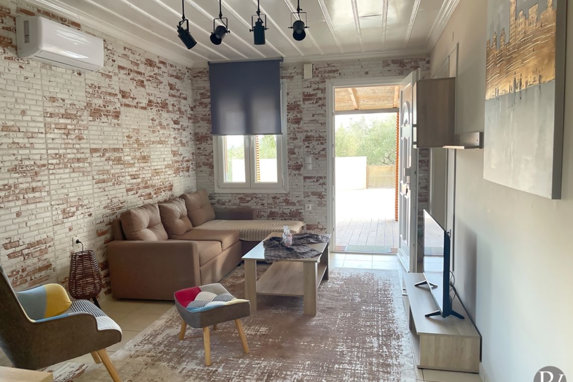 The outdoor spaces are designed for relaxation and al fresco living. The main decked terrace surrounds the private pool and is furnished with attractive sun loungers, ideal for soaking up the Zakynthian sunshine. To the rear of the property, a charming terrace built in local stone features a large wooden dining table, providing a shaded setting for outdoor meals. The barbecue is also located here, making it the perfect spot for relaxed evenings dining under the Ionian sky.