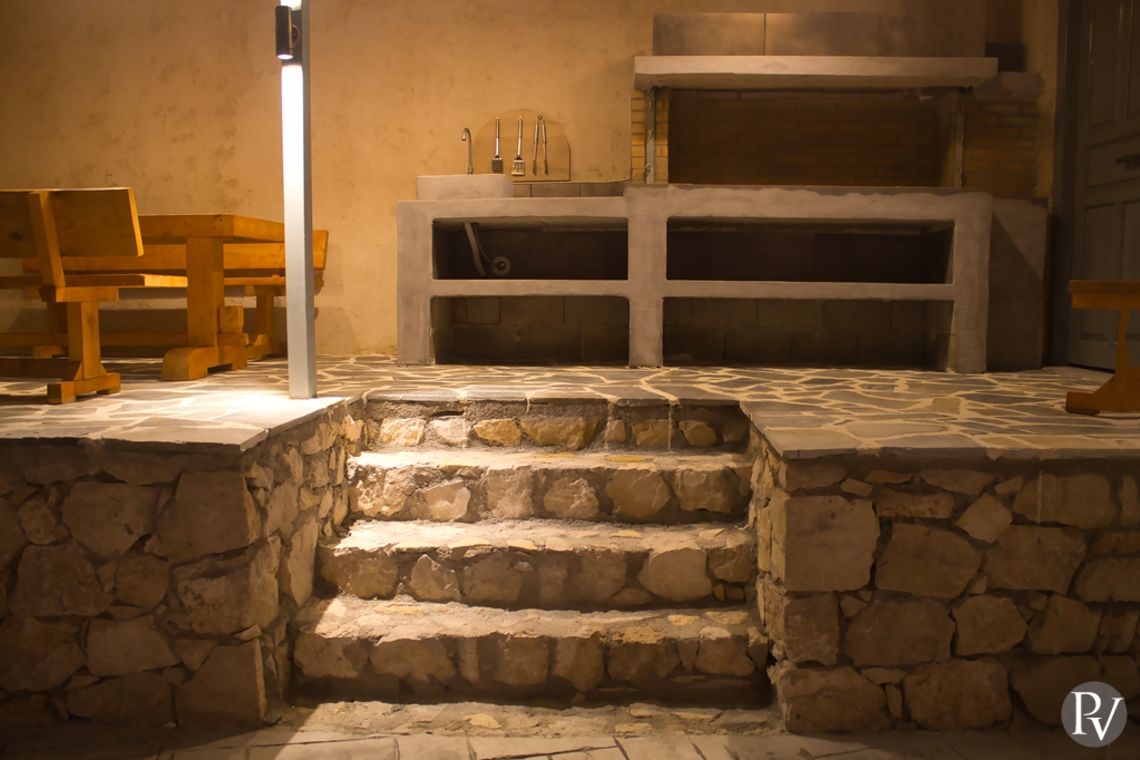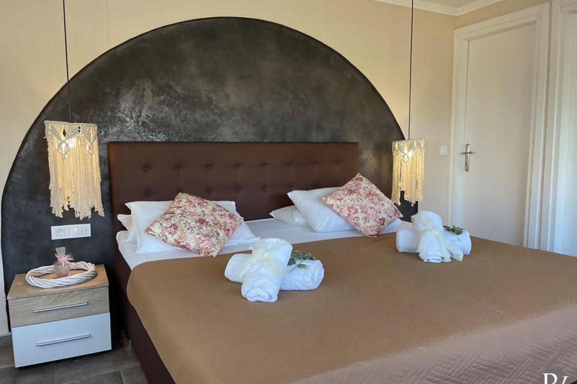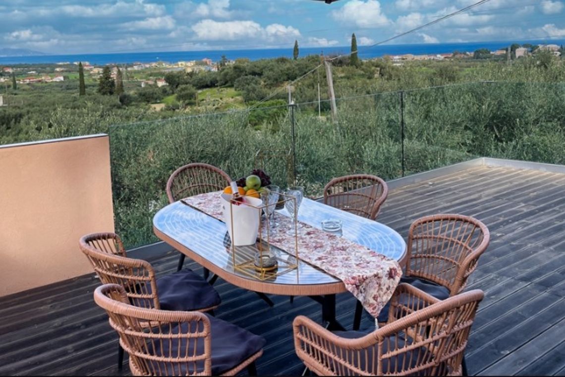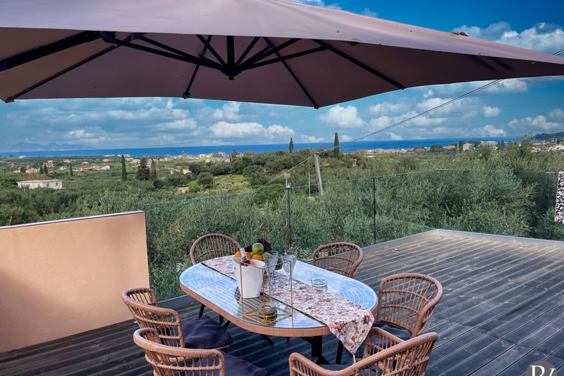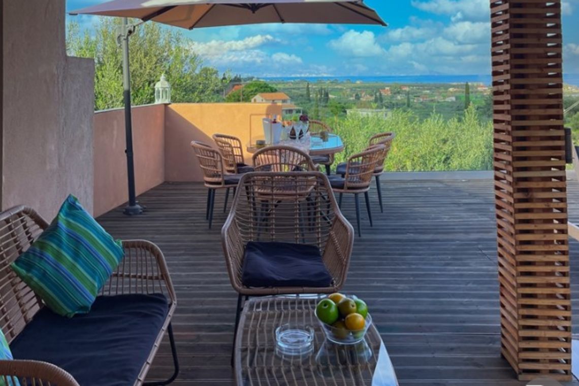 The outdoor spaces are designed for relaxation and al fresco living. The main decked terrace surrounds the private pool and is furnished with attractive sun loungers, ideal for soaking up the Zakynthian sunshine. To the rear of the property, a charming terrace built in local stone features a large wooden dining table, providing a shaded setting for outdoor meals. The barbecue is also located here, making it the perfect spot for relaxed evenings dining under the Ionian sky.