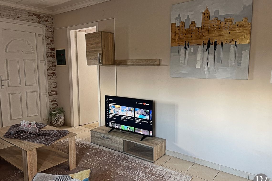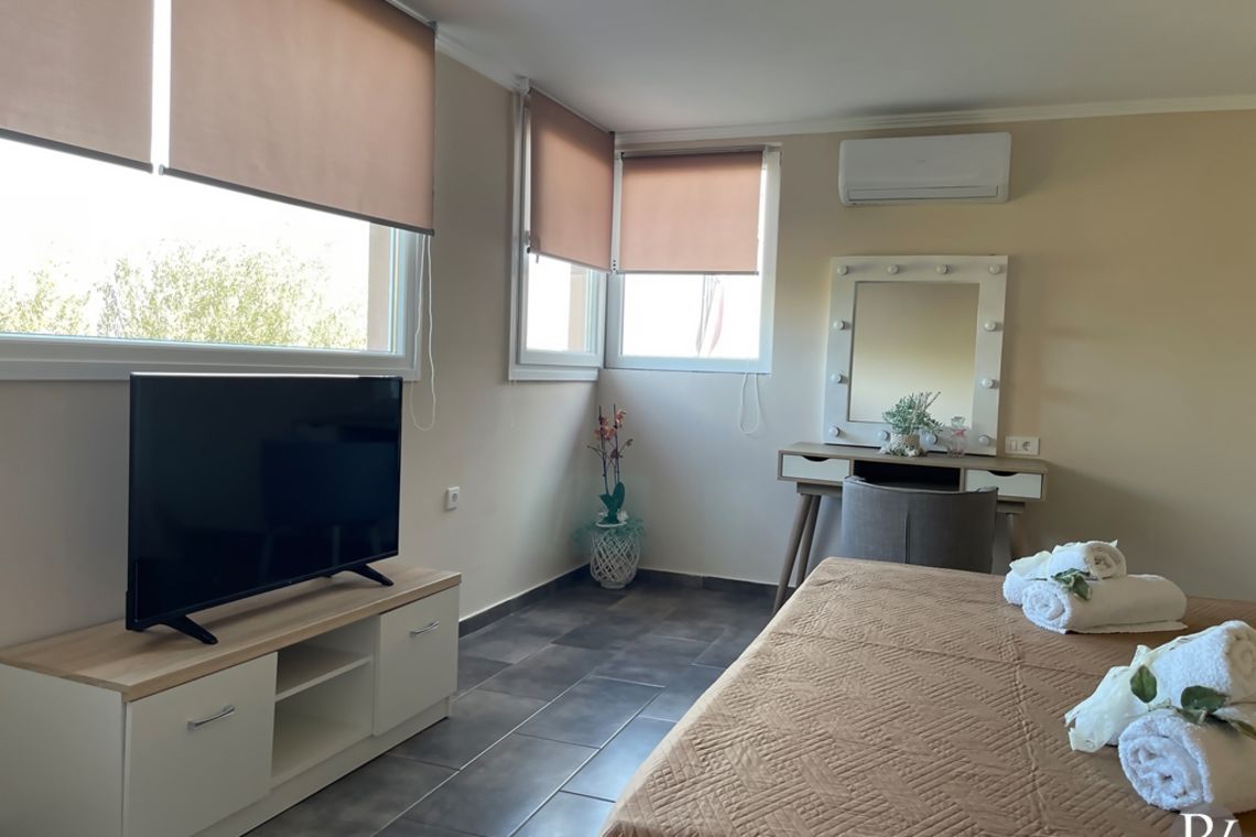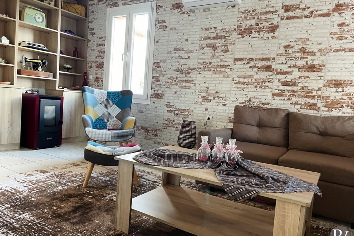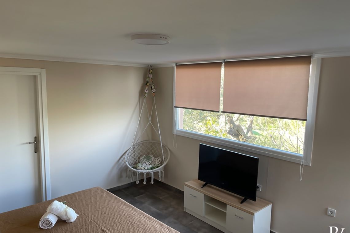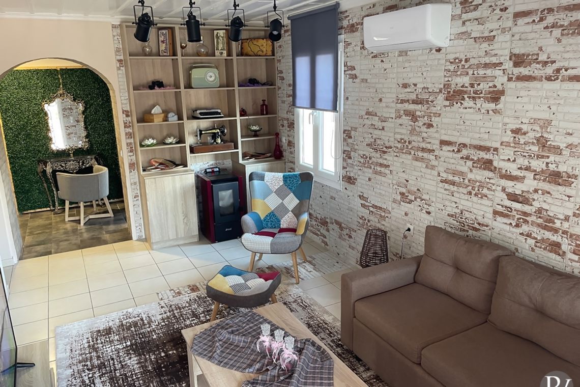 The outdoor spaces are designed for relaxation and al fresco living. The main decked terrace surrounds the private pool and is furnished with attractive sun loungers, ideal for soaking up the Zakynthian sunshine. To the rear of the property, a charming terrace built in local stone features a large wooden dining table, providing a shaded setting for outdoor meals. The barbecue is also located here, making it the perfect spot for relaxed evenings dining under the Ionian sky.