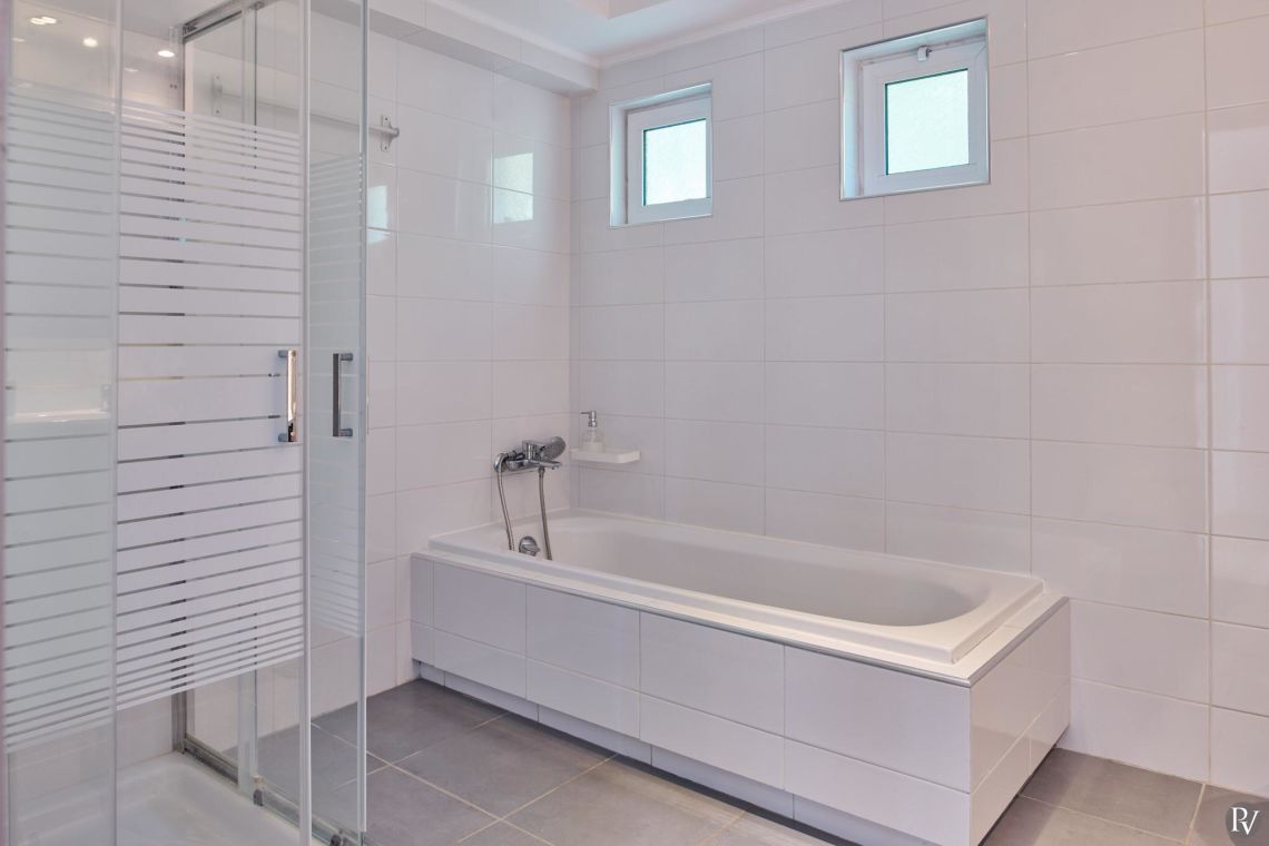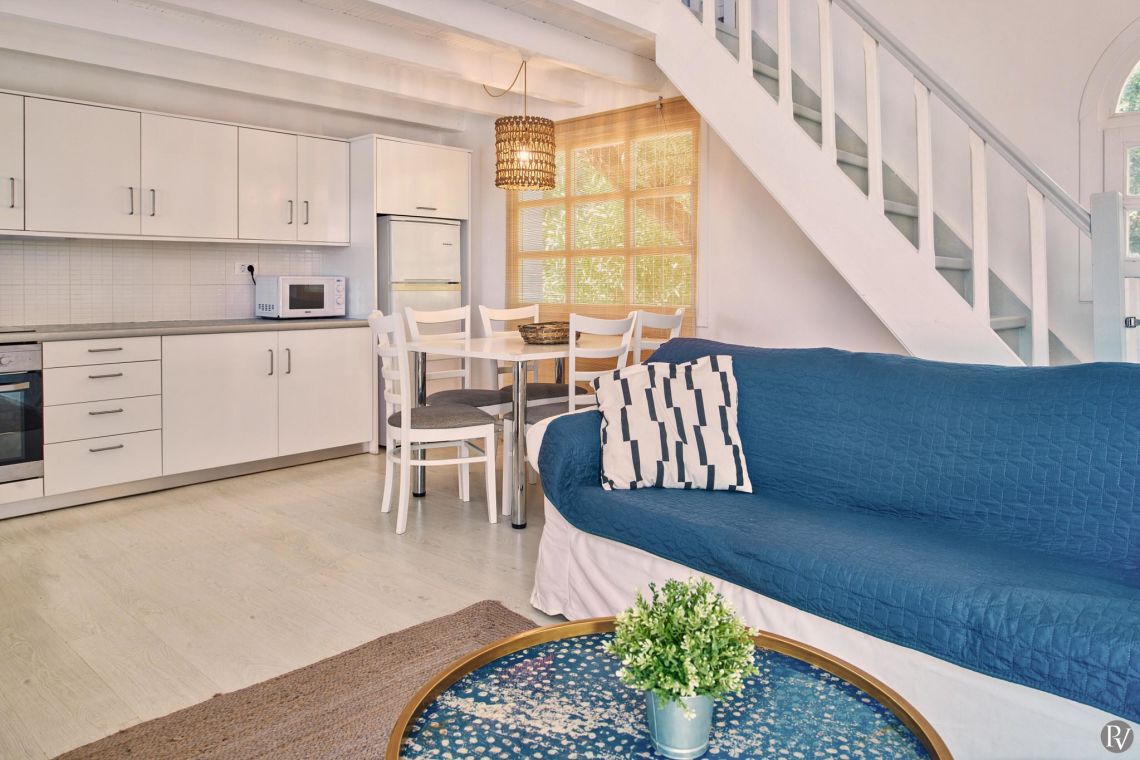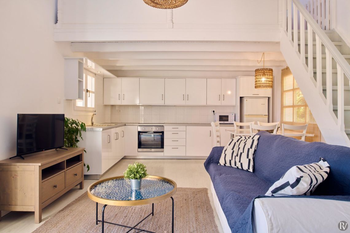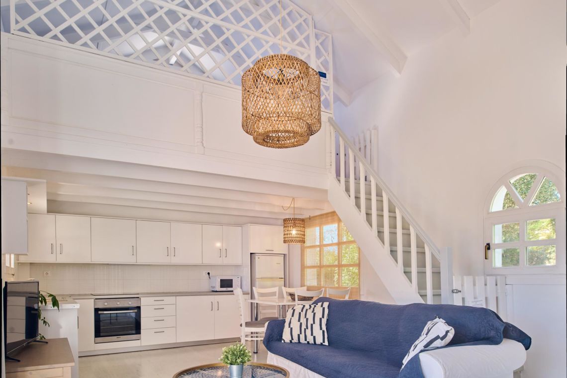 The villa features a bright open-plan living, dining, and kitchen area, creating a warm and inviting atmosphere for relaxation and shared meals. The ground floor includes a well-equipped bathroom with both a bathtub and shower, ensuring convenience and comfort for all guests. A wooden staircase with a toddler safety gate leads to the loft bedroom.