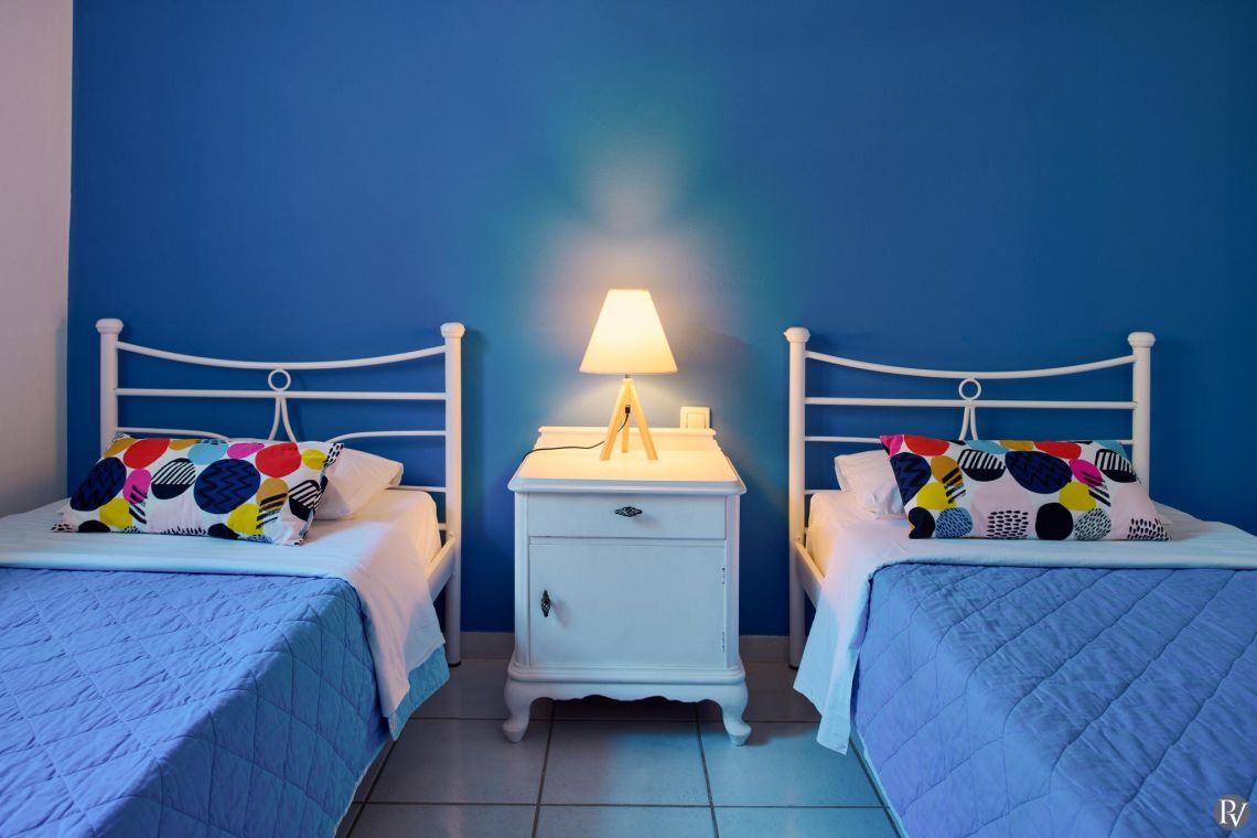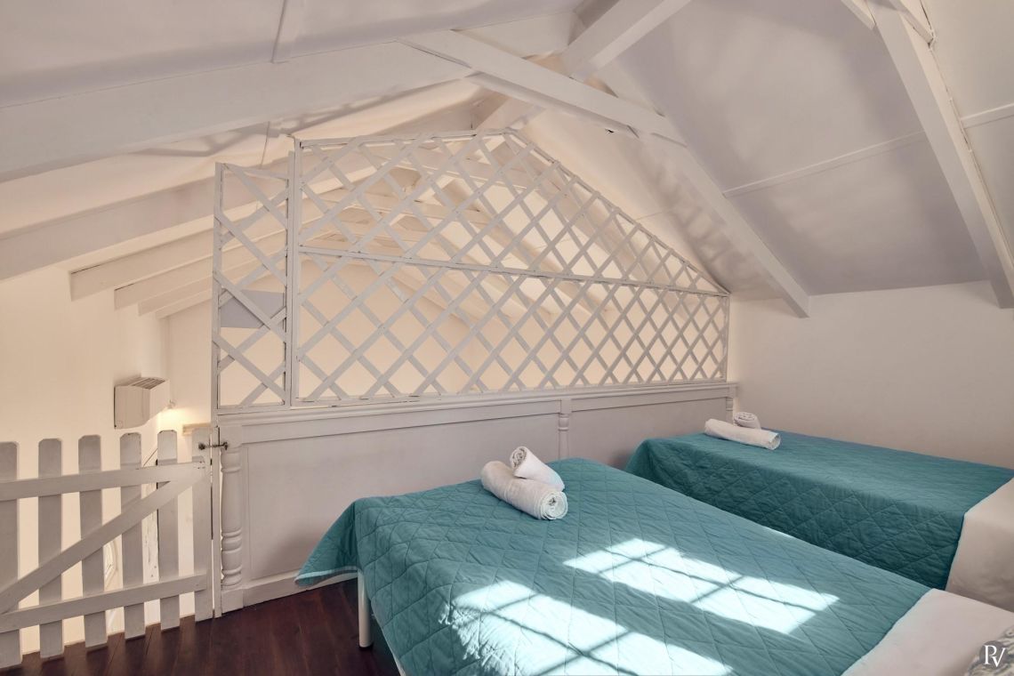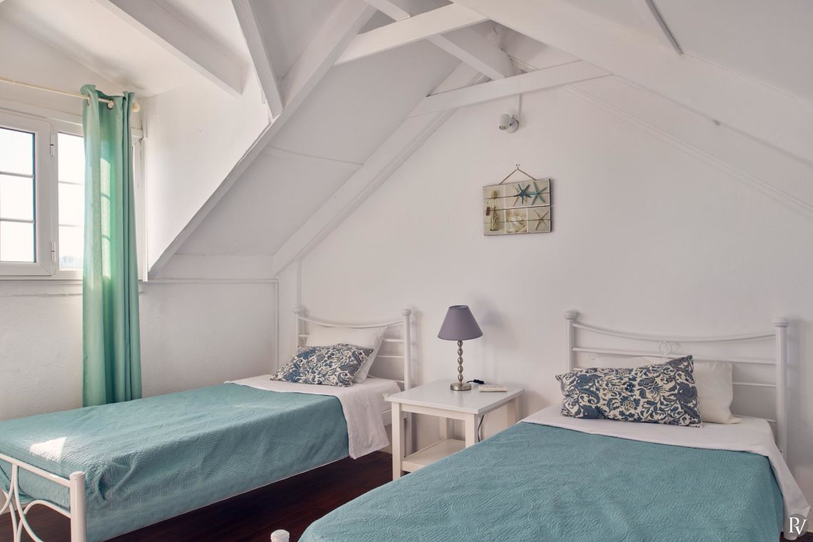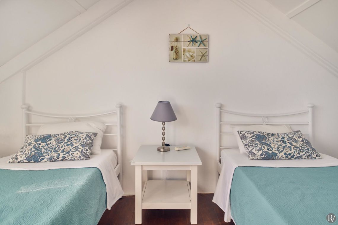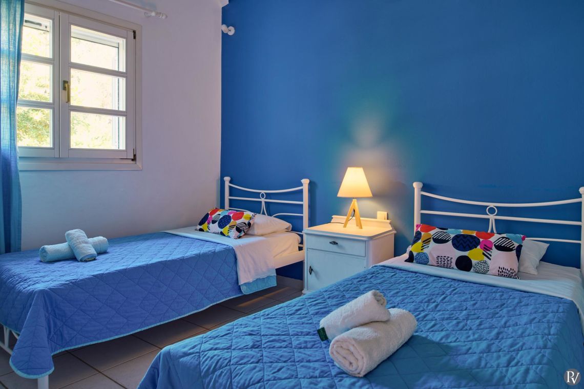Villa Erato Caretta offers three comfortable bedrooms. On the ground floor, one bedroom has a double bed while the second bedroom includes two single beds. The loft bedroom upstairs also features two single beds, ideal for children or additional guests.