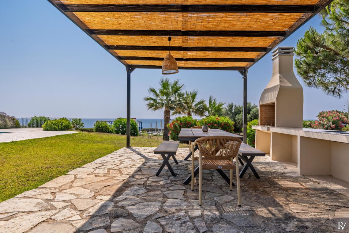 The villa’s outdoor area is a true highlight, with a 12x6m swimming pool featuring Roman steps, a separate children’s pool, and a landscaped garden. Sunbeds surround the pool for lounging in the sun or shade. The covered veranda includes a large dining table, a cozy seating area, and a fully equipped built-in barbecue for alfresco meals. Guests also have access to the communal pool within the complex, complete with a pool bar for socializing and enjoying refreshing drinks.
