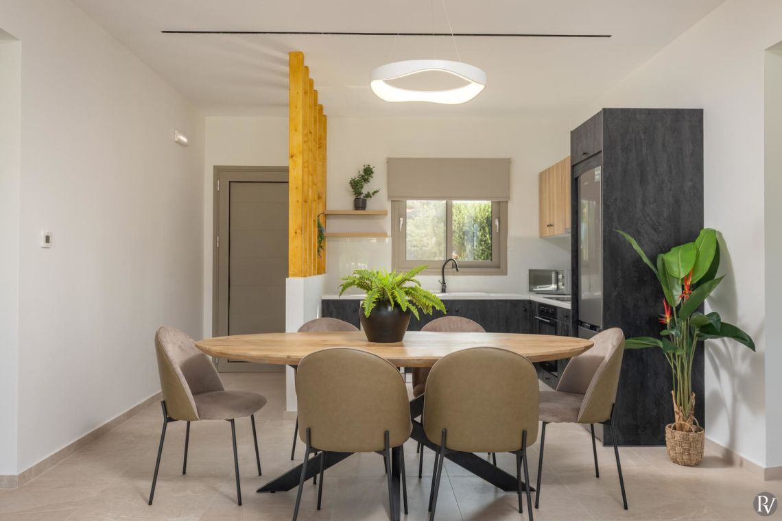 Upon entering, guests are welcomed into a spacious living room that flows seamlessly into the dining area and open-plan kitchen. The villa’s modern design and premium amenities make this space perfect for relaxation, social gatherings, or enjoying quiet moments with family and friends.