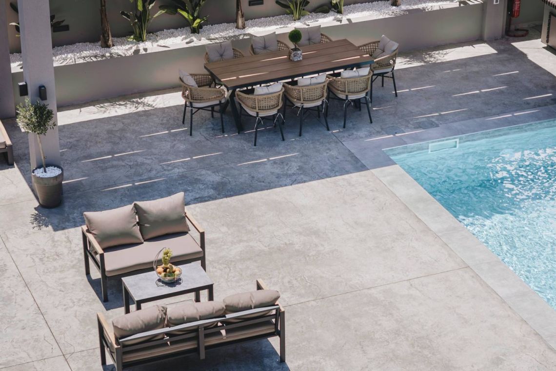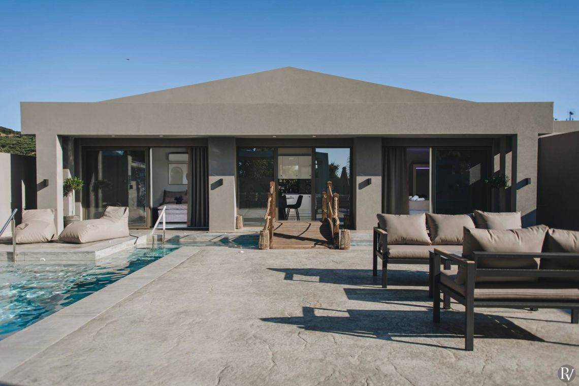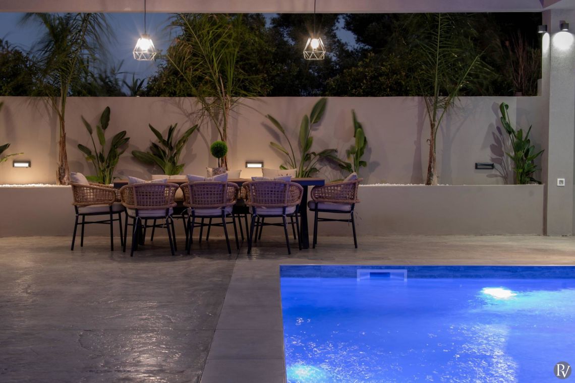 Surrounding the pool are comfortable daybeds and bean bags, along with a shaded pergola and outdoor dining area — perfect for relaxed al fresco meals. The property is fully enclosed and offers private parking for up to three vehicles, while still being just a short stroll from Alykes’ long sandy beach and vibrant local amenities.