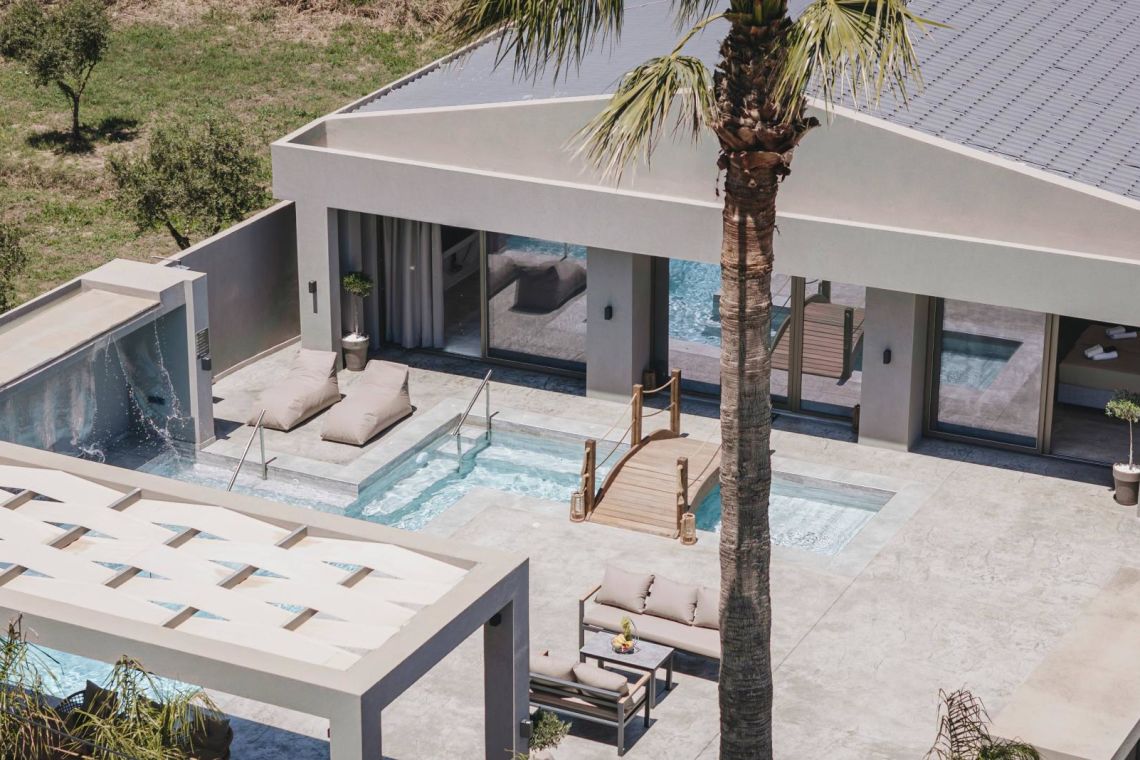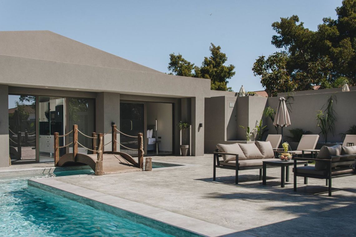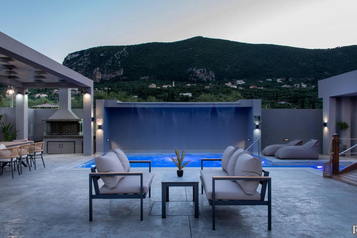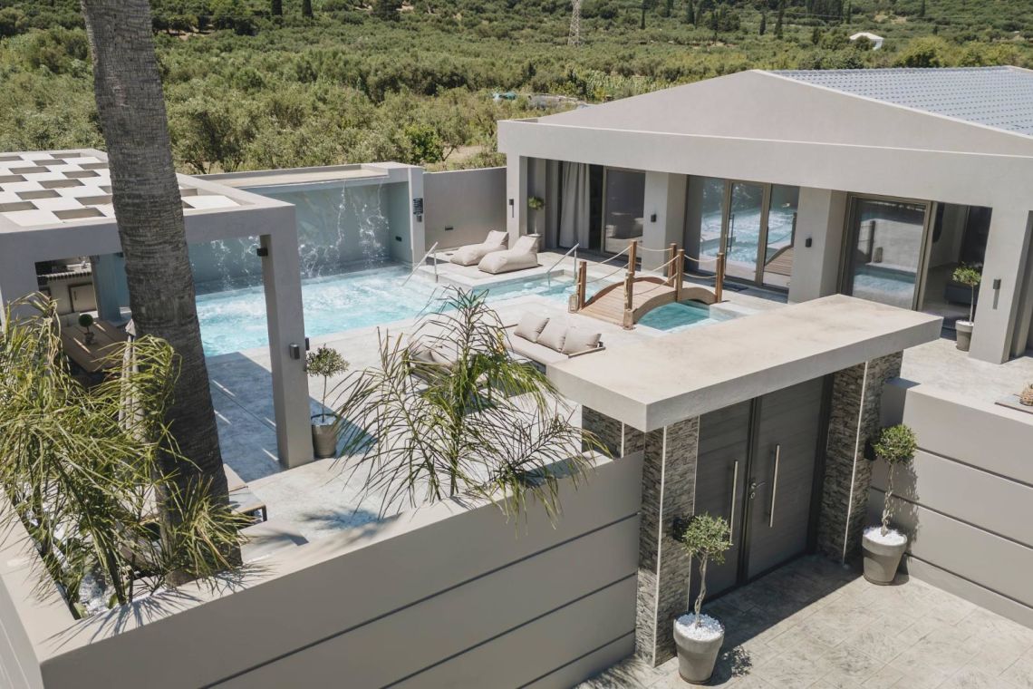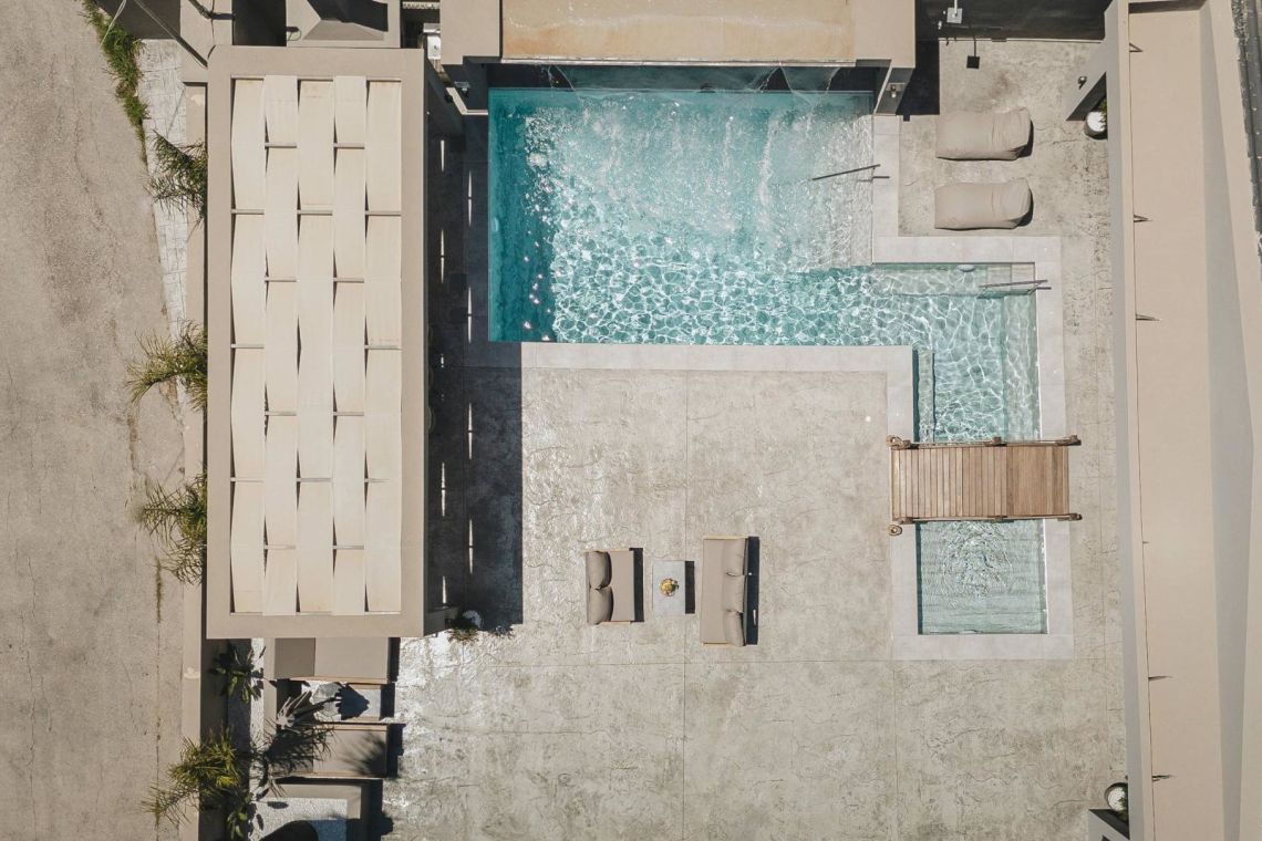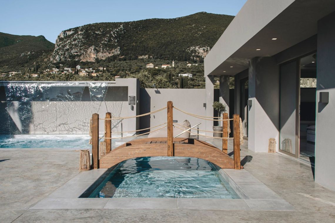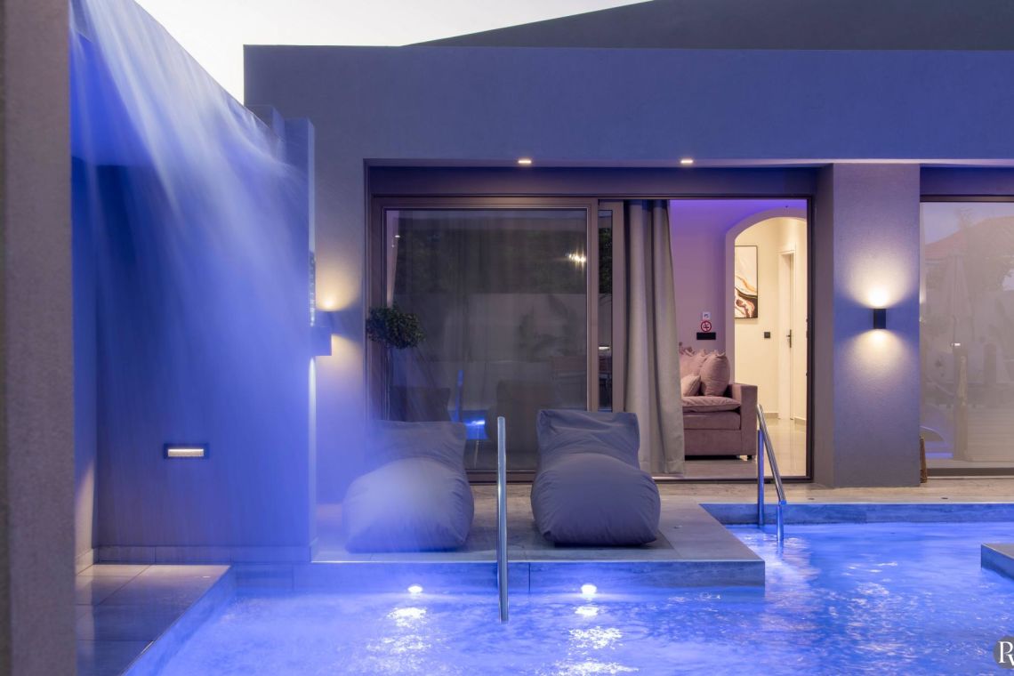 The outdoor area is a true highlight of Villa Jovie. The private swimming pool features a cascading waterfall, built-in hydromassage jets, and soft ambient lighting that creates a tranquil atmosphere in the evenings. A charming wooden footbridge adds character and uniqueness to the space.