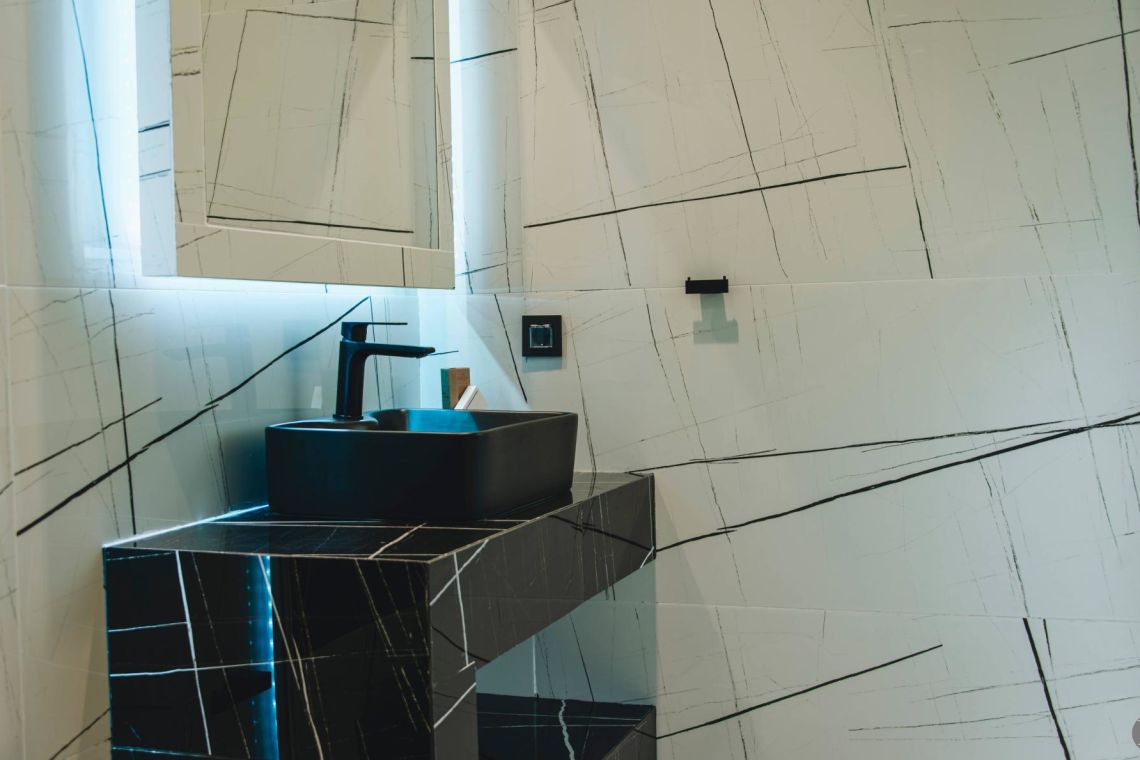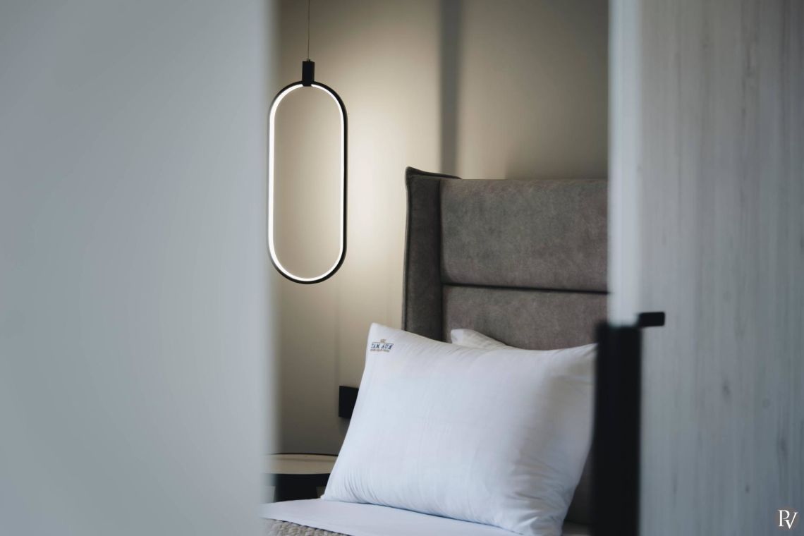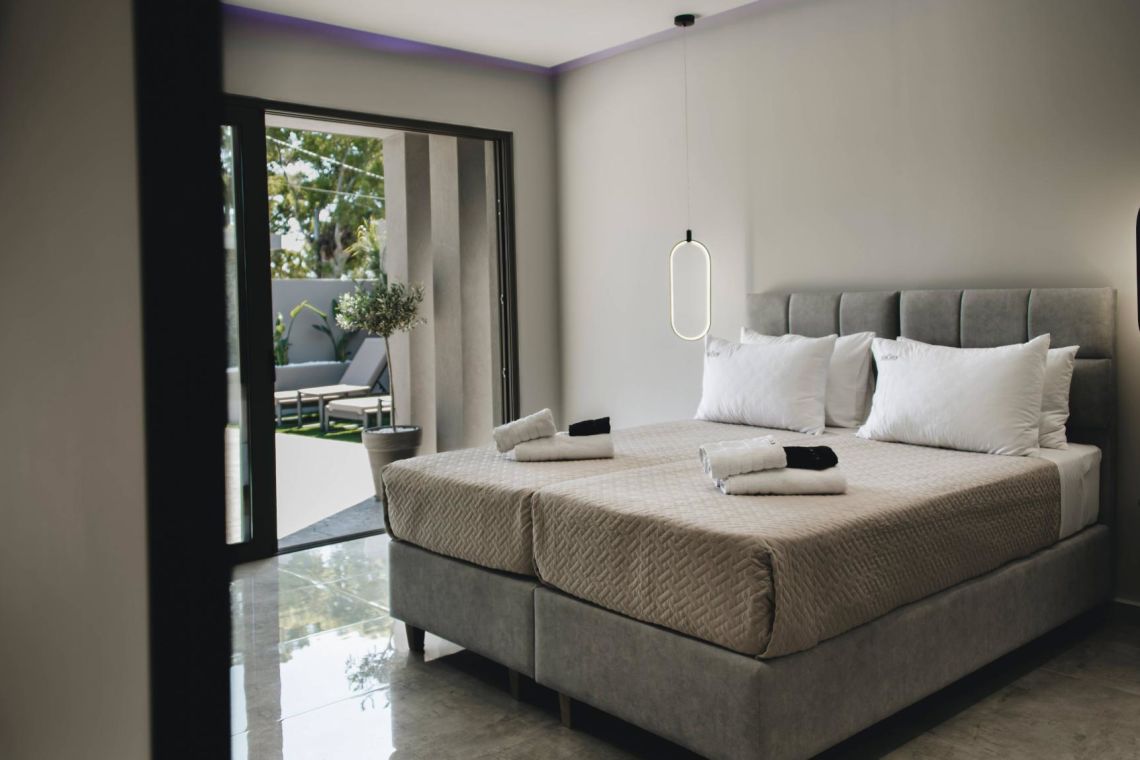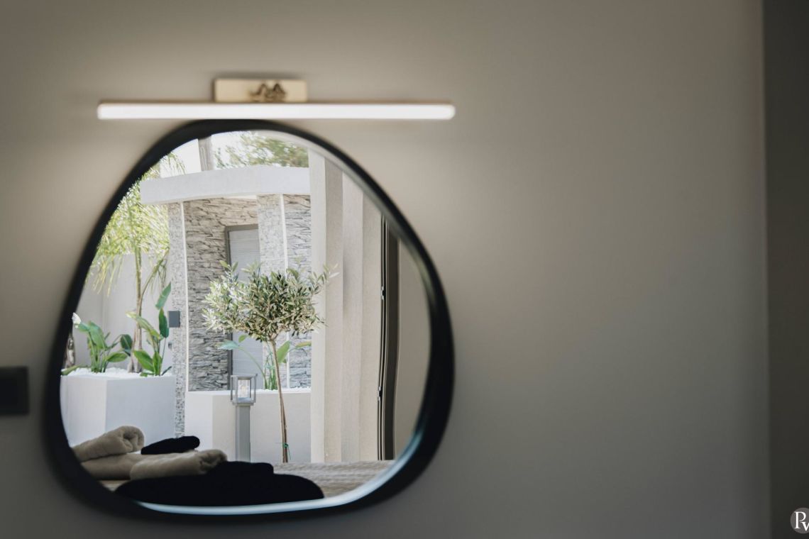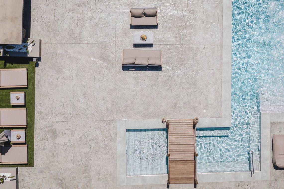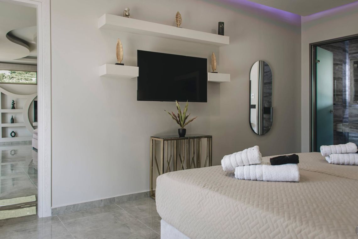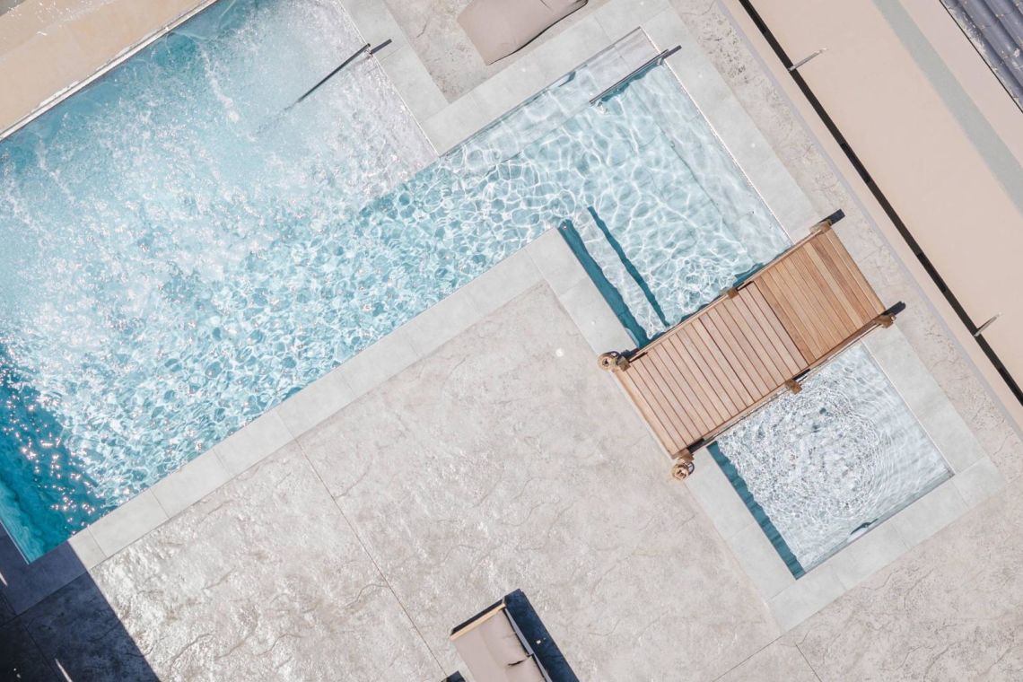 The outdoor area is a true highlight of Villa Jovie. The private swimming pool features a cascading waterfall, built-in hydromassage jets, and soft ambient lighting that creates a tranquil atmosphere in the evenings. A charming wooden footbridge adds character and uniqueness to the space.