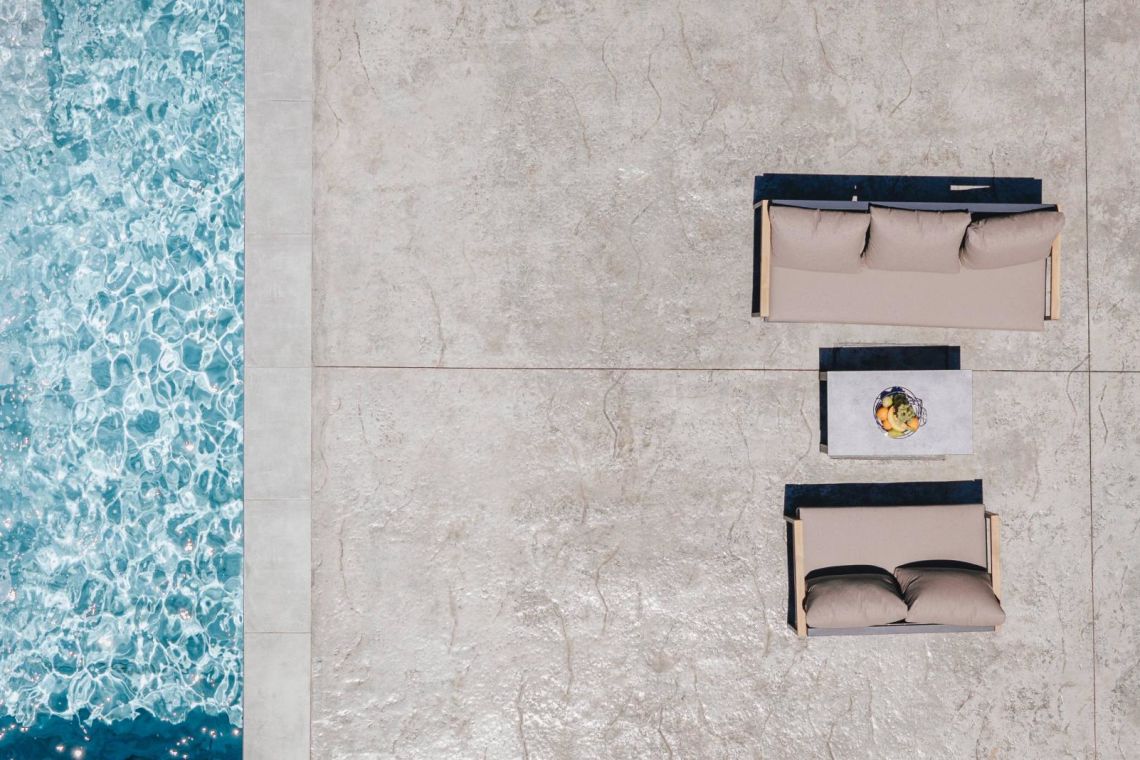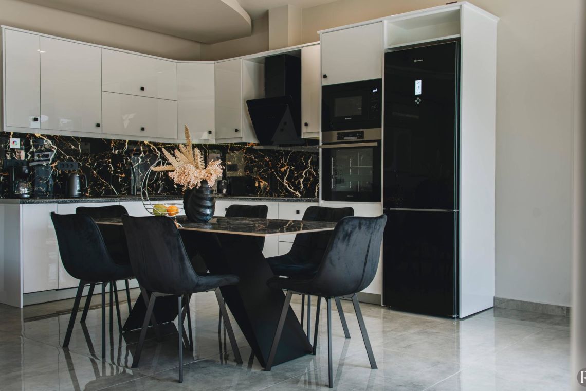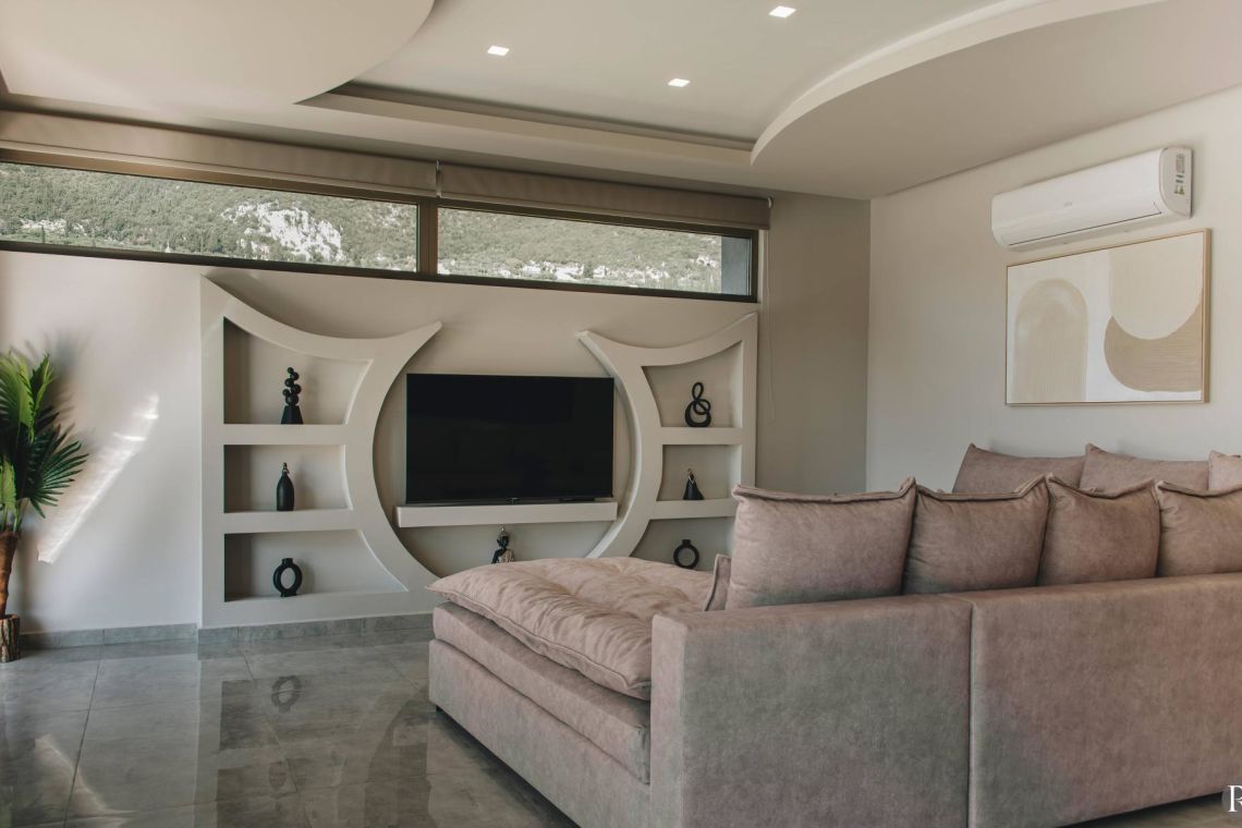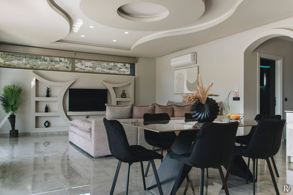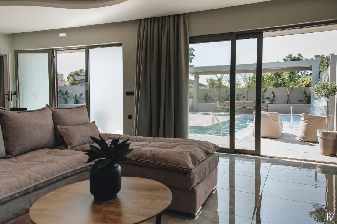 The villa’s open-plan living area is bright, welcoming, and thoughtfully designed. Large sliding doors flood the interiors with natural light and open directly onto the pool terrace, creating a seamless indoor-outdoor flow. A plush corner sofa and warm, earthy décor set a cosy tone for relaxing evenings.