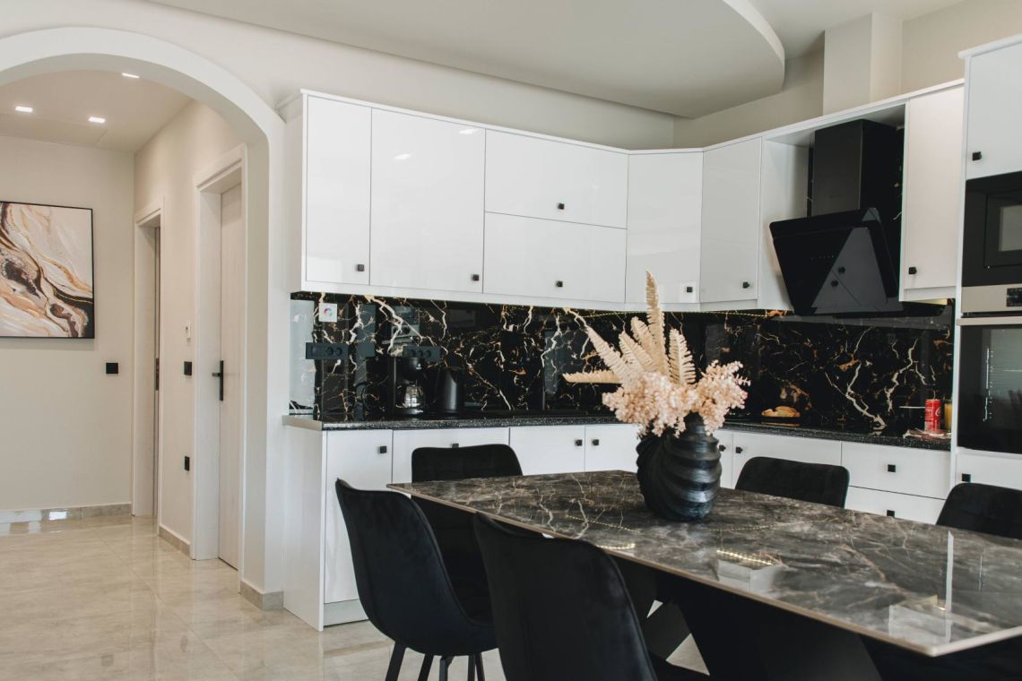 The fully equipped kitchen includes a Nespresso coffee machine, microwave, oven, stovetop, fridge-freezer, and all essential appliances, making it ideal for everything from casual breakfasts to leisurely dinners. Smart TVs in the living room and each bedroom provide entertainment after a day in the sun. An additional guest WC adds extra convenience for families or groups.